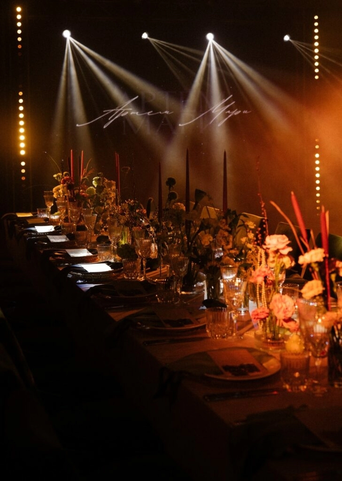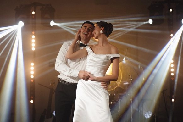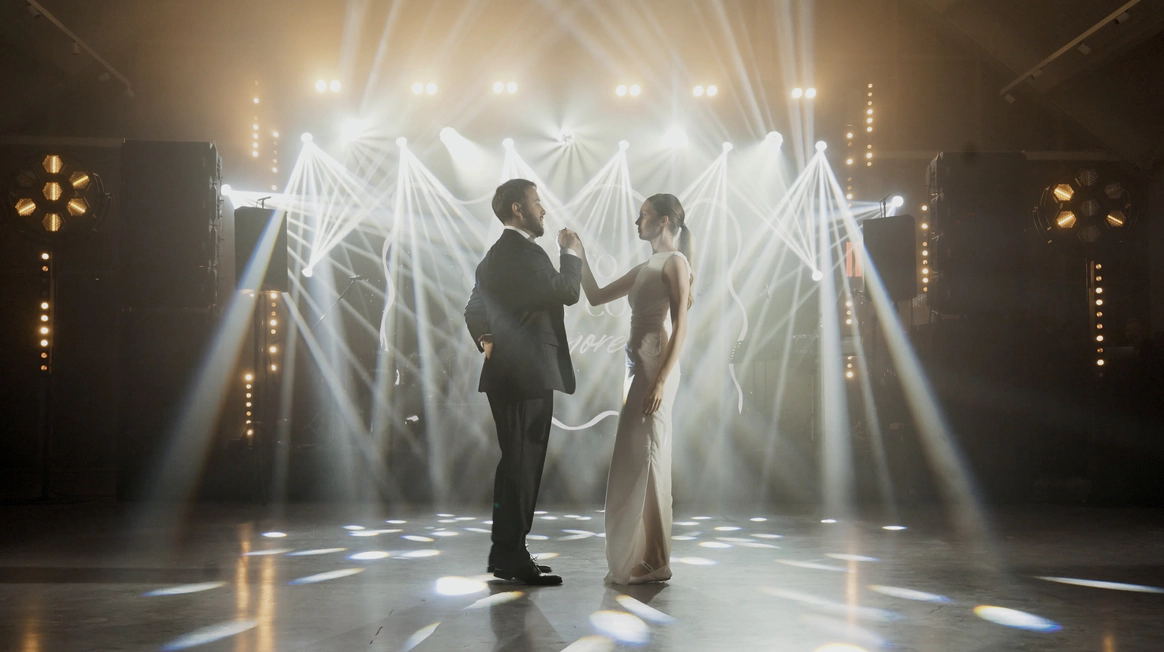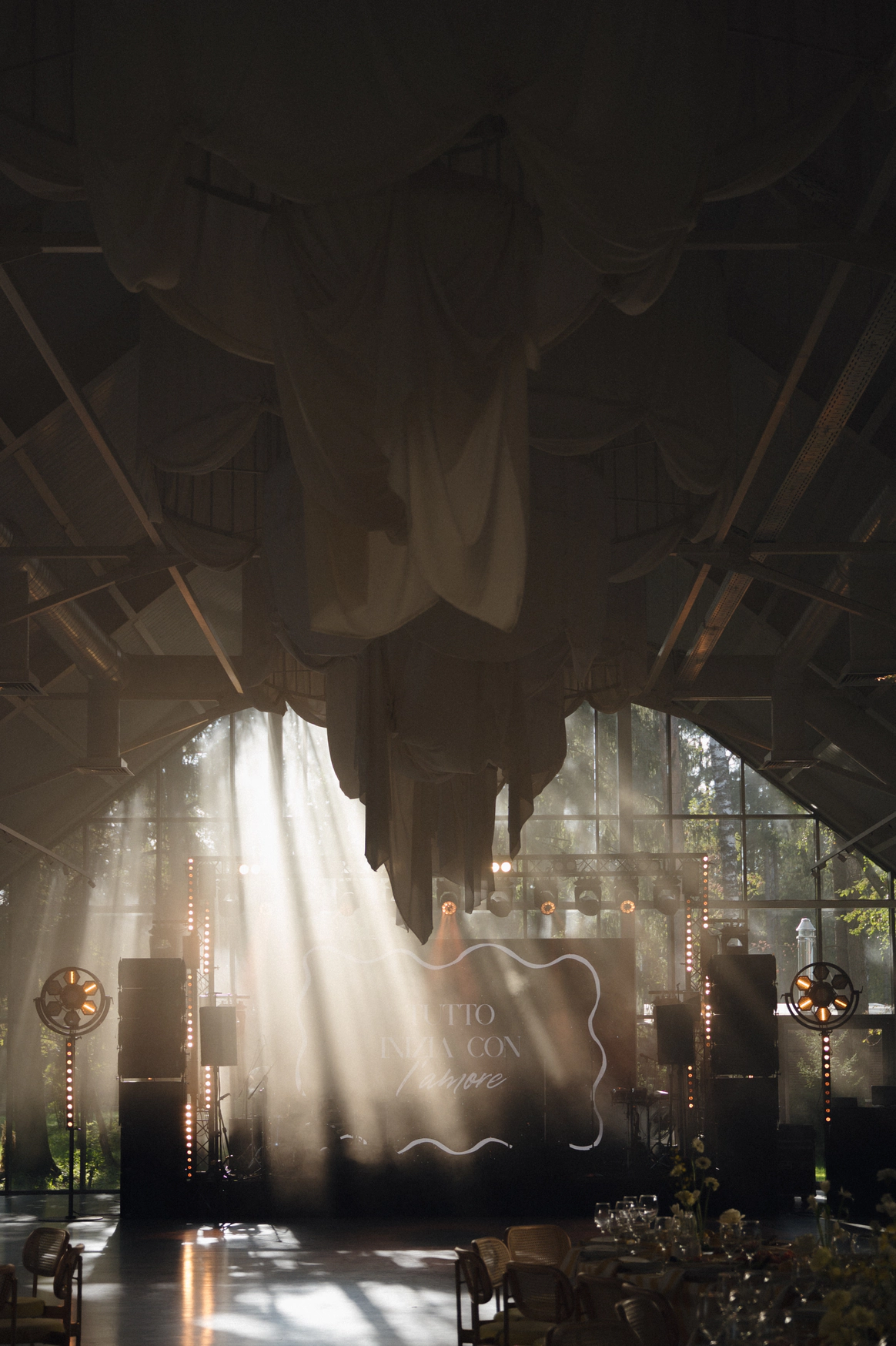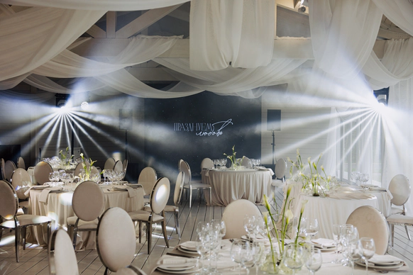 За 1 месяц до свадьбы пришлось полностью переформировать техническую застройку из-за сокращения бюджета. Мы поменяли расположение сцены и столов, что дало возможность отказаться от стационарного светодиодного экрана, подиума для группы и оптимизировать сетап светового оформления сцены.
