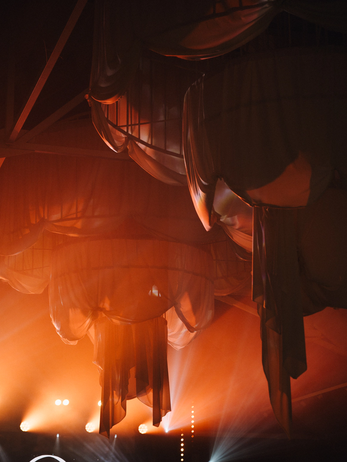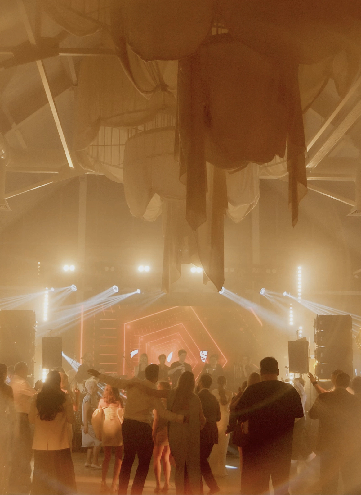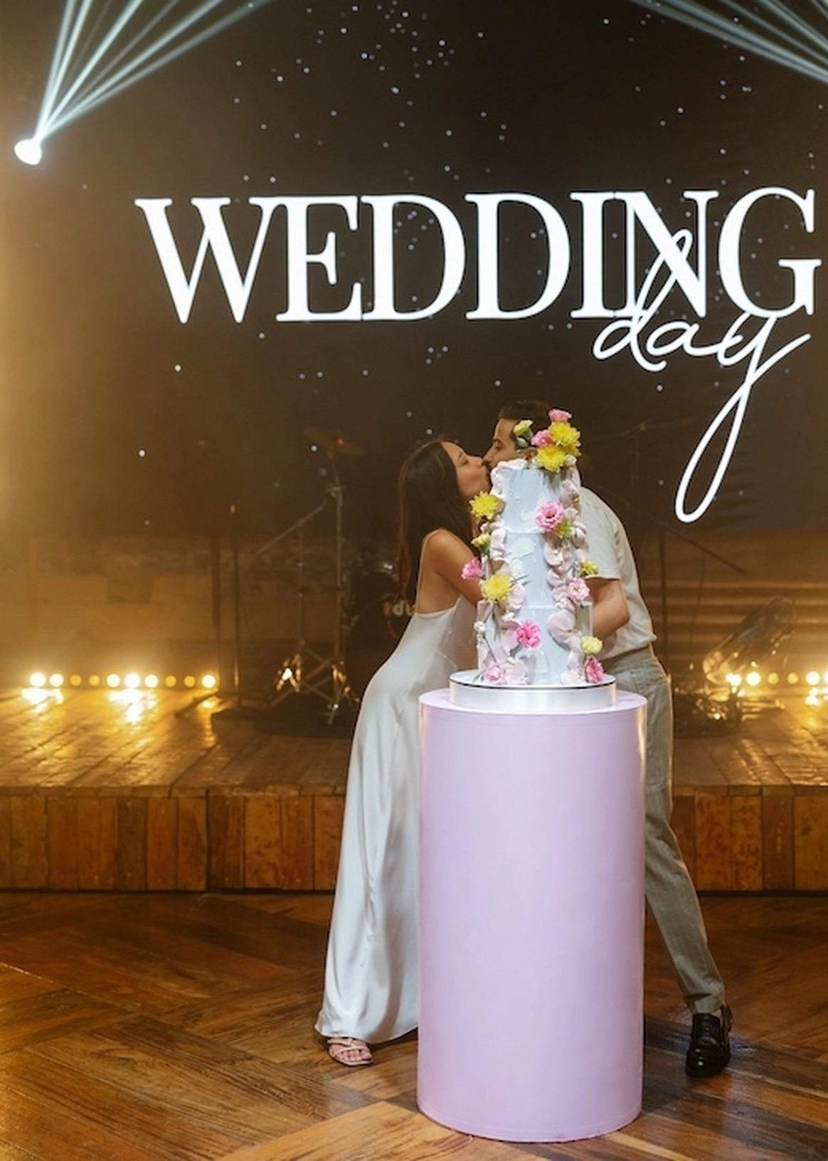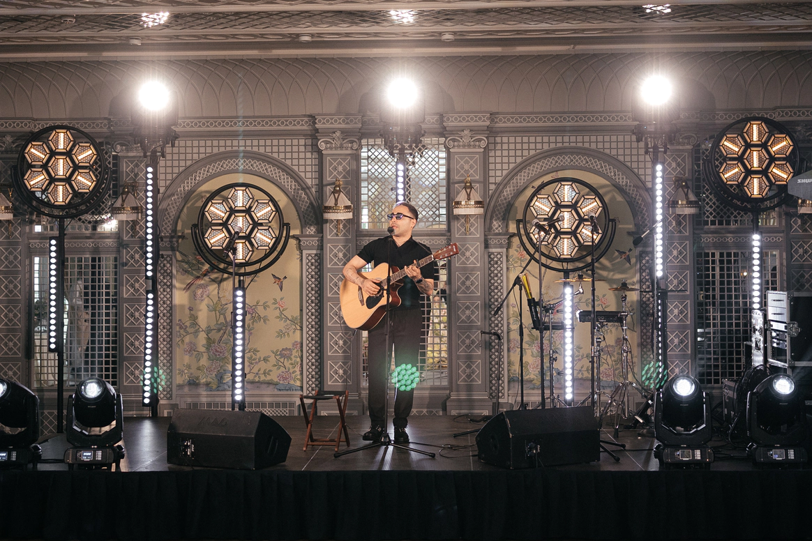 За 1 месяц до свадьбы пришлось полностью переформировать техническую застройку из-за сокращения бюджета. Мы поменяли расположение сцены и столов, что дало возможность отказаться от стационарного светодиодного экрана, подиума для группы и оптимизировать сетап светового оформления сцены.