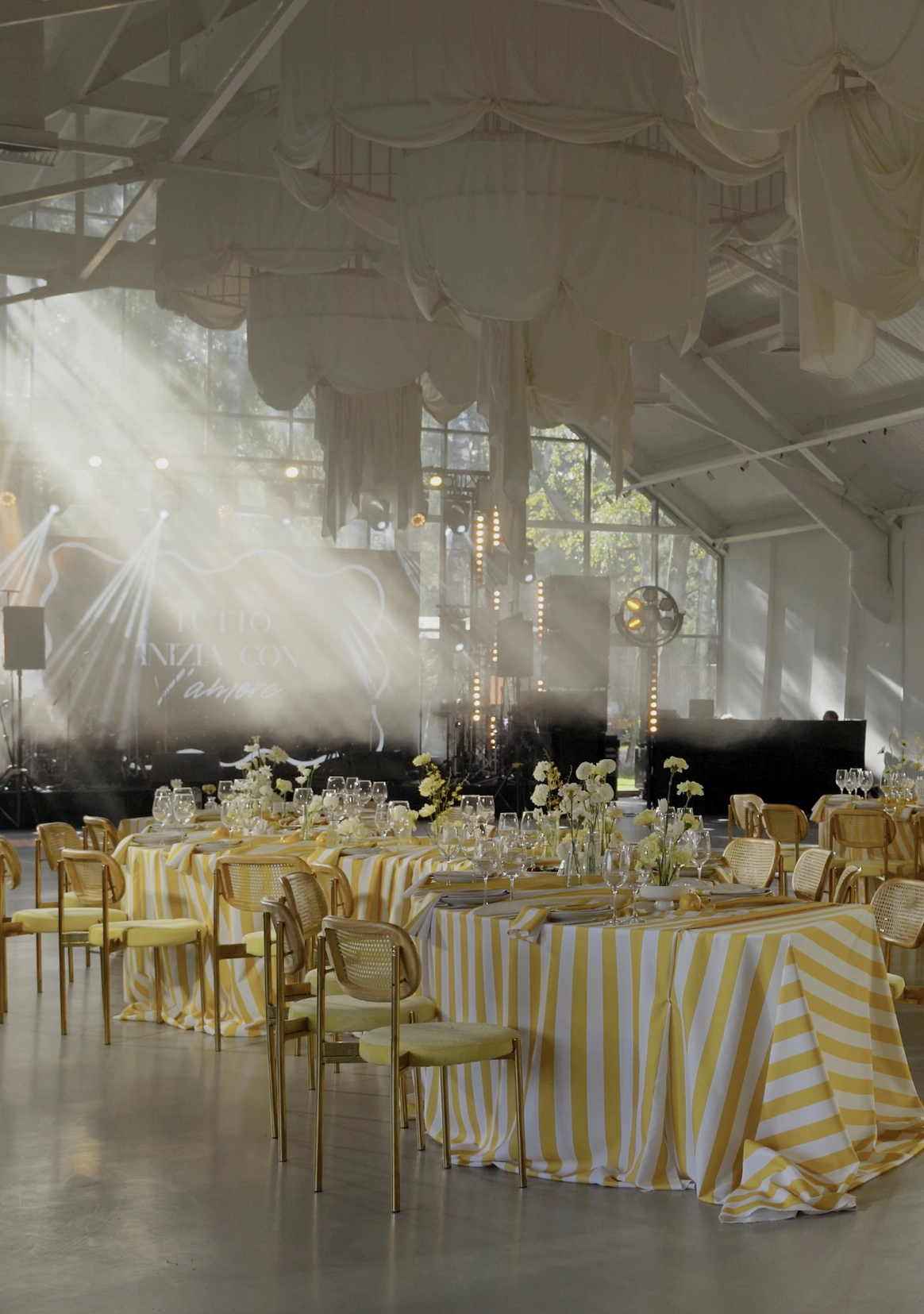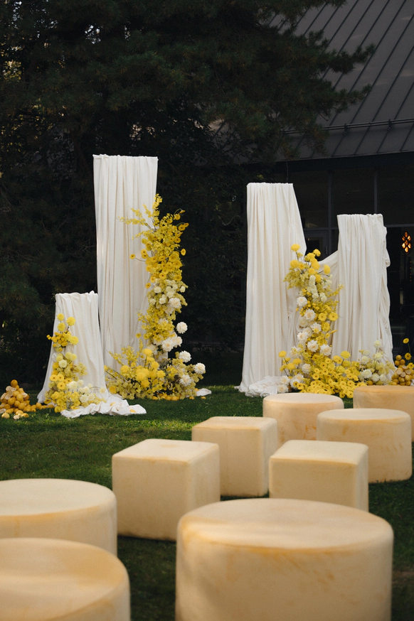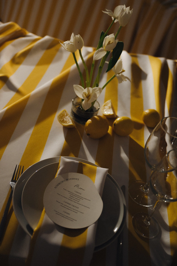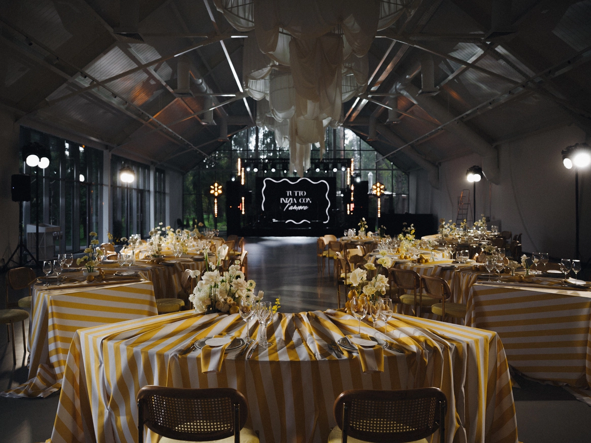 Любовь к лазанье и пасте, спонтанная поездка в Италию, любимый желтый цвет невесты стали бесспорными аргументами при выборе концепции свадьбы. Типичная итальянская вечеринка с лимонами- а почему бы и да! Сочная, яркая, освежающая, чтобы продлить ощущение лета. Добавили полосатый принт, интересную рассадку, объемные тканевые люстры для заполнения пространства, поработали с интерактивными зонами - и вуаля, еще одна крутая свадьба в копилку!