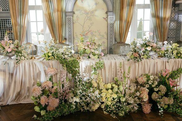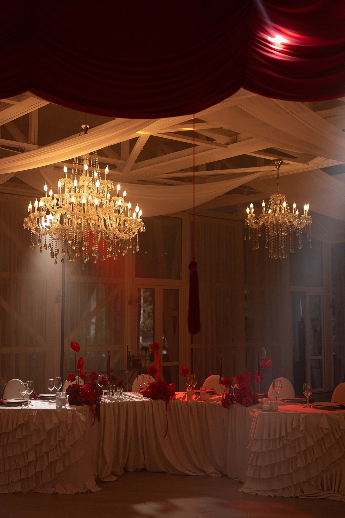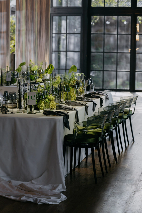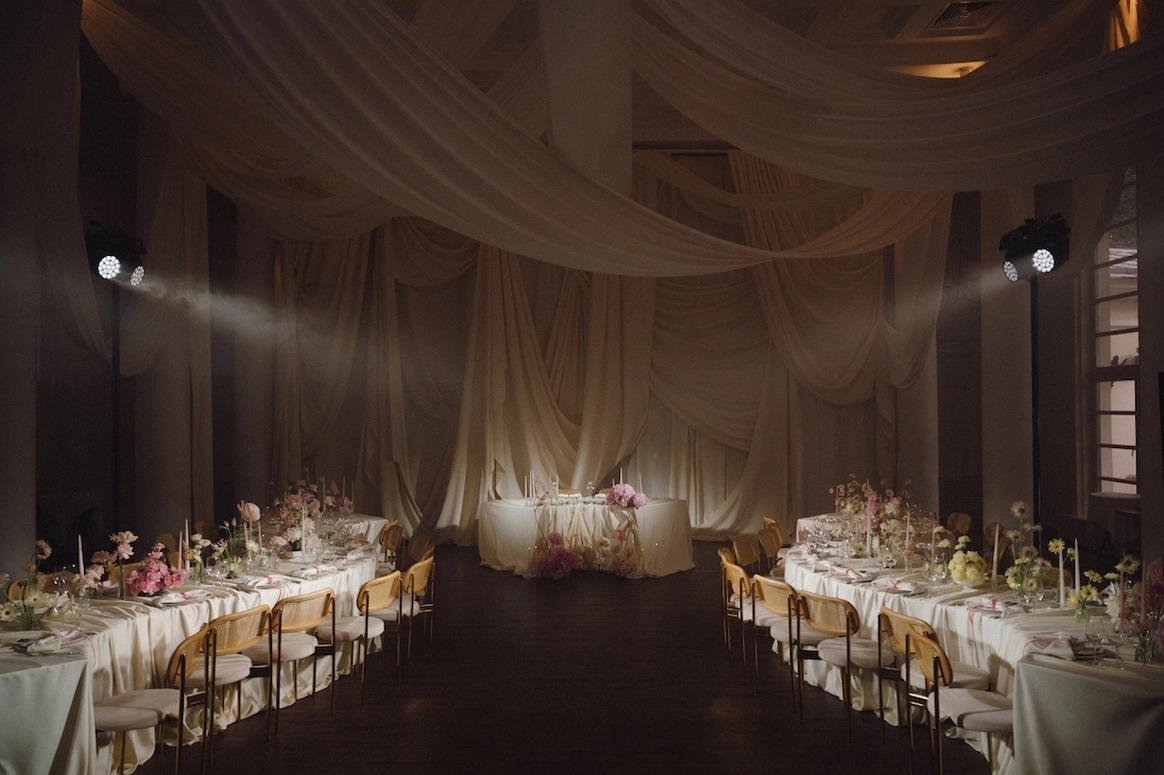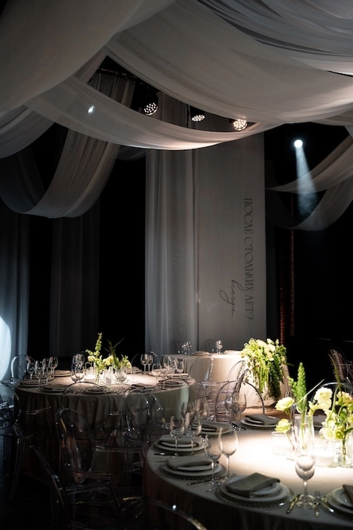 За месяц до свадьбы из 70 ожидаемых гостей подтвердились только 50, из-за чего пришлось переформировать схему рассадки гостей. Рассадка в две линии с дополнительными ответвлениями столов позволила не только заполнить большое пространство зала, но и добавить оригинальных форм в концепт декора