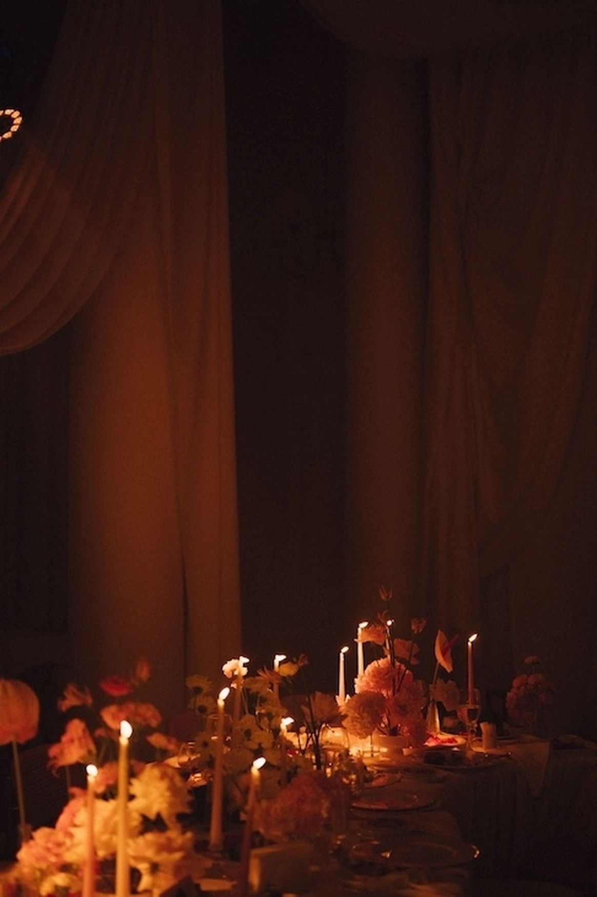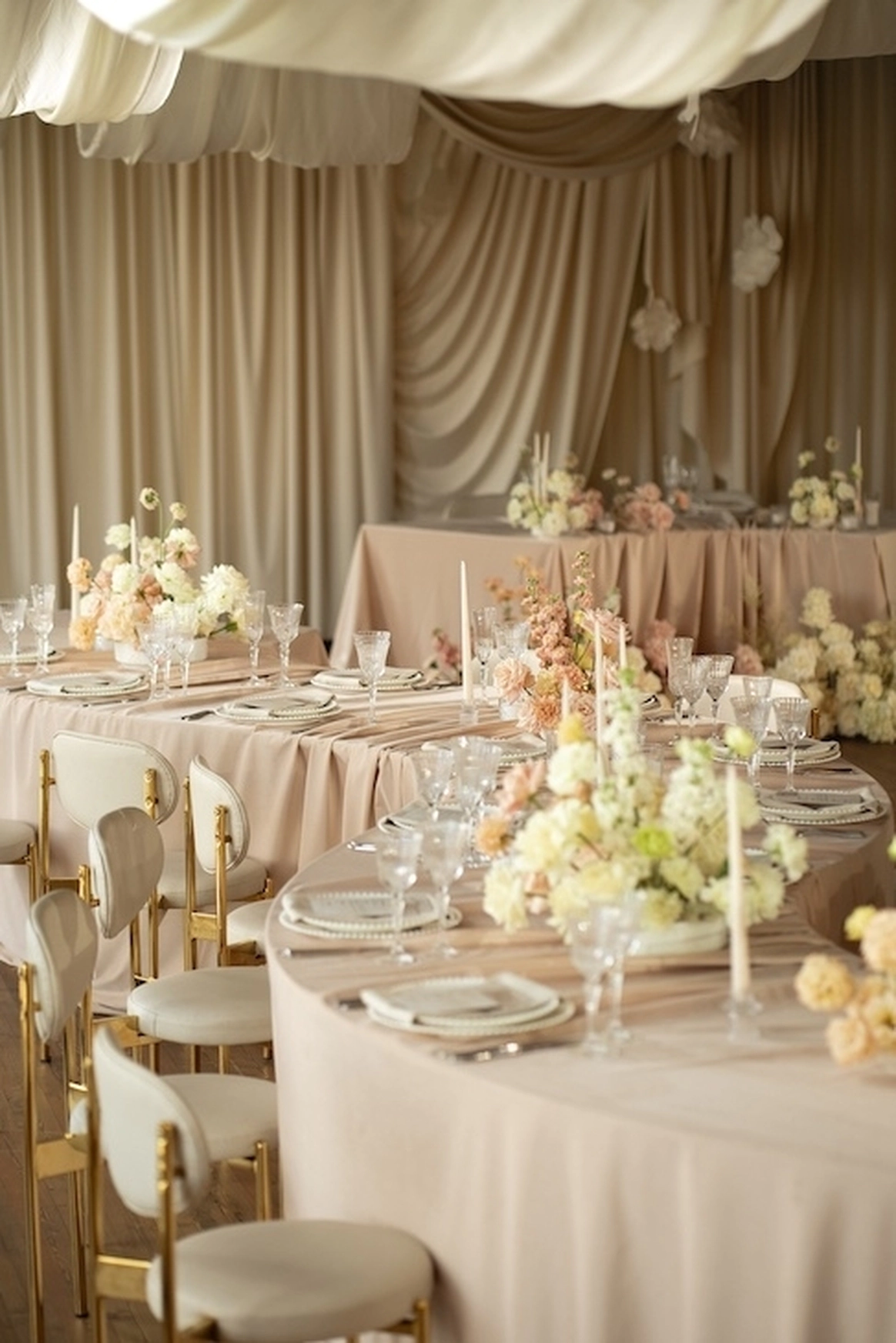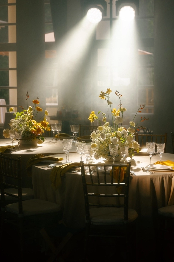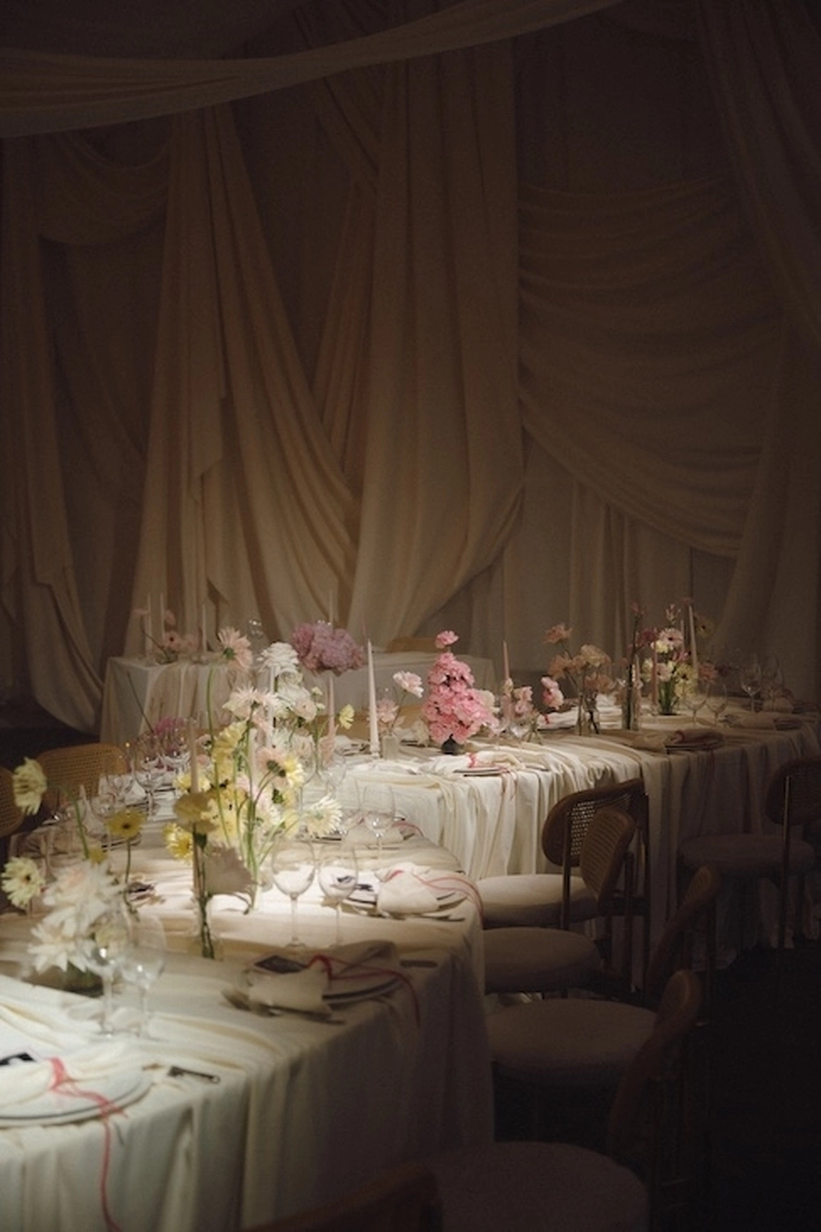За месяц до свадьбы из 70 ожидаемых гостей подтвердились только 50, из-за чего пришлось переформировать схему рассадки гостей. Рассадка в две линии с дополнительными ответвлениями столов позволила не только заполнить большое пространство зала, но и добавить оригинальных форм в концепт декора