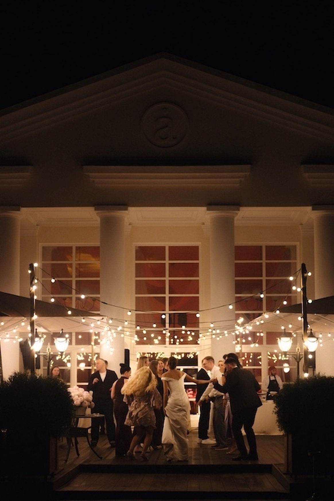 После церемонии гости переместились в зал, где прошла первая часть вечера с классическими поздравлениями и вкусной едой. А через пару часов начался настоящий отрыв на улице под хиты от диджея. Вечеринка дополнилась выступлением кавер-группы, фуд-станциями и уютными лаундж зонами, где можно было просто посидеть поболтать. За счет грамотного зонирования все гости смогли найти для себя комфортный вариант проведения вечера.