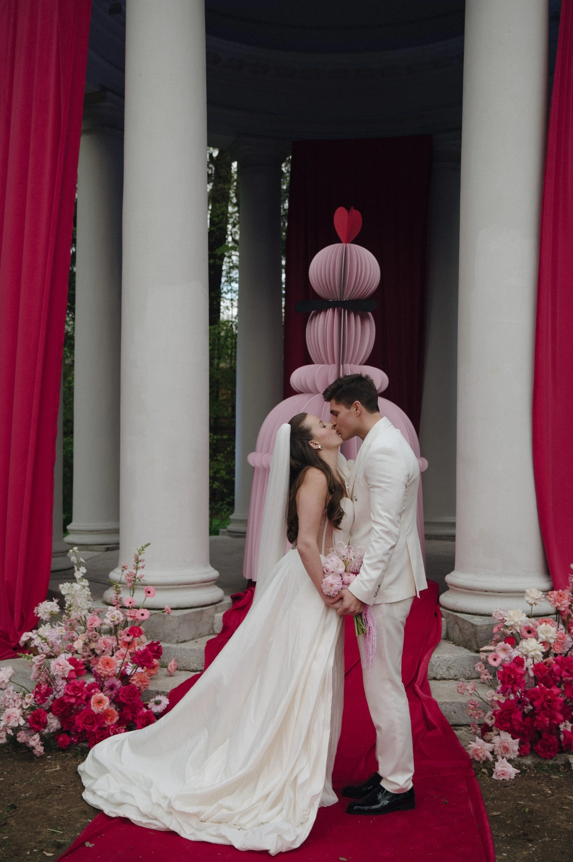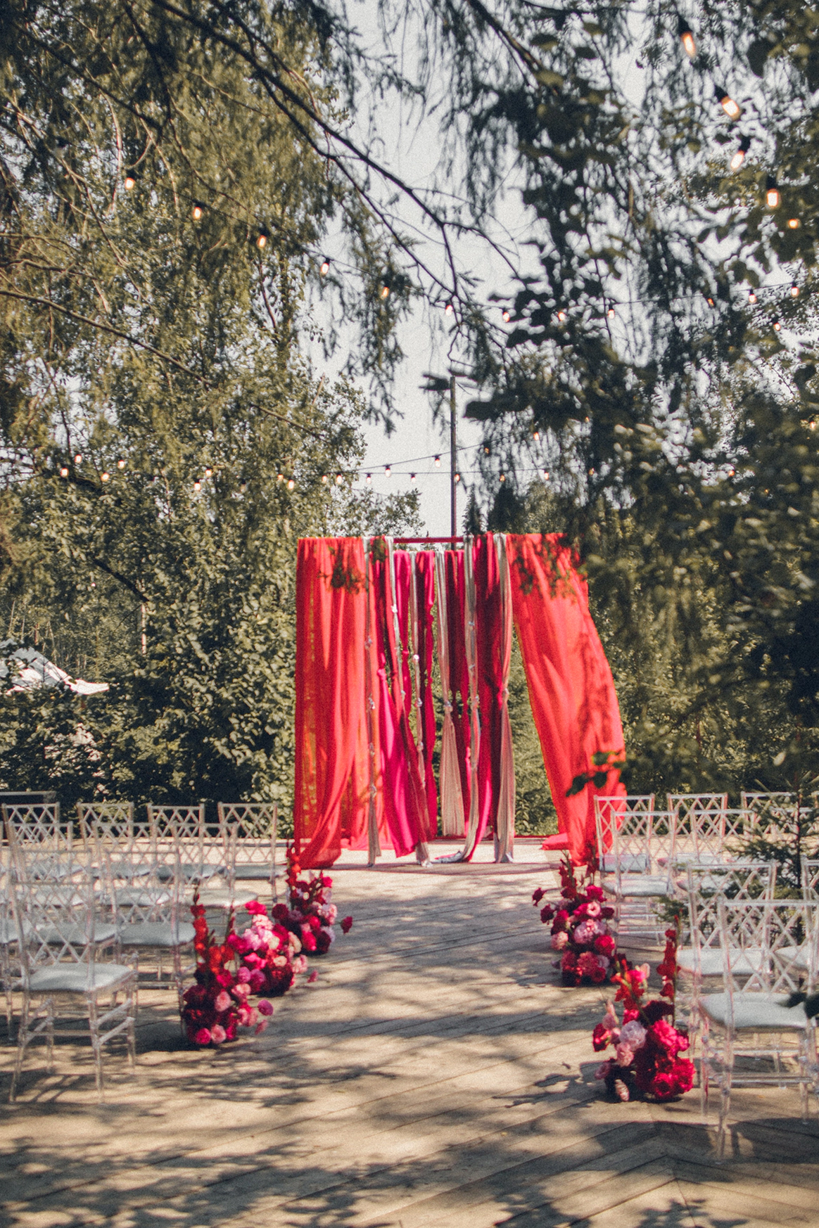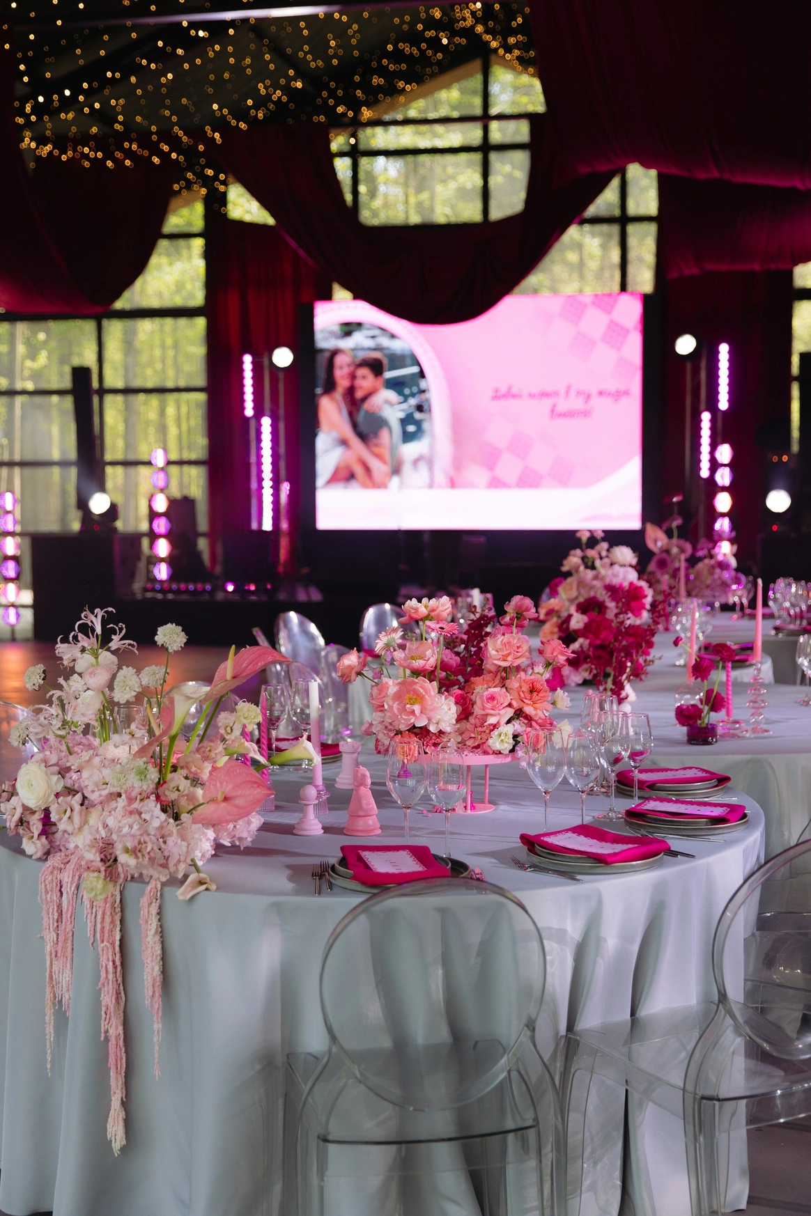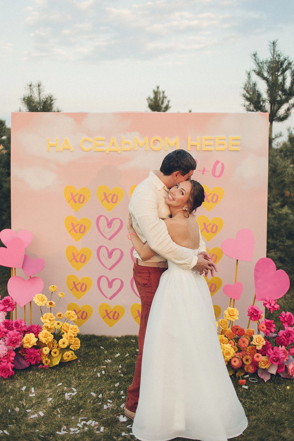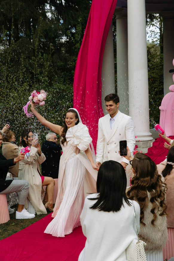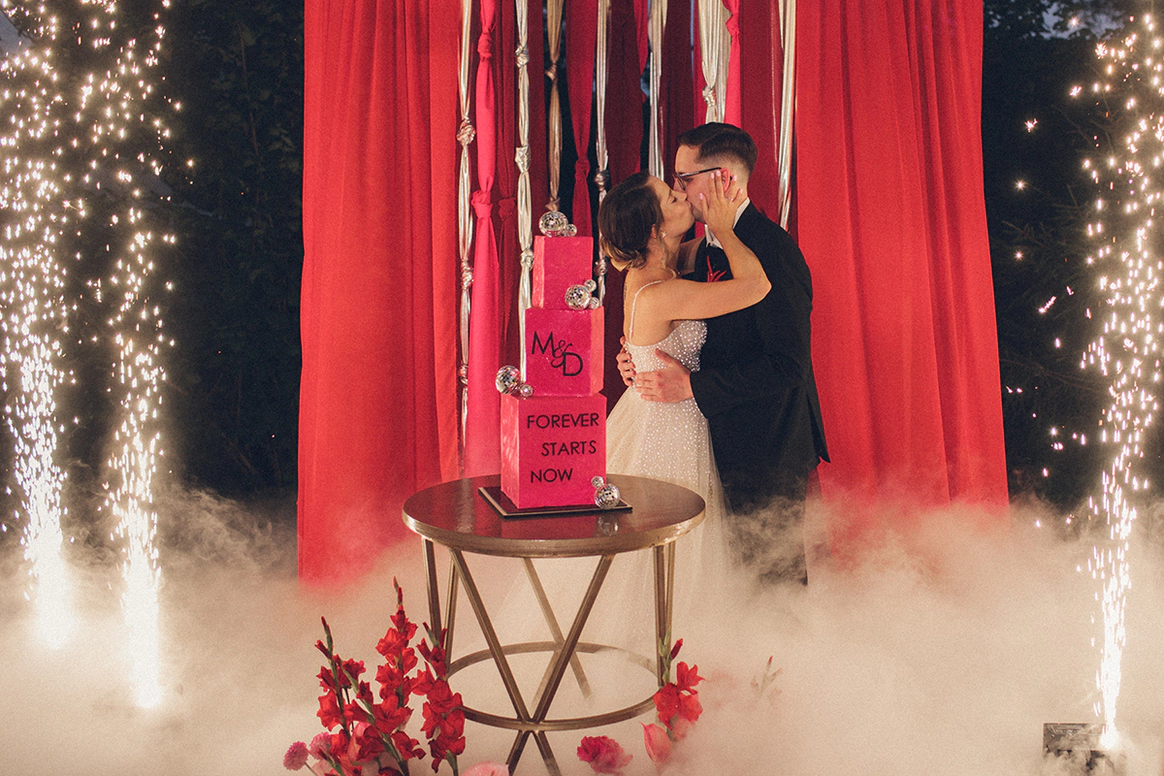 Алина мечтала о яркой свадьбе, поэтому главным оттенком оформления стала сочная фуксия!