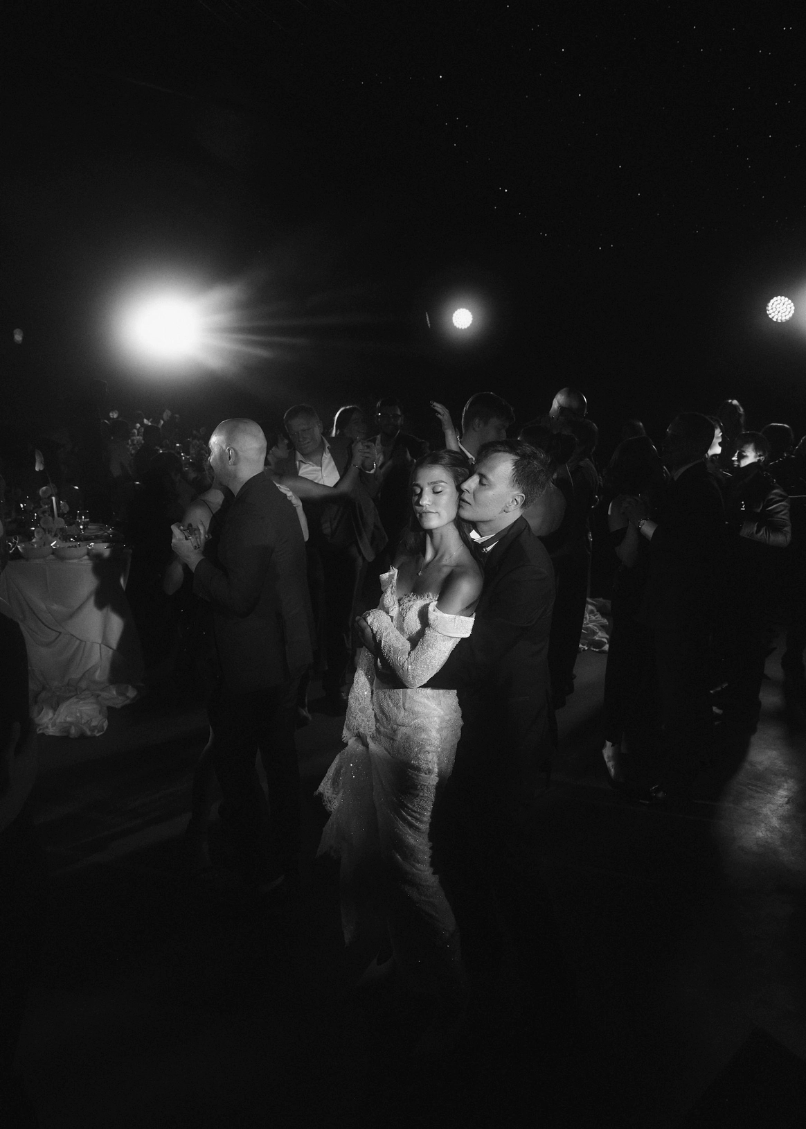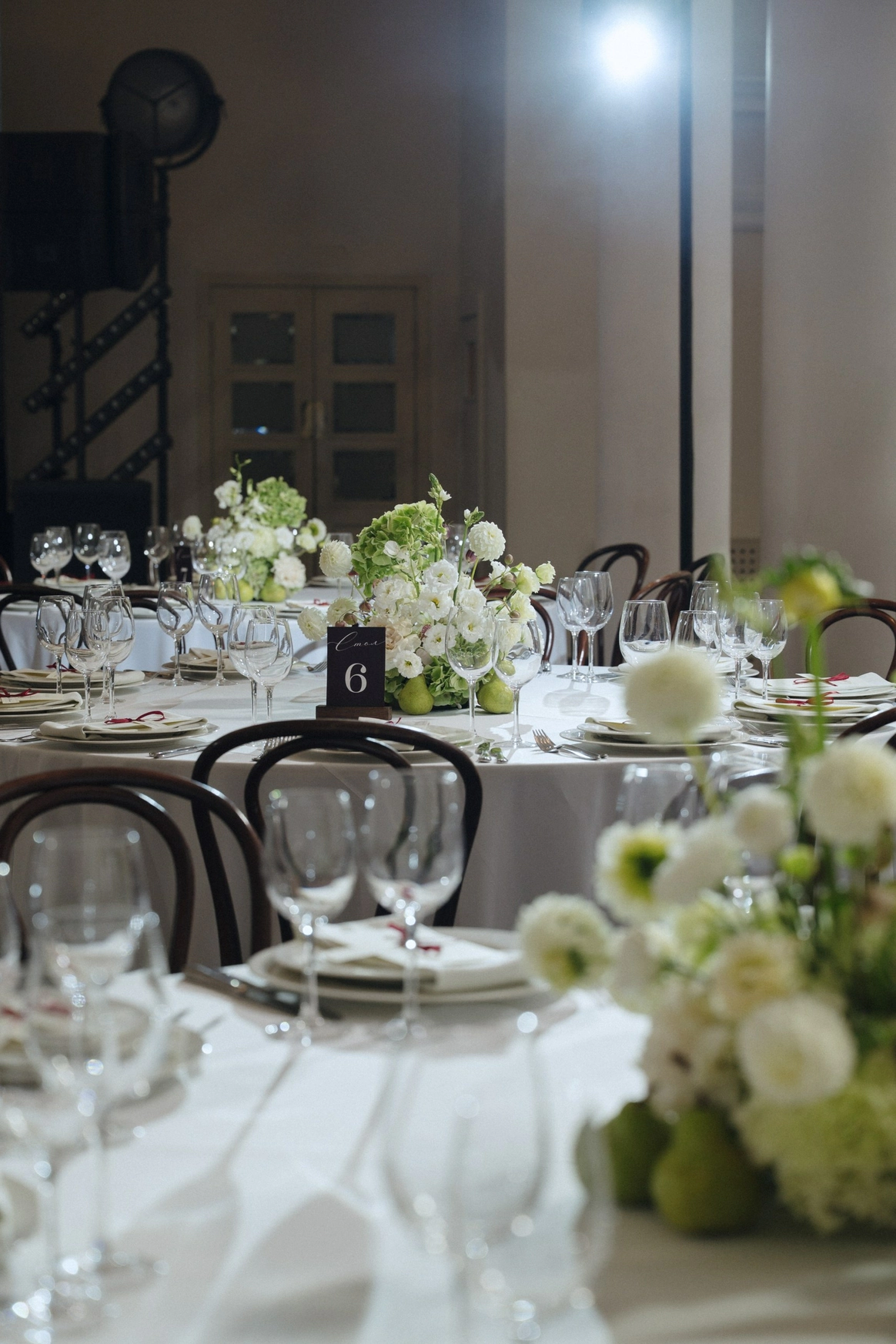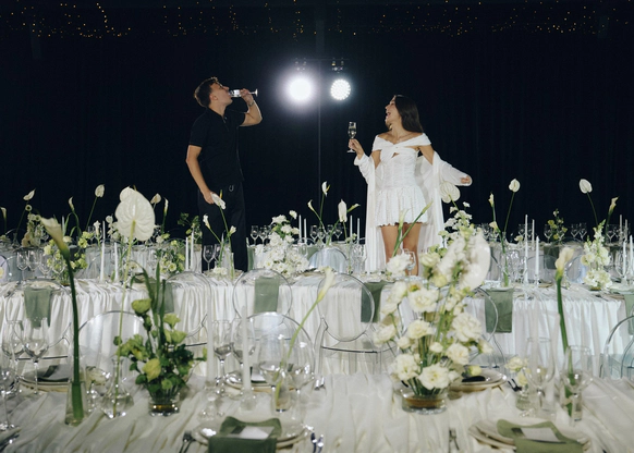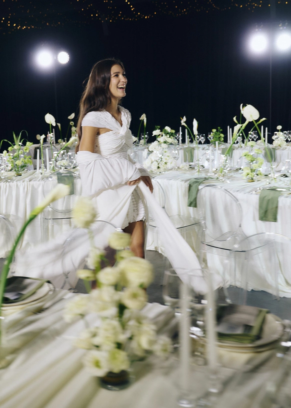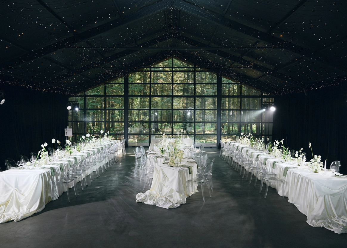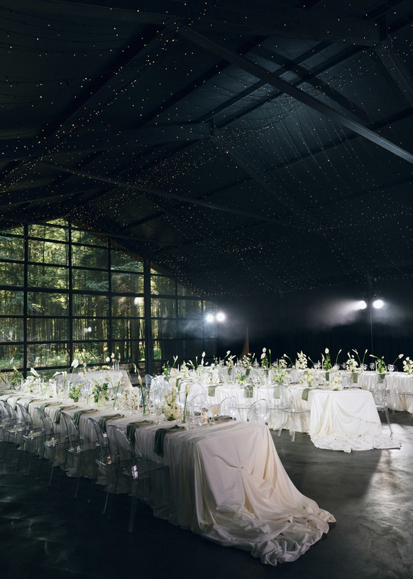 Белоснежные скатерти и цветы сыграли на контрасте с чёрными стенами и потолком, стали точкой притяжения, ведь нам важно было объединить 80 гостей и превратить большую свадьбу в уютный и душевный праздник