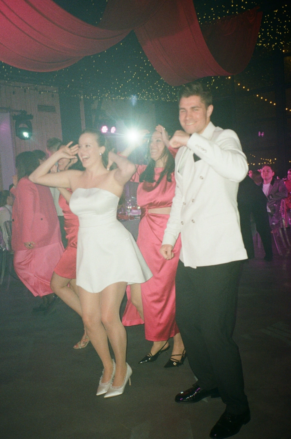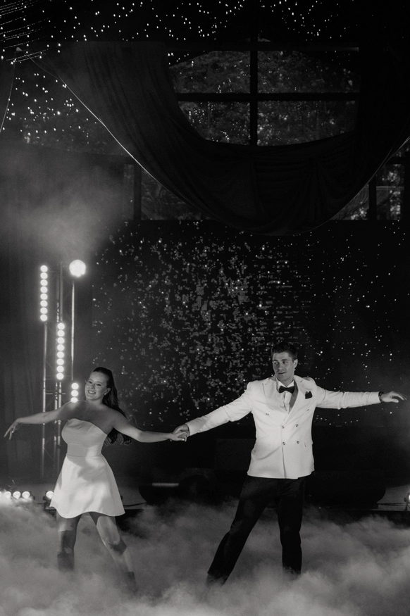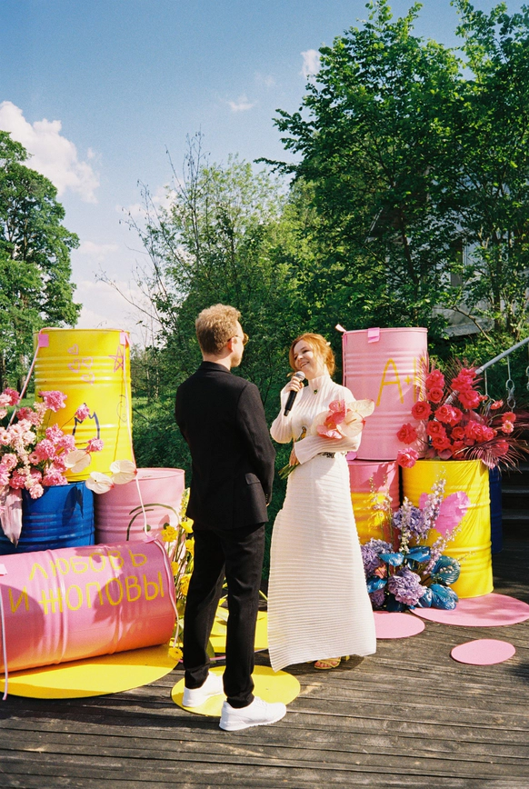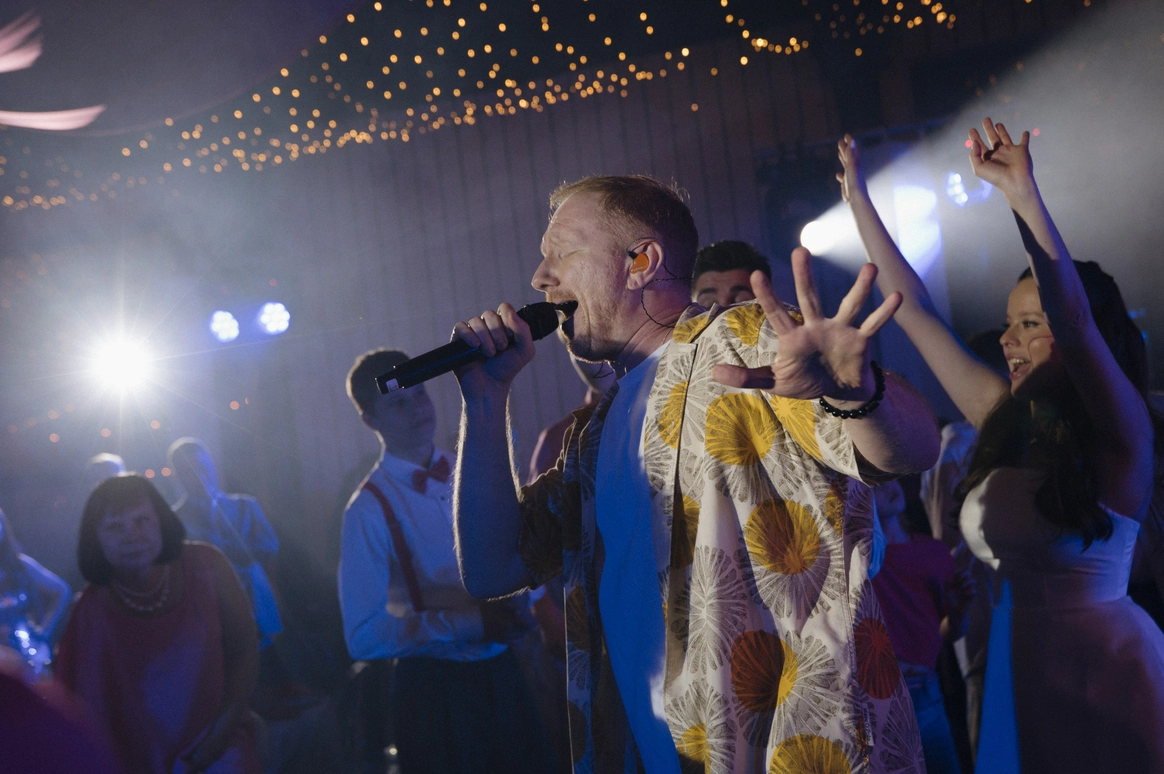 Яркий креативный декор, много музыки и вокала, совместная песня пары с группой Братья Грим и сюрприз для жениха - выступление любимой певицы детства Ангины.