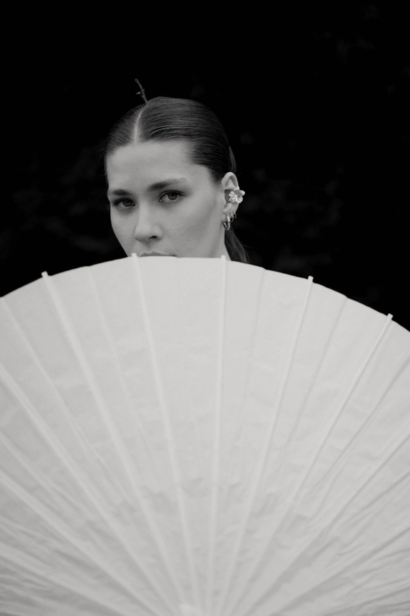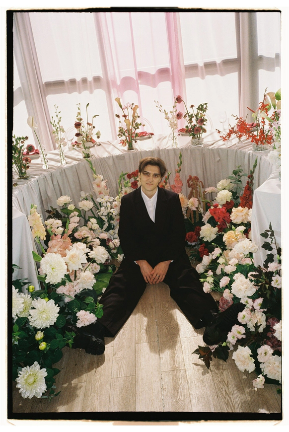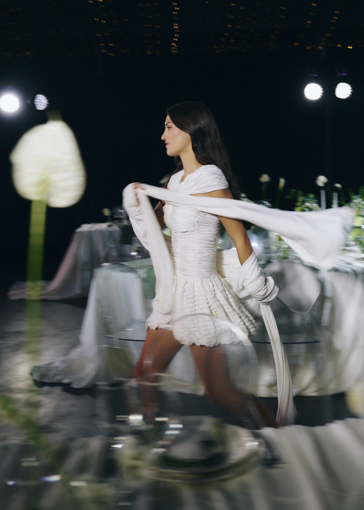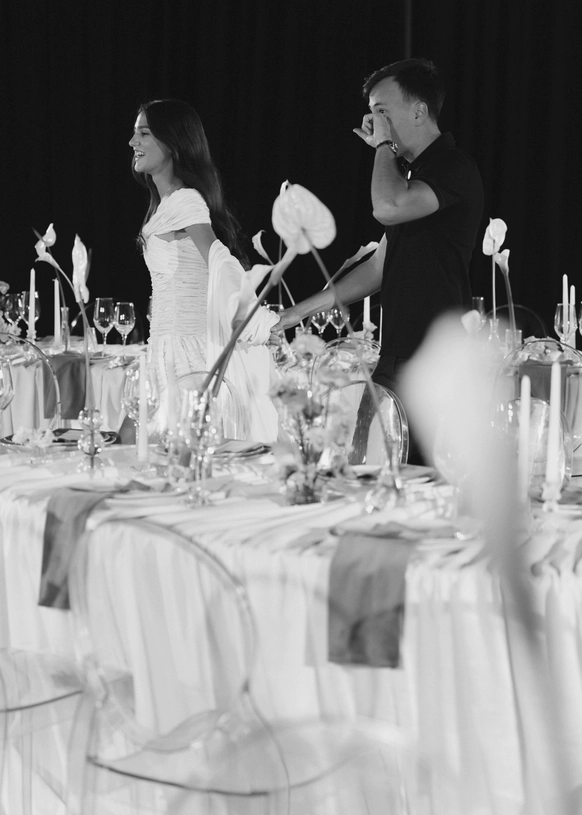 Чтобы сосредоточить внимание на изысканных деталях флористики и сервировки мы задрапировали всю площадку чёрным бархатом, направили свет на гостевые столы, формы которых, в свою очередь, напоминали о рассадке на праздниках старшего поколения, где все вместе за одним столом.