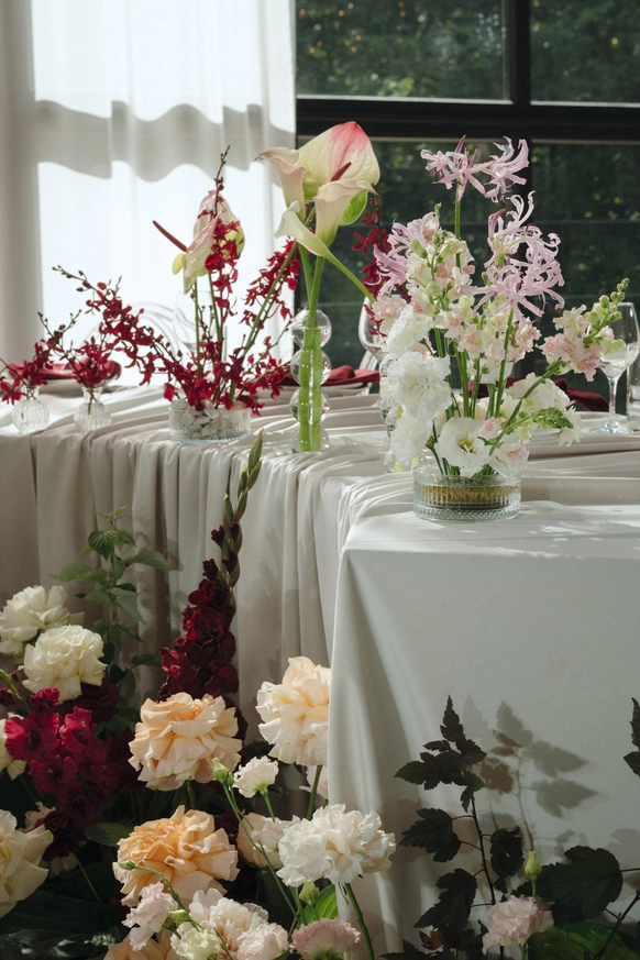 На столы добавили экзотическую флористику, точечную, изысканную, напоминающую икебаны, она же стала и основой для зоны церемонии.