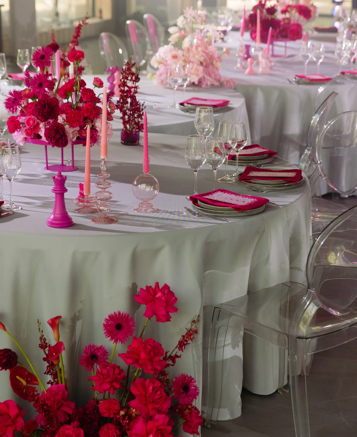 Необычная расстановка столов в виде двух змеек была дополнена шахматными фигурами ручной работы и яркой ароматной флористикой.