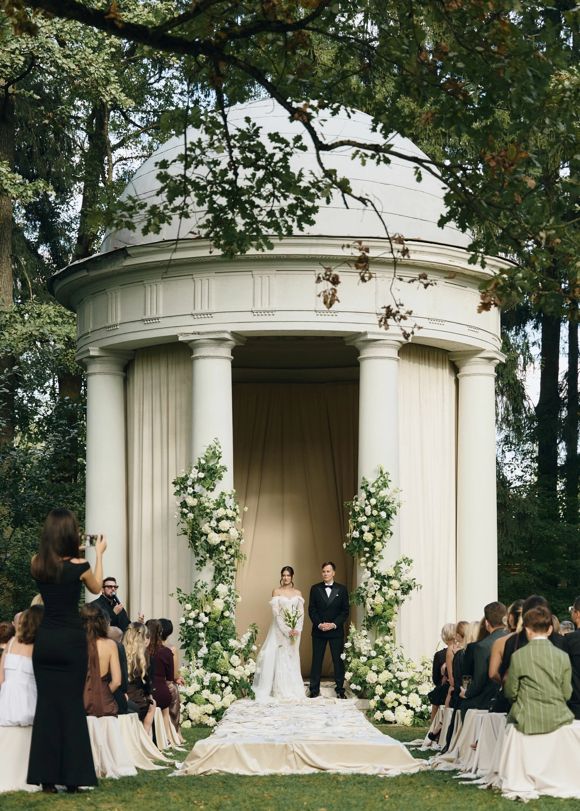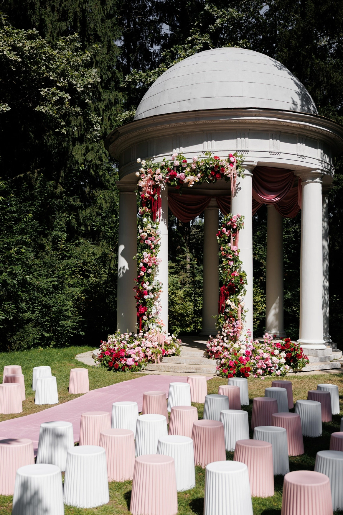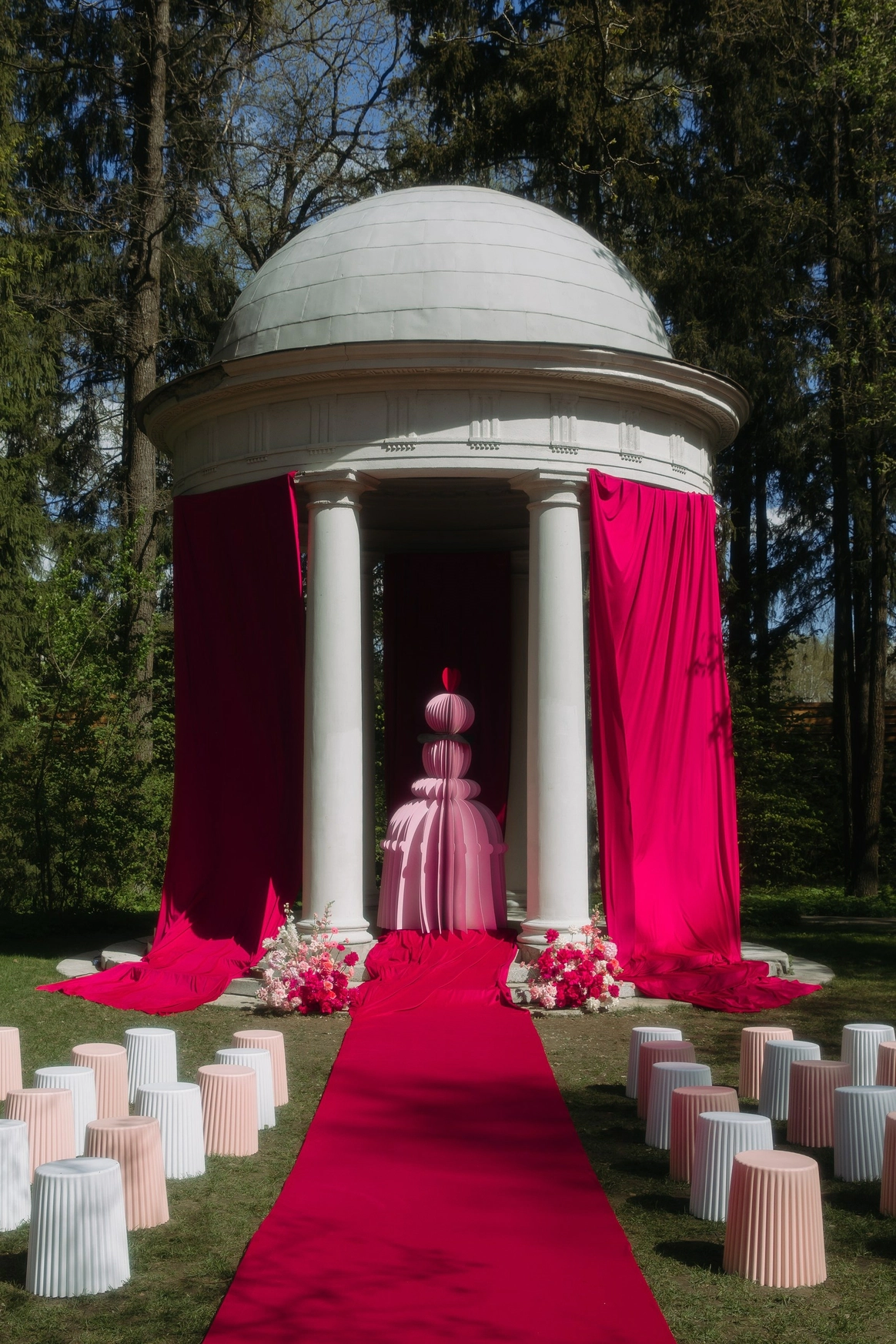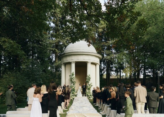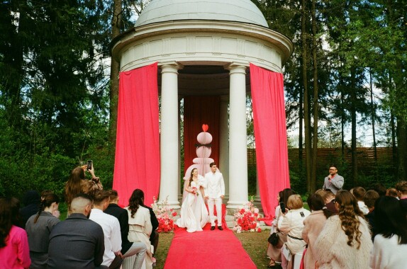 Зону церемонии в исторической ротонде мы украсили живой флористикой, а для гостей вместо стульев установили лавочки, что явилось ещё одной отсылкой к прошлому, к большим деревенским свадьбам, где специально для праздников сколачивали скамейки, чтобы поместились все приглашенные.