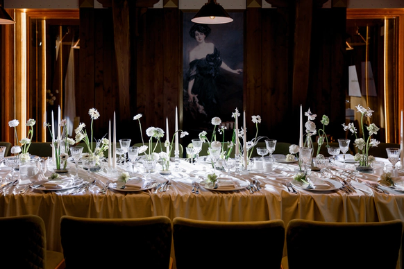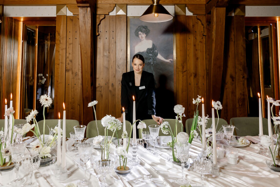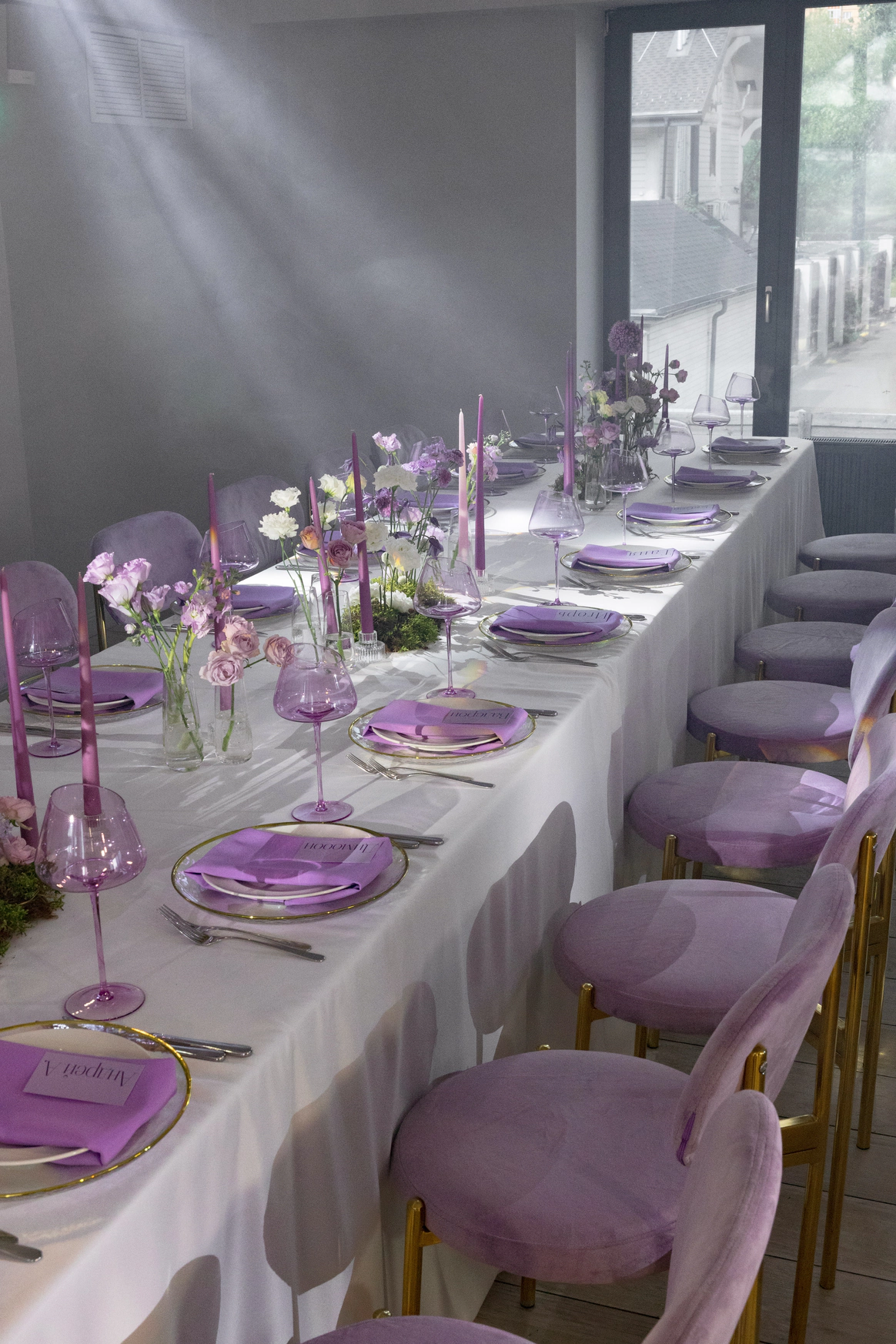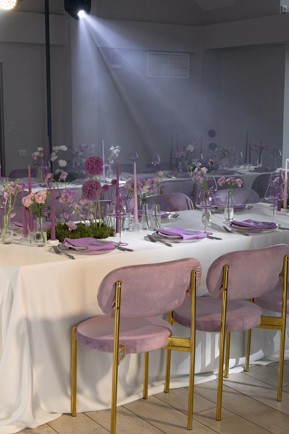 Изначально мы планировали один прямоугольный стол, но при рассадке гостей, Ника и Антон поняли, что хотят сидеть в торце, и мы предложили им овальный стол, где гости даже лучше будут видеть друг друга и пара будет во главе стола.