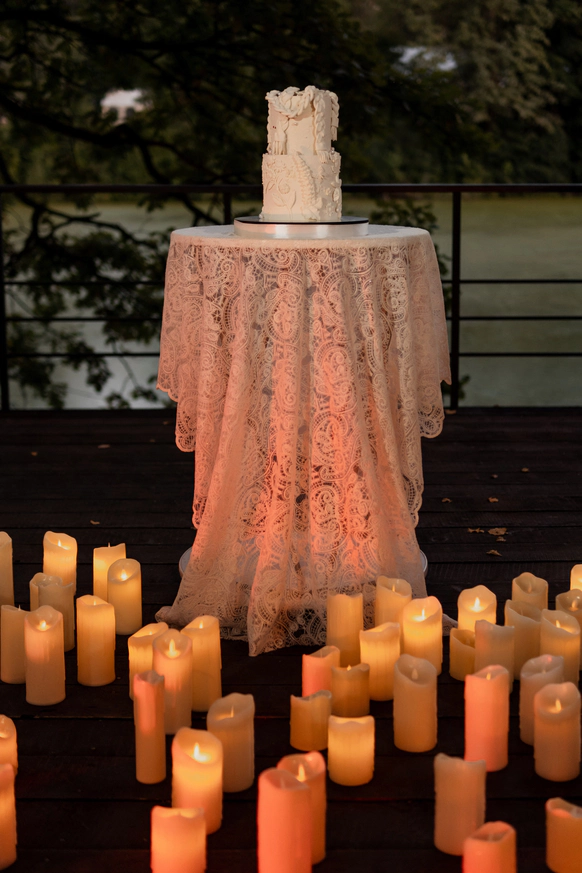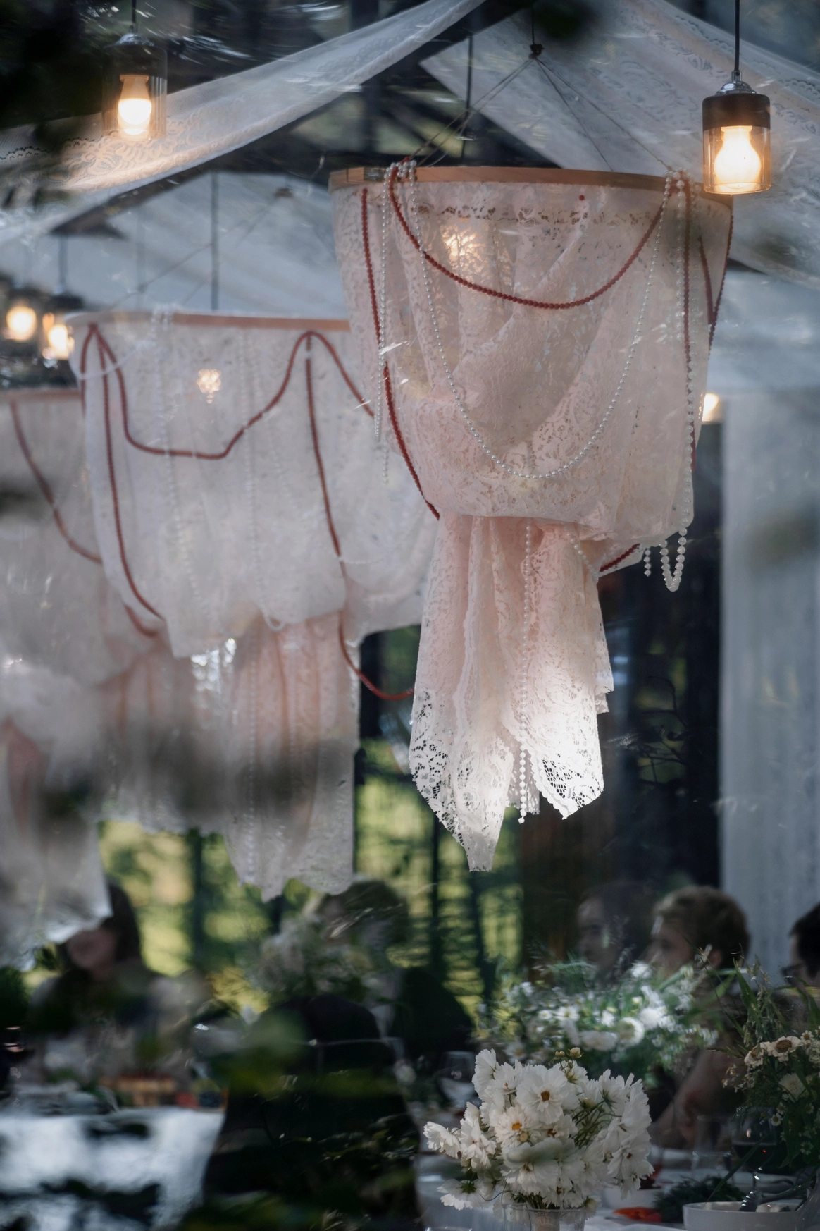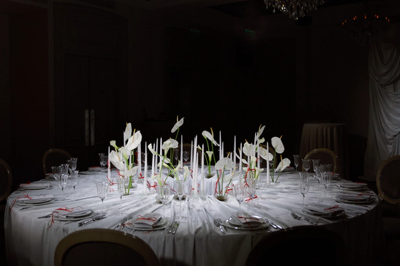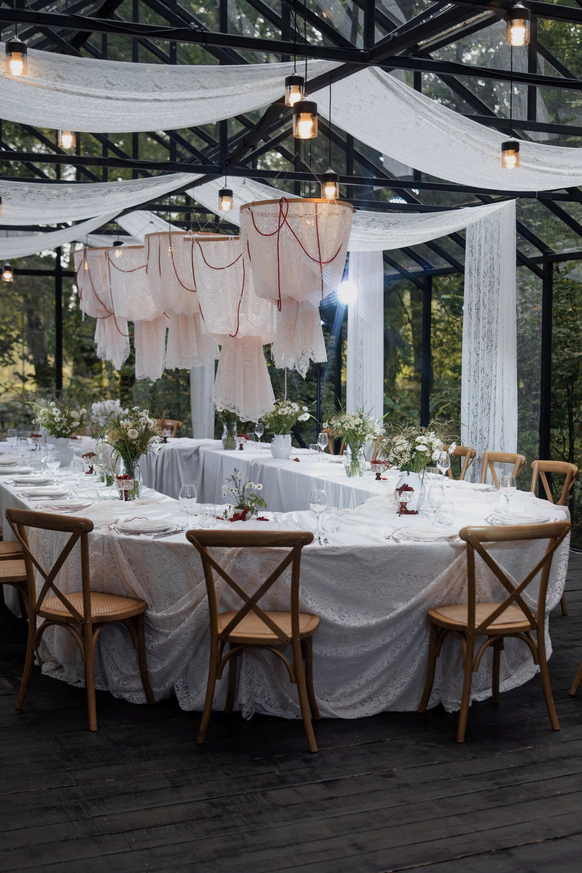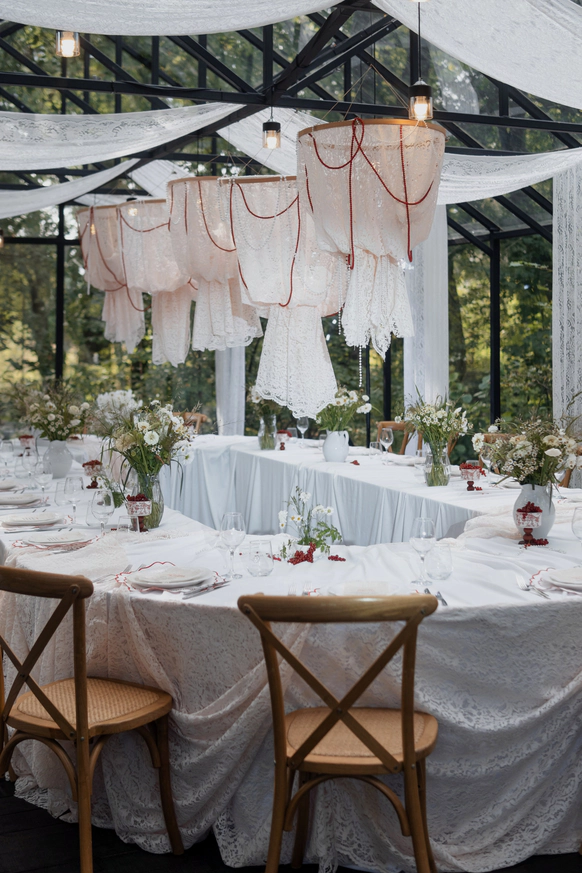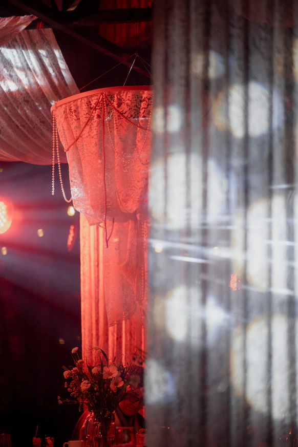 Также, как это не парадоксально, но на момент проработки концепции у Ники уже было платье и оно идеально гармонировало с нашей задумкой, а так как в пошиве платья использовалось кружево, то мы решили его добавить на потолок, на борты столов и изготовили кружевные люстры с красными бусами.