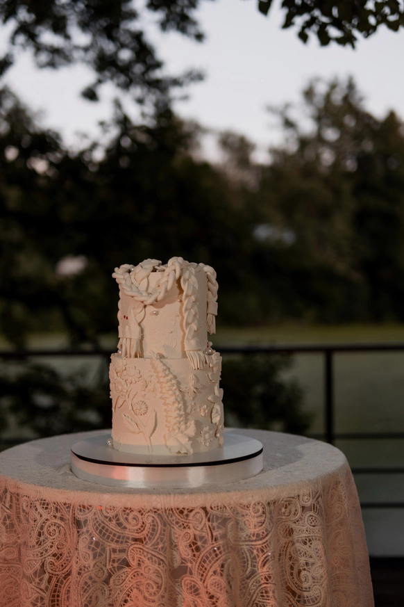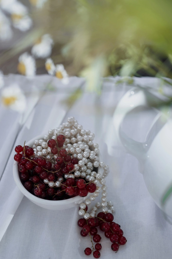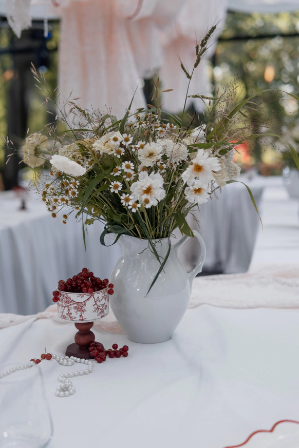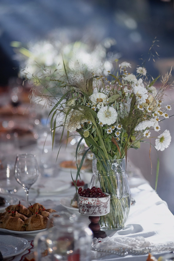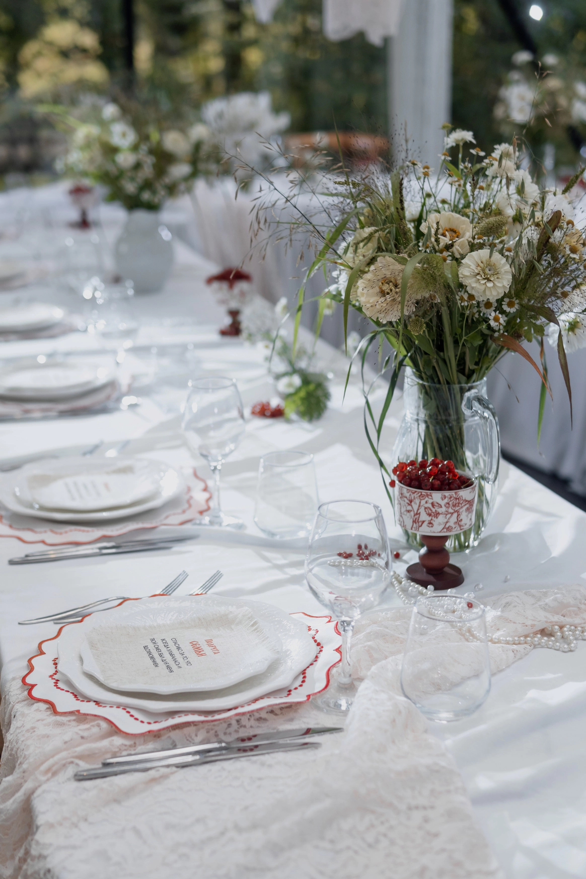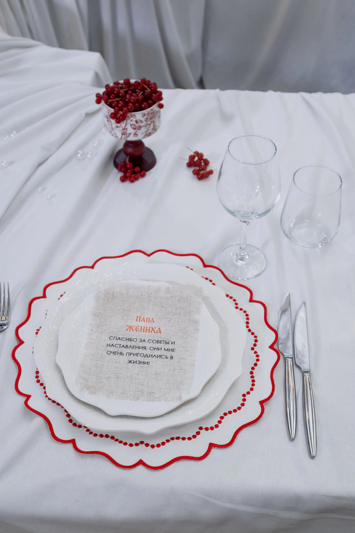 Помимо кружева мы использовали лен - льняными были скатерти и карточки рассадки, расписанные в старославянском стиле, также мы использовали глиняные кувшины с полевыми цветами, креманки с красной смородиной и салфетки под тарелки как будто бы тоже с красными бусами.