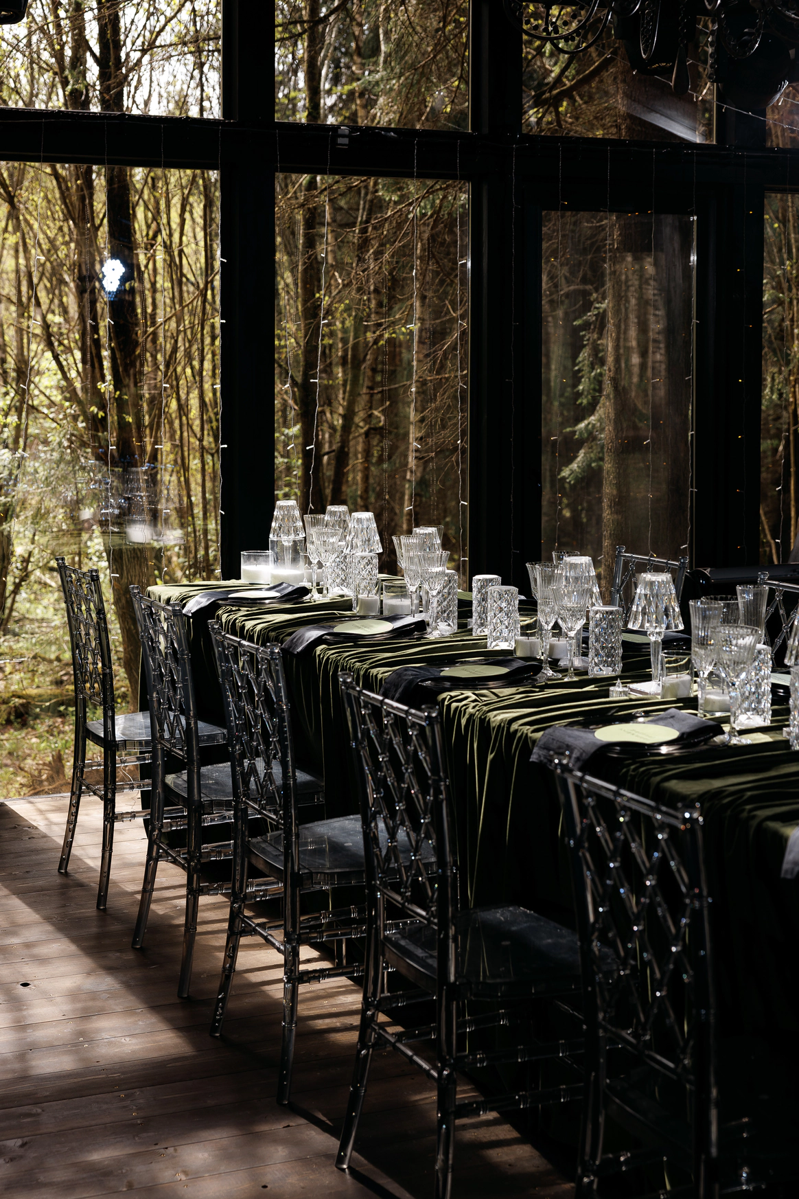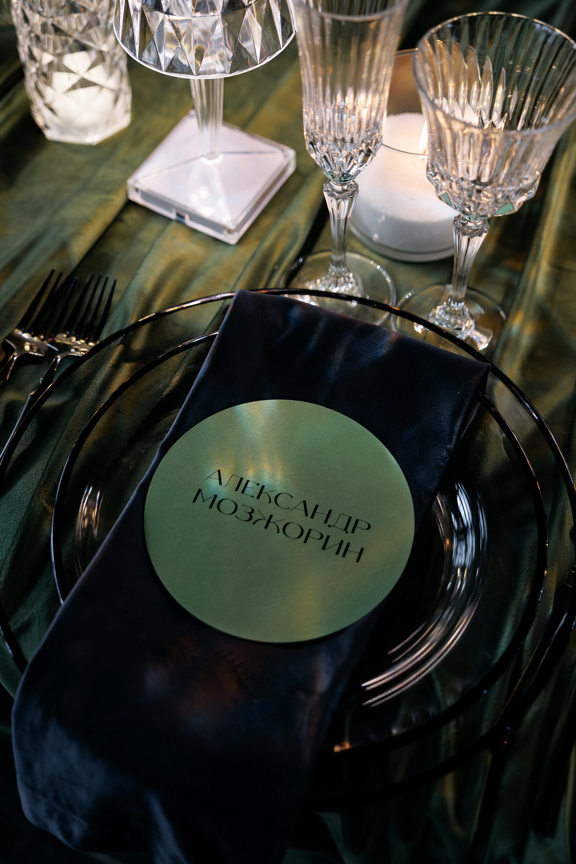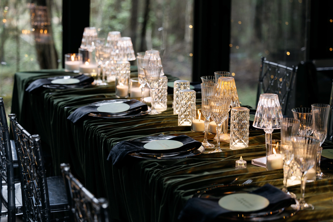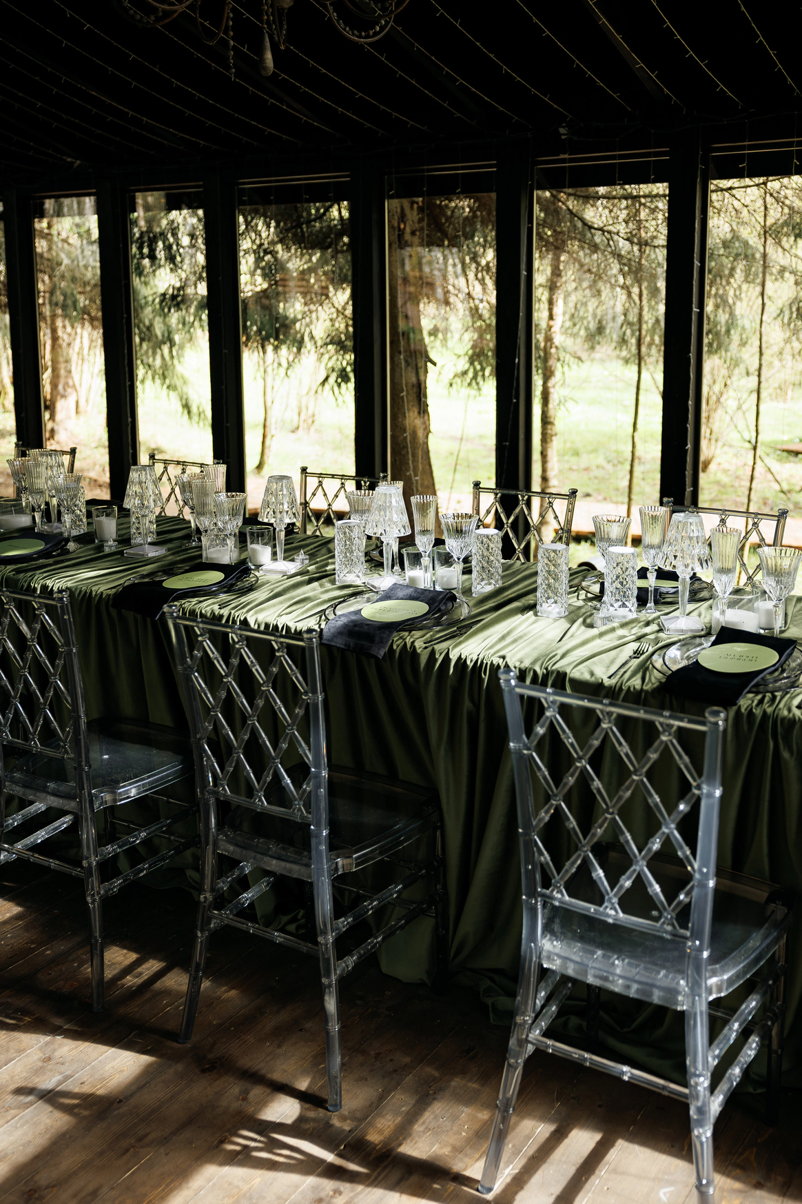 В качестве декора мы использовали один длинный прямоугольный стол, накрыли его скатертью травянистого цвета, чтобы добавить более ярких красок в апрельский день. Вместо флористики мы решили сделать акцент на разного плана светильниках, насыпных свечах и на сервировке с хрустальными бокалами, прозрачными тарелками и , массивной карточкой рассадки.