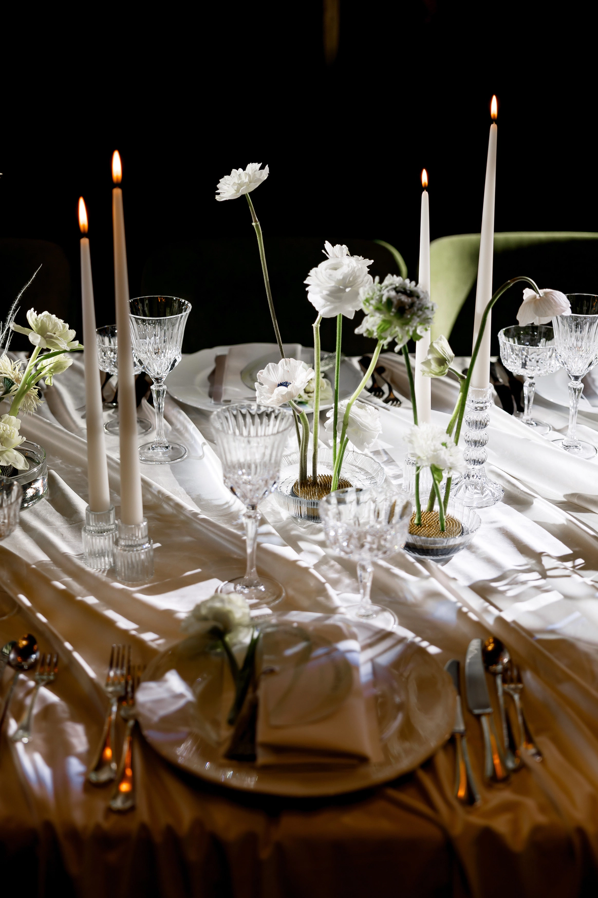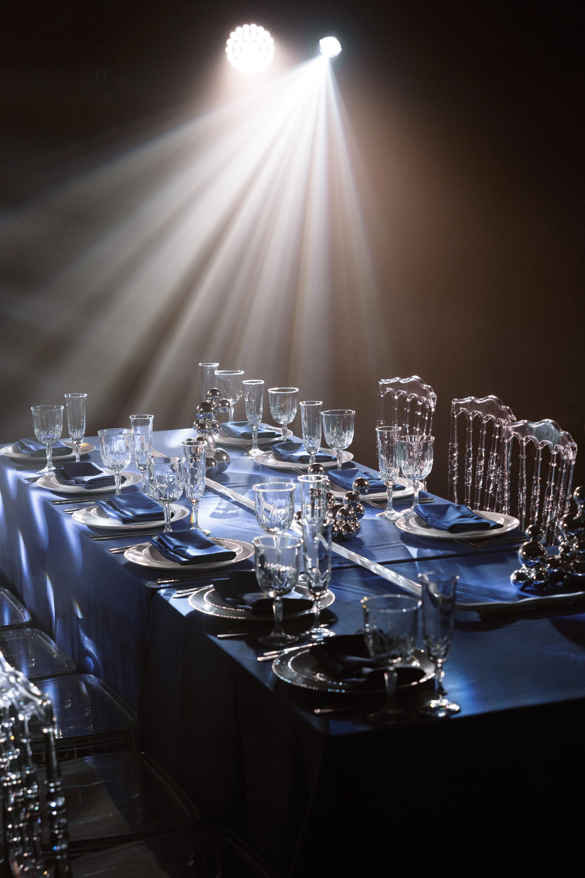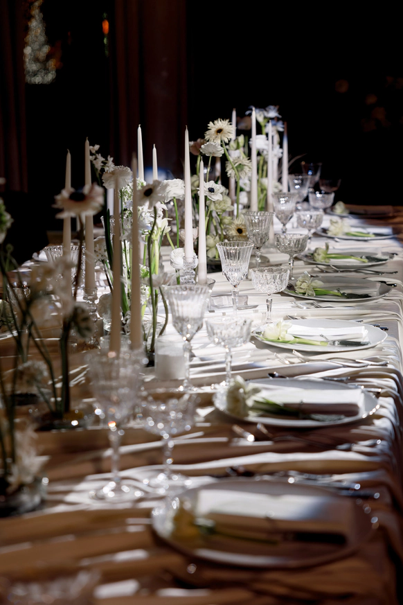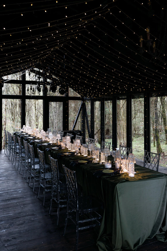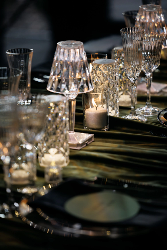 В качестве декора мы использовали один длинный прямоугольный стол, накрыли его скатертью травянистого цвета, чтобы добавить более ярких красок в апрельский день. Вместо флористики мы решили сделать акцент на разного плана светильниках, насыпных свечах и на сервировке с хрустальными бокалами, прозрачными тарелками и , массивной карточкой рассадки.