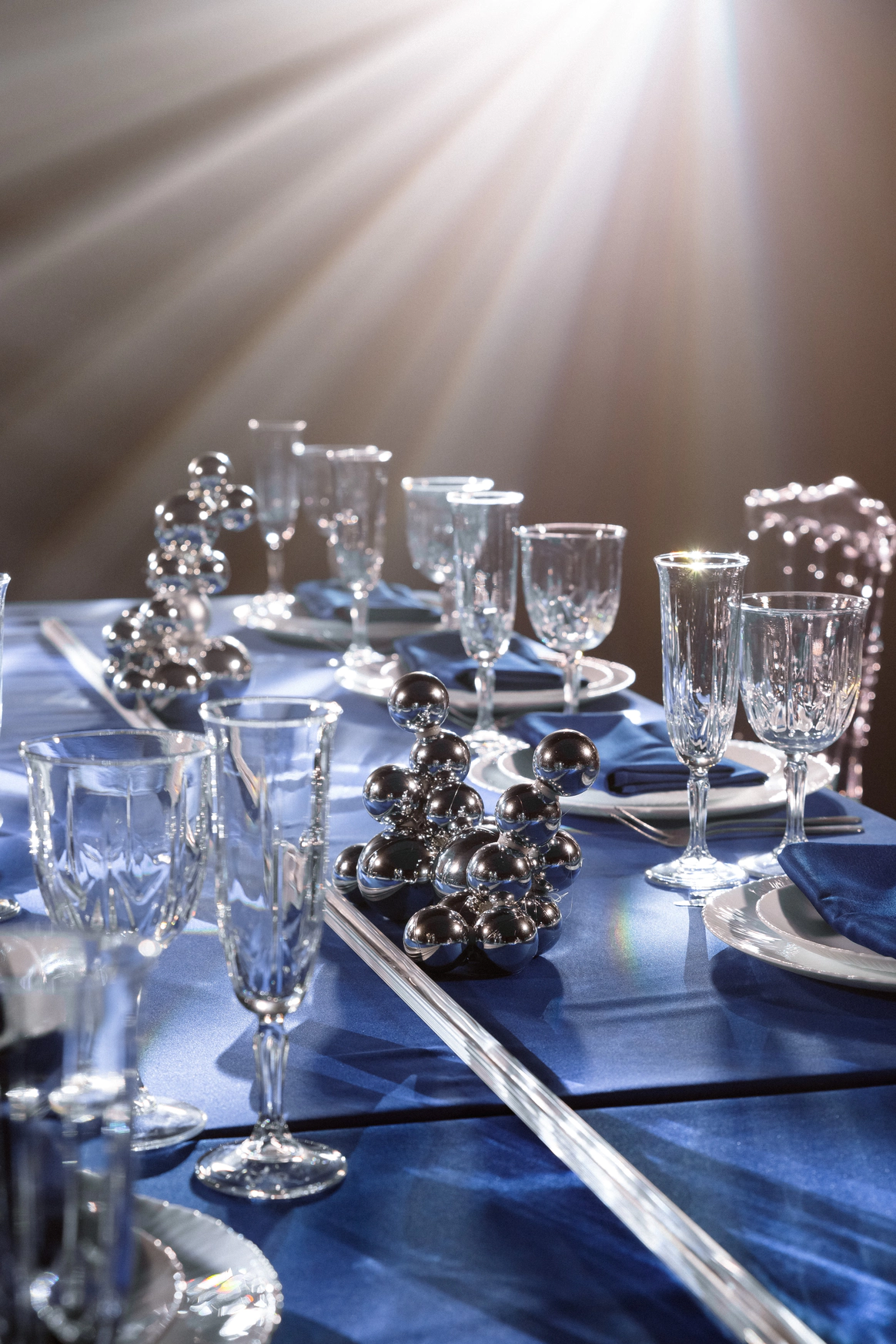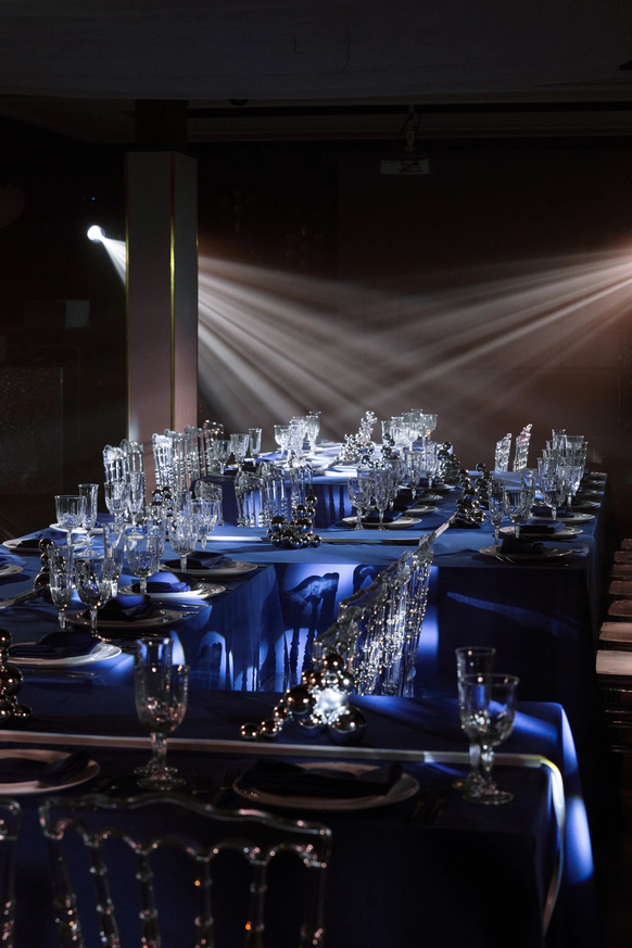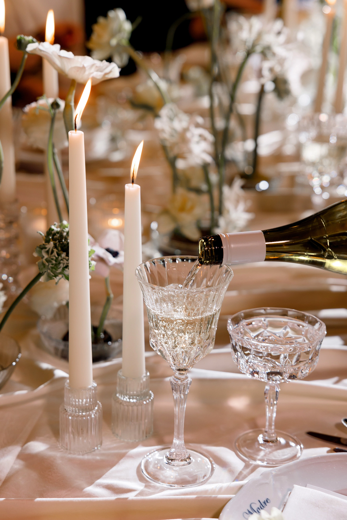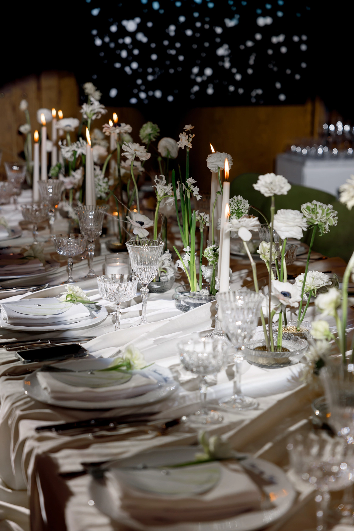В качестве декора мы использовали один длинный прямоугольный стол, накрыли его скатертью травянистого цвета, чтобы добавить более ярких красок в апрельский день. Вместо флористики мы решили сделать акцент на разного плана светильниках, насыпных свечах и на сервировке с хрустальными бокалами, прозрачными тарелками и , массивной карточкой рассадки.