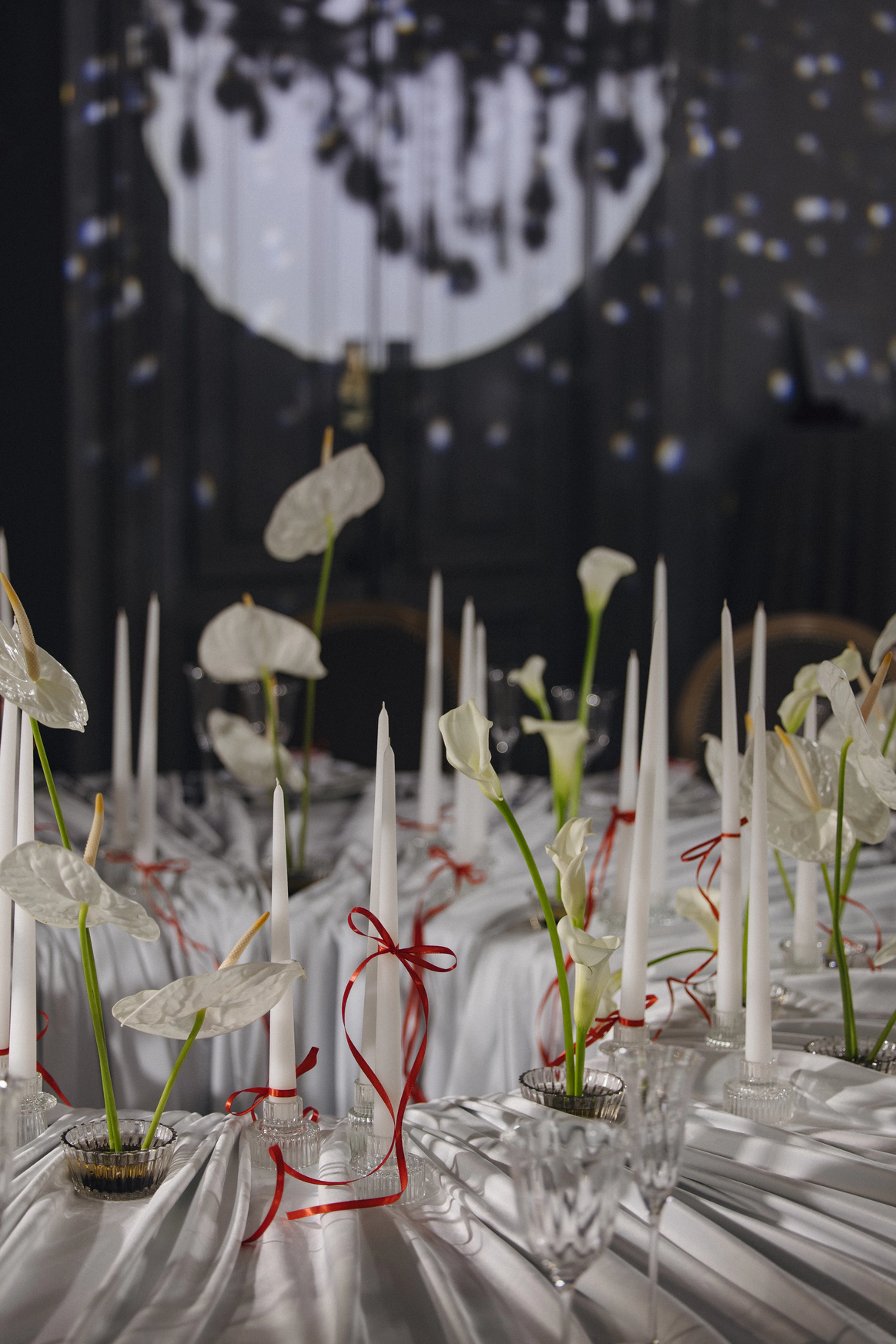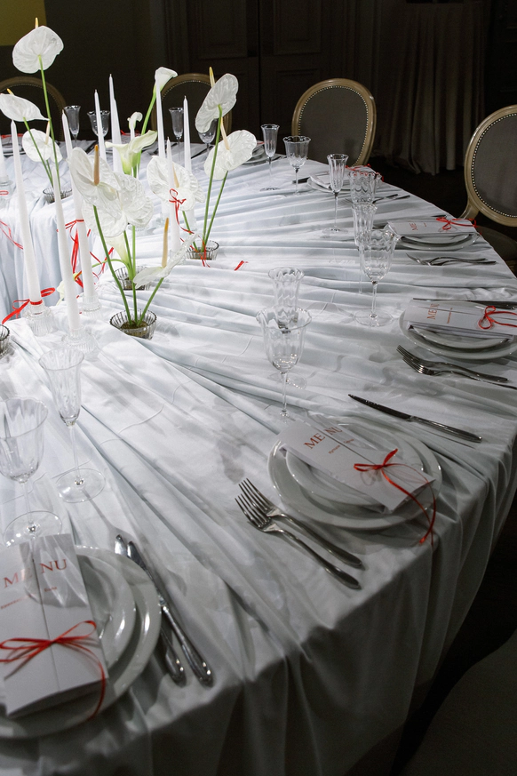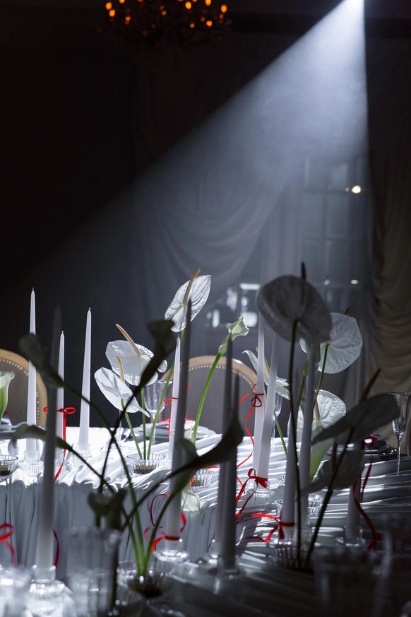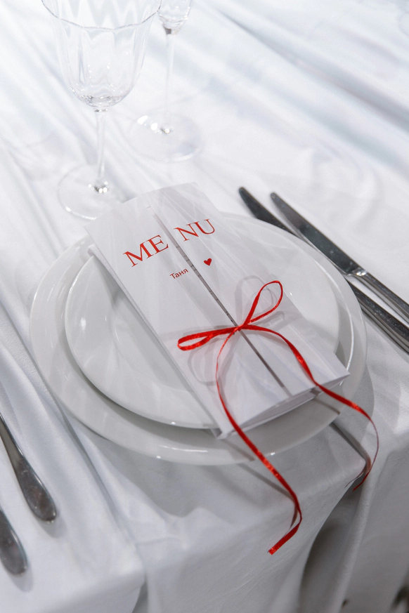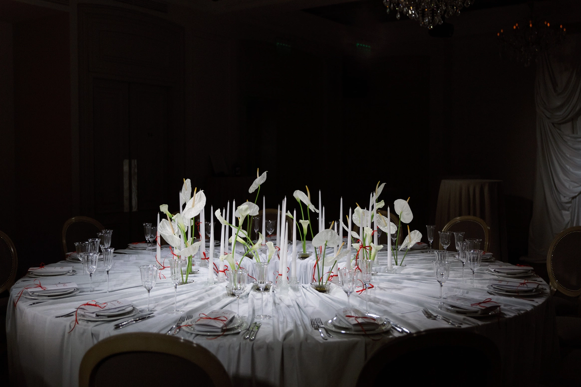 И мы лишь немного добавили декора - любимые цветы невесты (каллы и антуриумы), хрустальные бокалы, высокие свечи, карточки рассадки и меню, которые открывались, как книжка, а в качестве красных мини акцентов использовали красные тонкие ленточки на свечах, цветах, а также драпировали зеркальную дверь тканью, чтобы гости с парой могли фотографироваться на фоне нее, а также туда мы вынесли торт.