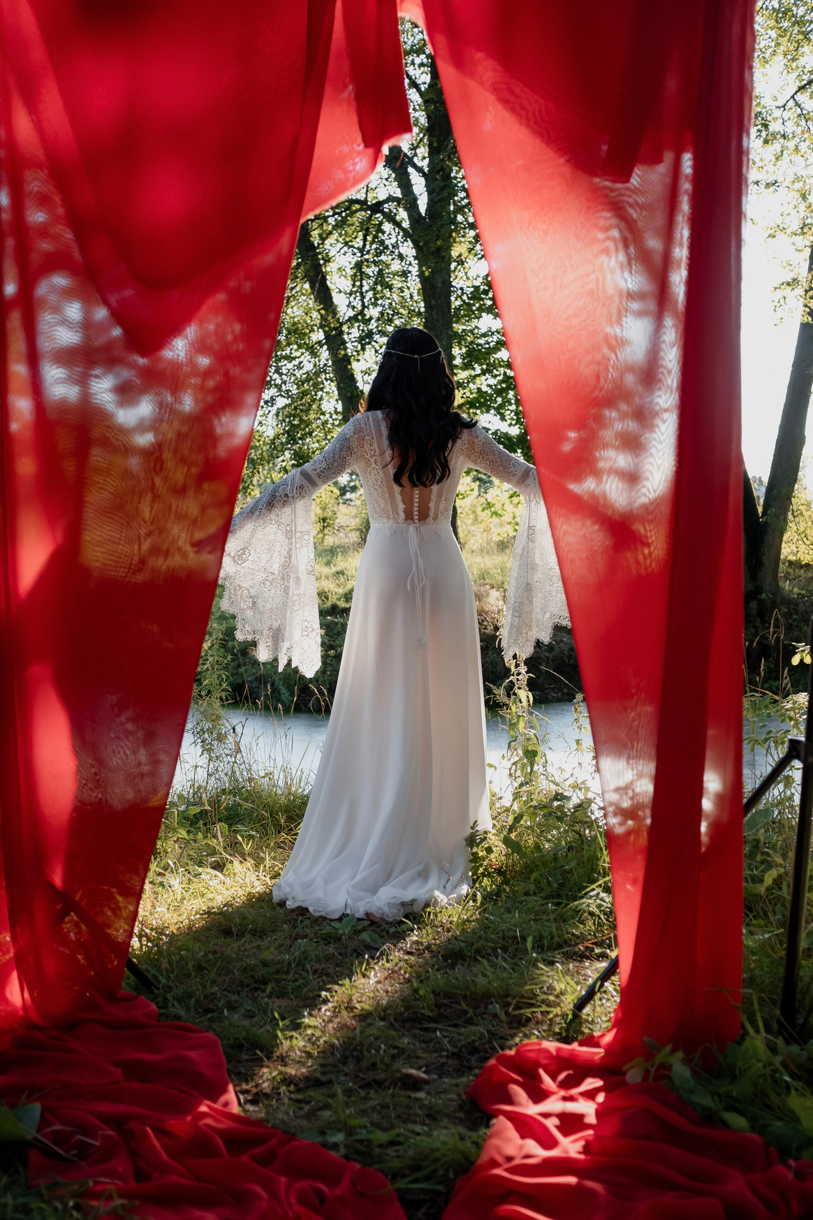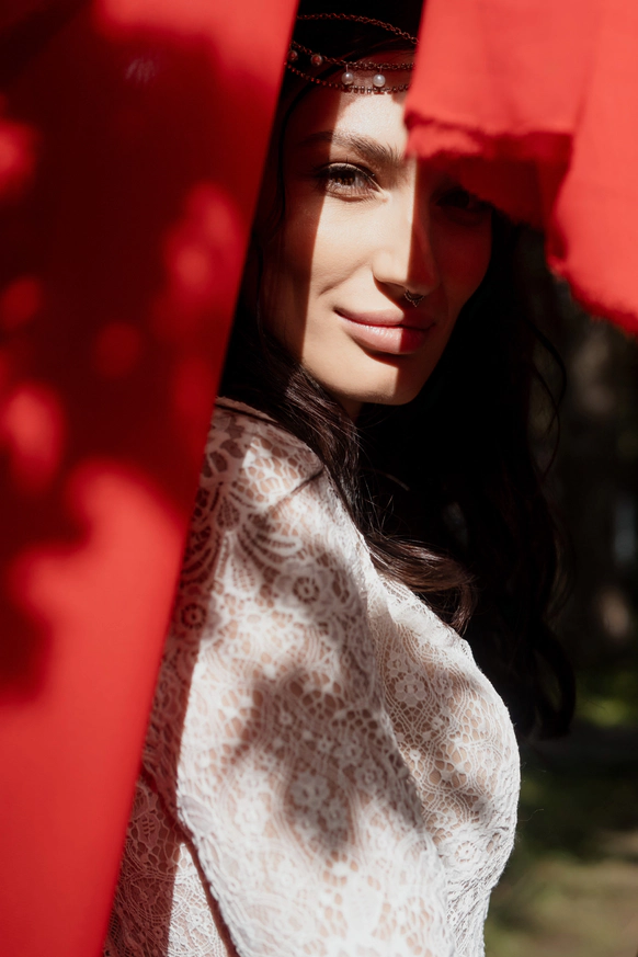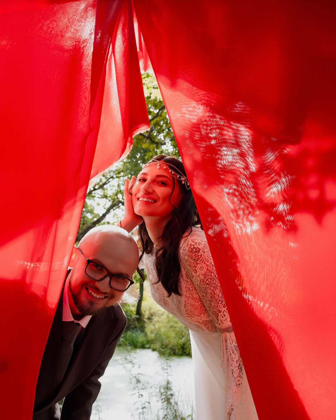 Идею с красной фотозоной подал нам фотограф, сначала мы не поняли эту идею, а ему хотелось привезти обычную стойку для фона и накрыть ее полупрозрачной тканью, как обряд перехода из незамужнего состояния в замужнее.