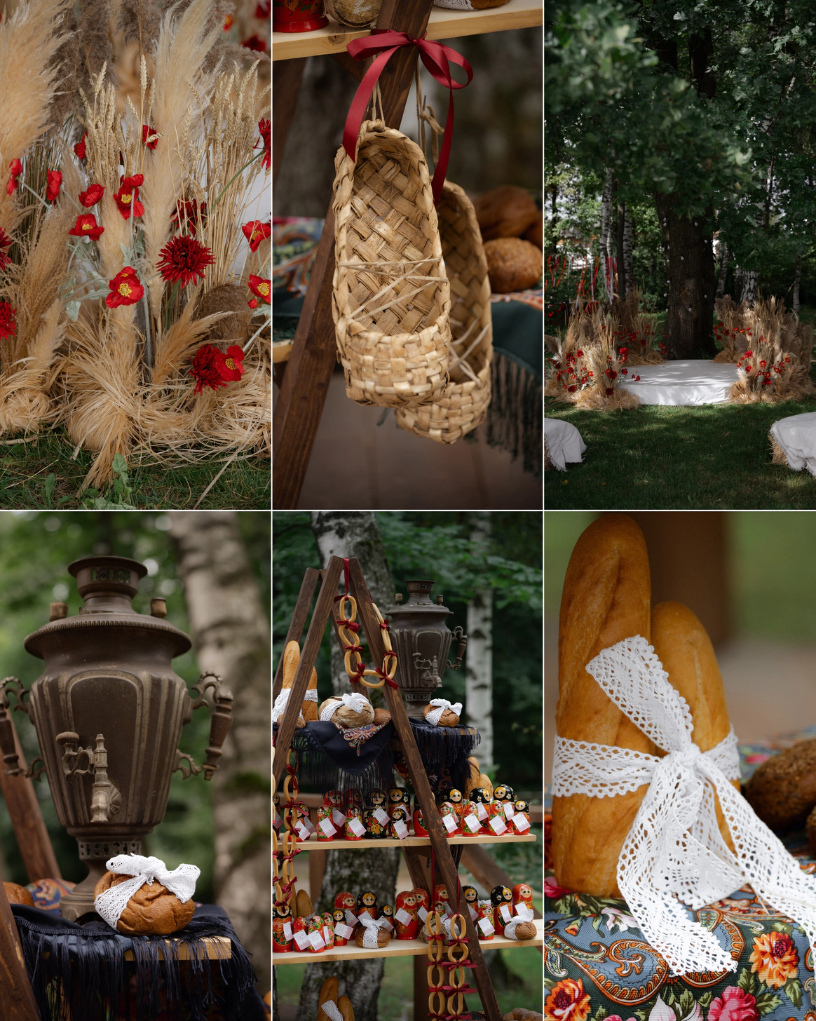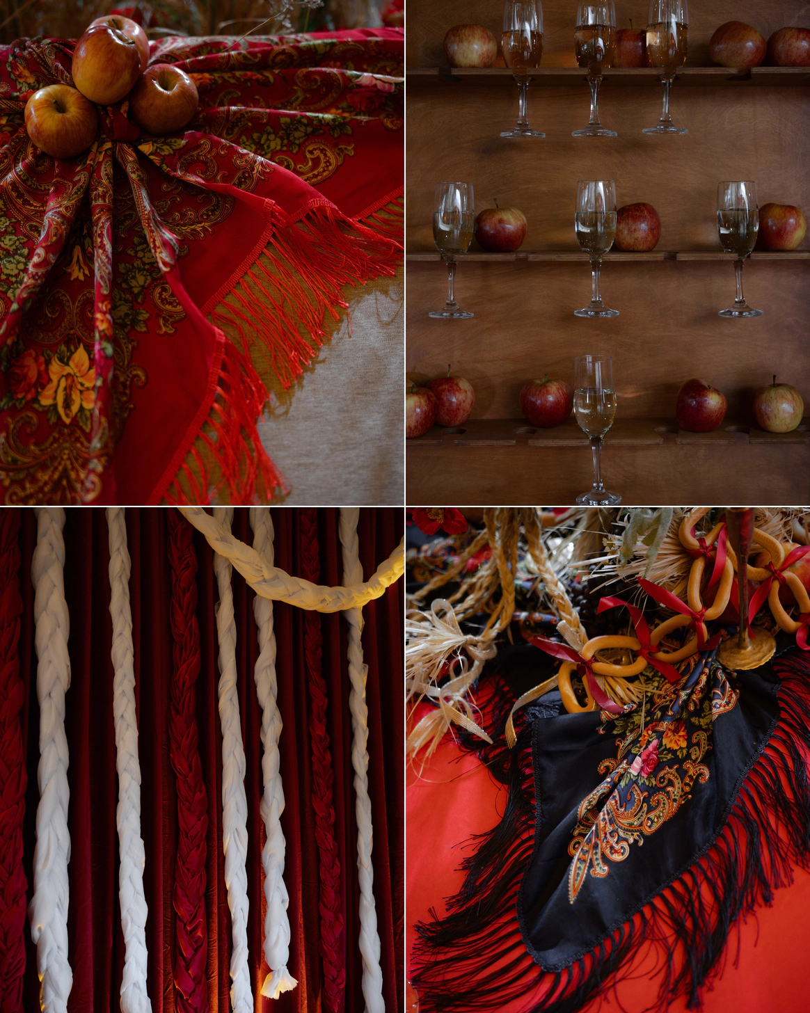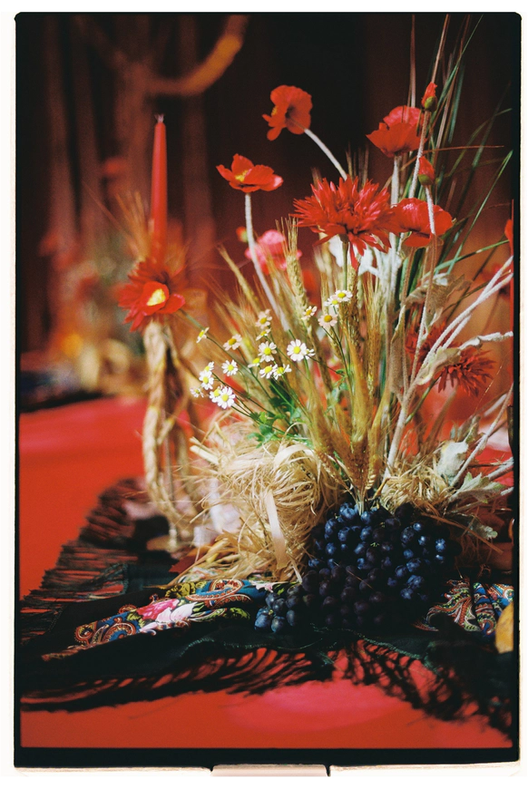 В декоре - красные скатерти, колосья, маки и черные павлопосадские платки с бахромой.