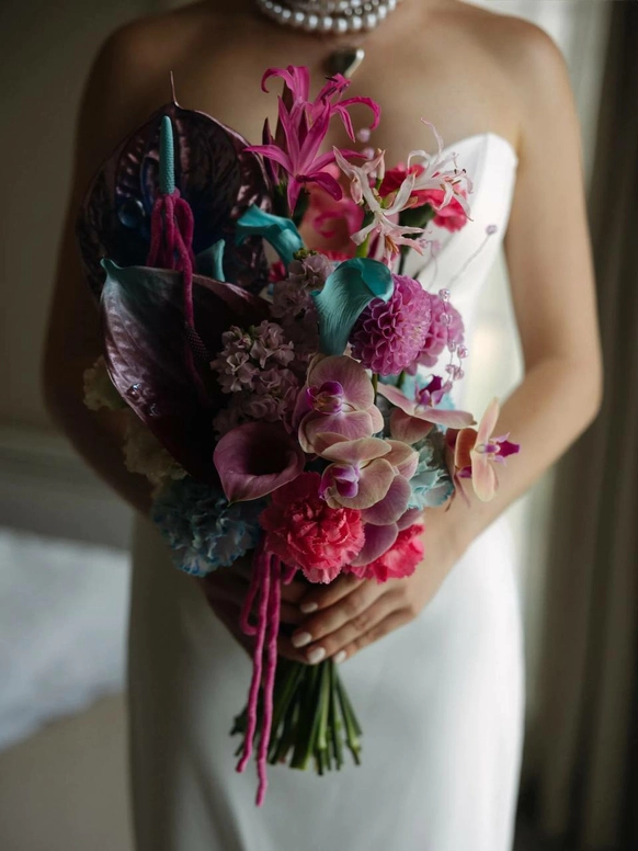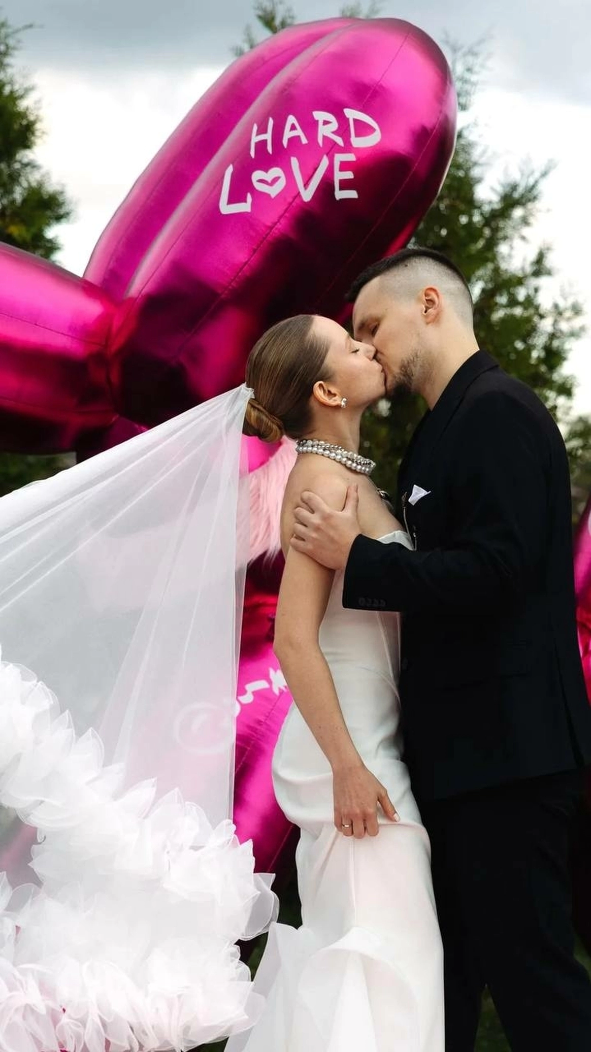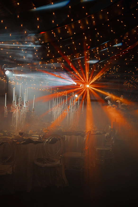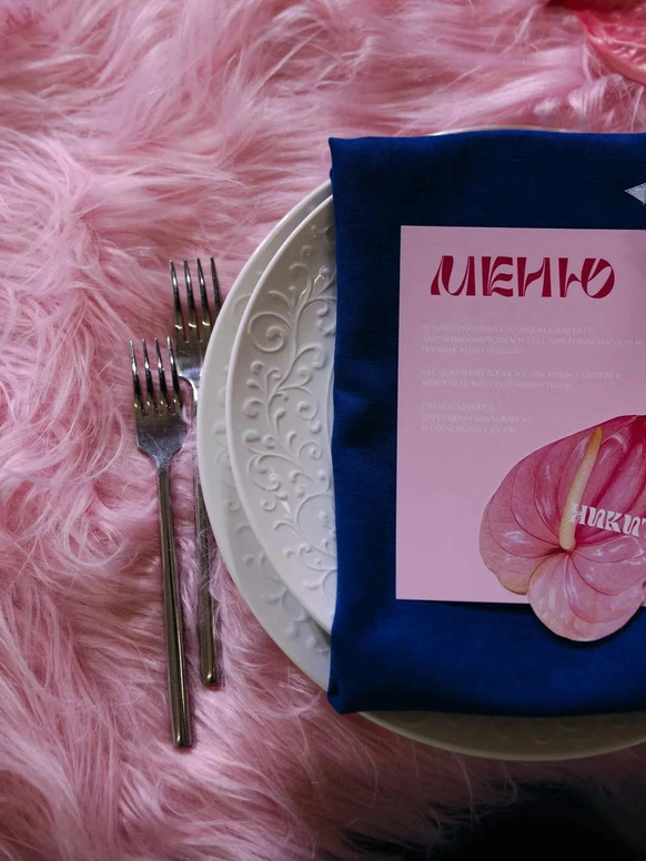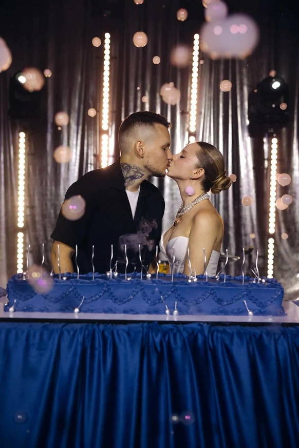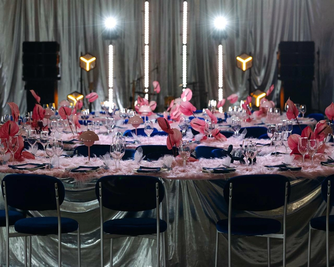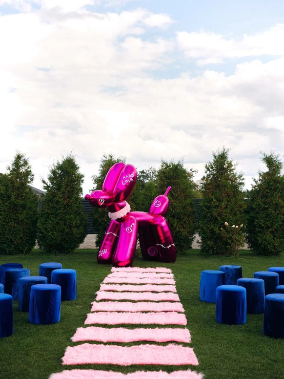 Это свадьба нового поколения - про свободу быть собой. Проект стал манифестом. История пары - это драматургический стержень свадьбы, которую мы выстроили как ироничную современную сказку о втором шансе, характере и рок-н-ролльной любви. Амбар холл превратился в иммерсивный мир «Плохого Диснея» с гигантским глянцевым арт-объектом в виде розовой собаки Люцика, пушистыми дорожками и смелым контрастом синего и фуксии. Каждая зона пространства рассказывала отдельную главу их истории. Яркая сервировка и синий торт с розовыми пузырями - усилили характер проекта, а сам Люцик в смокинге стал полноценным героем сценария. Финалом стало драйвовое рок-шоу с выходом невесты с гитарой и барабанами, превратившее вечер в живой перформанс.