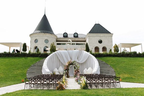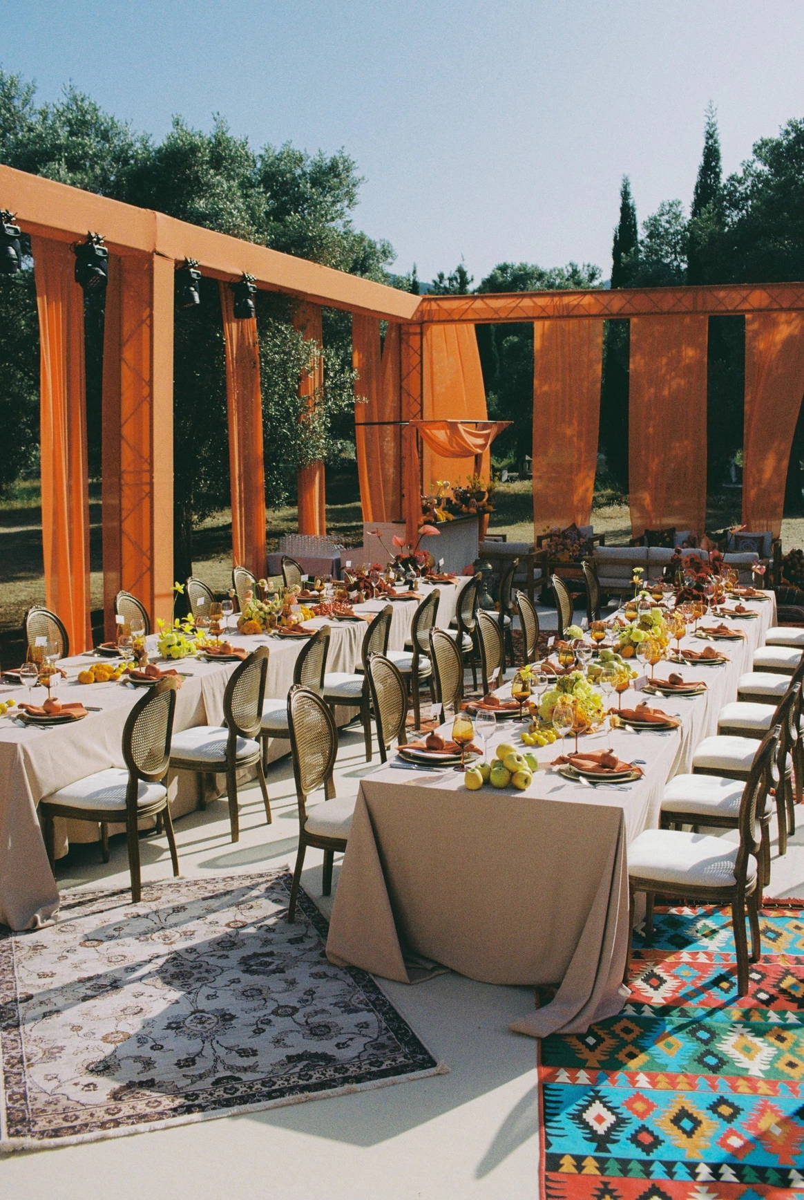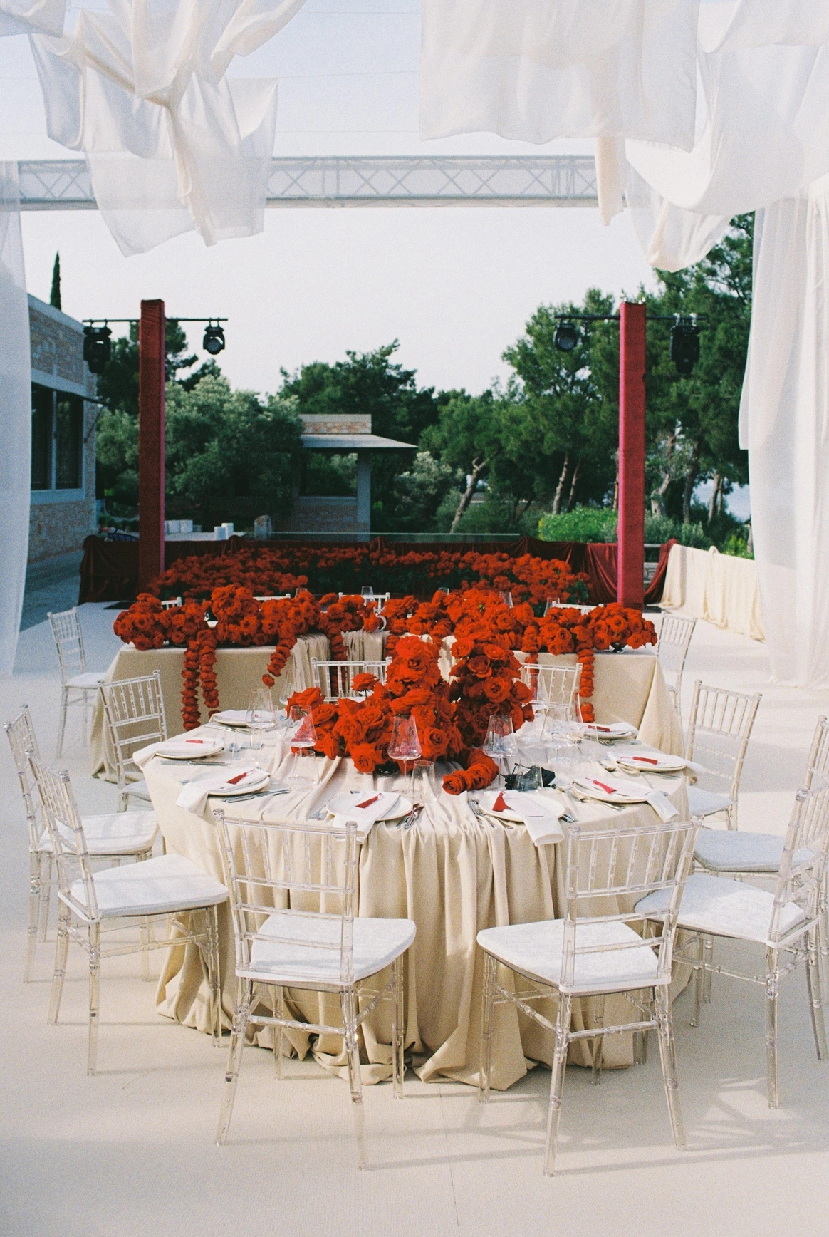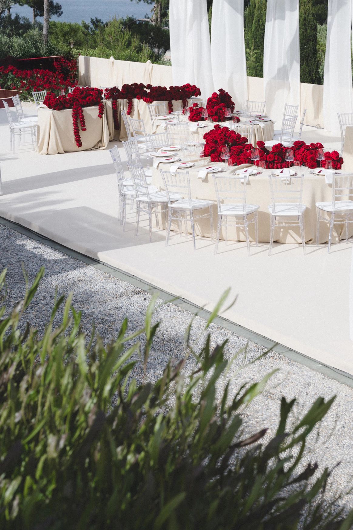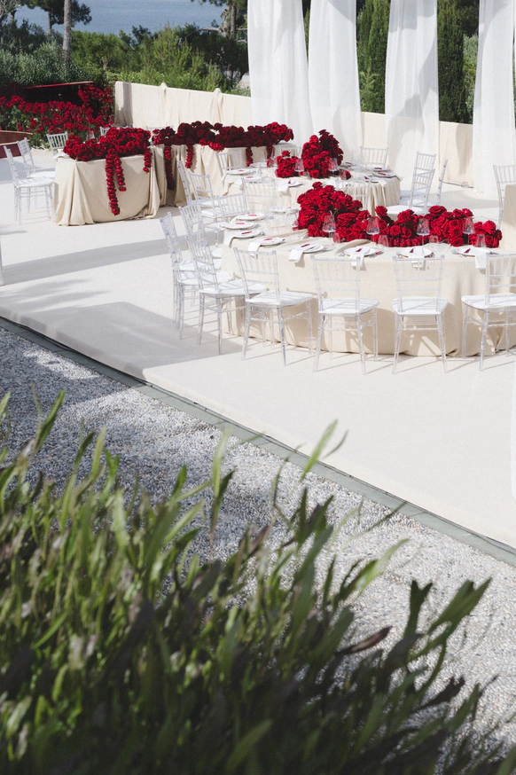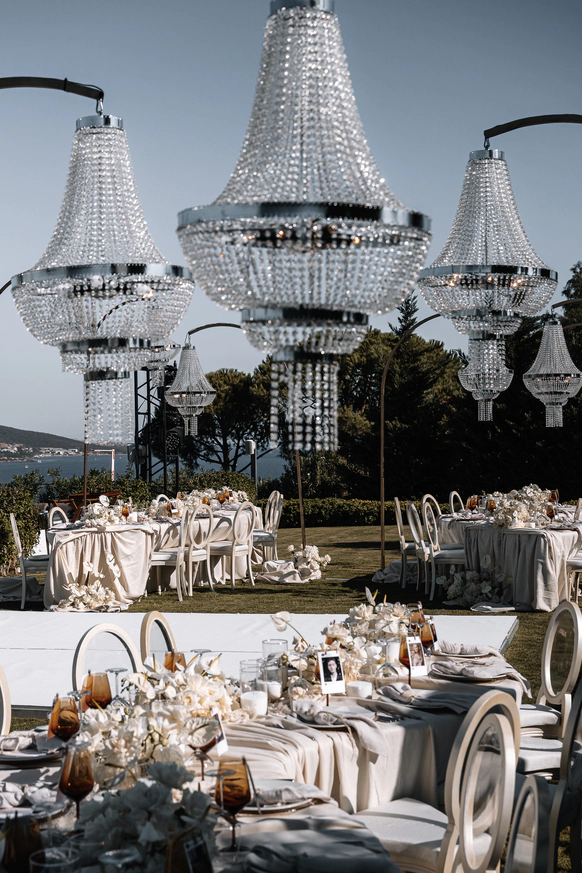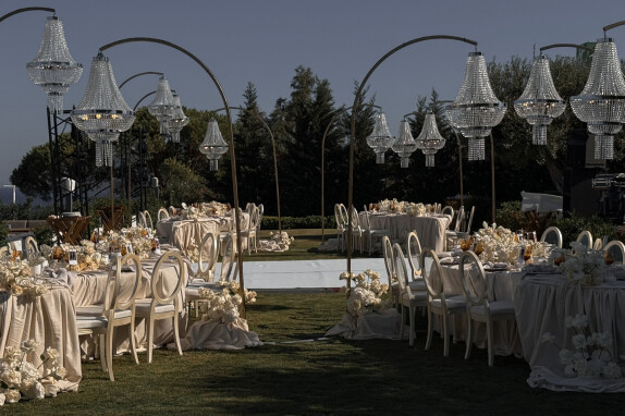 Для предсвадебного ужина мы выстроили с нуля турецкий шатер в оливковой роще. Для свадьбы нам пришлось вызывать аквалангистов, чтобы закрыть полами 50-метровый инфинити бассейн и построить банкетную площадку на воде.