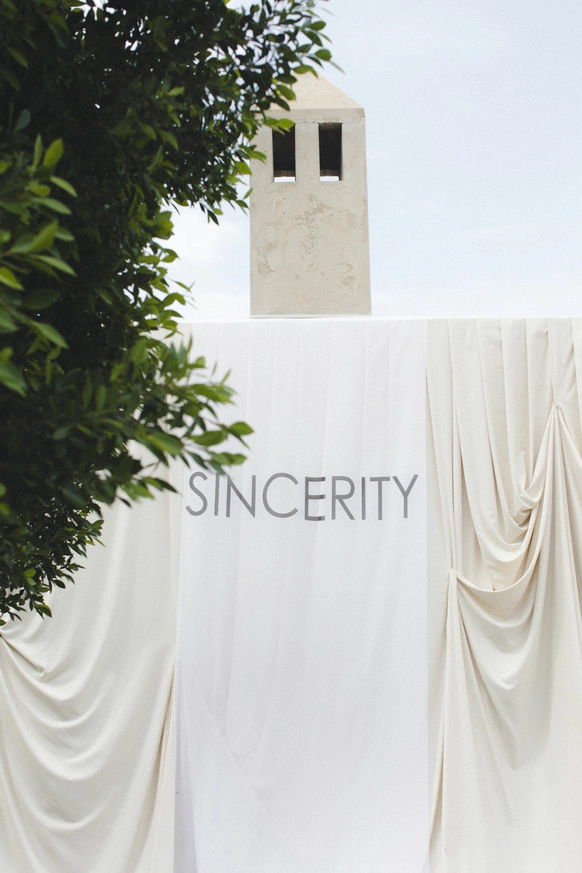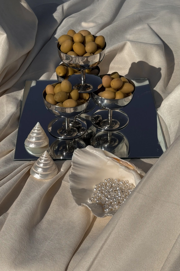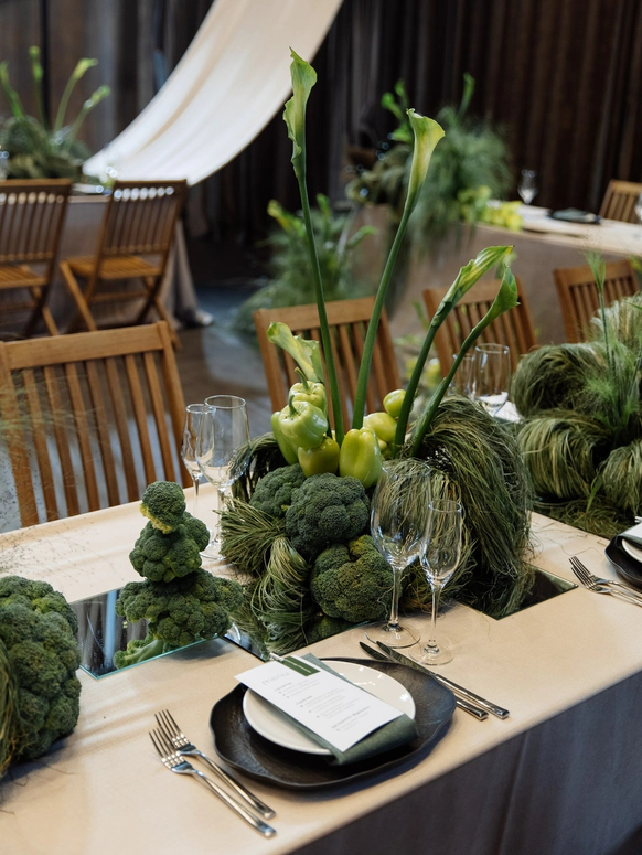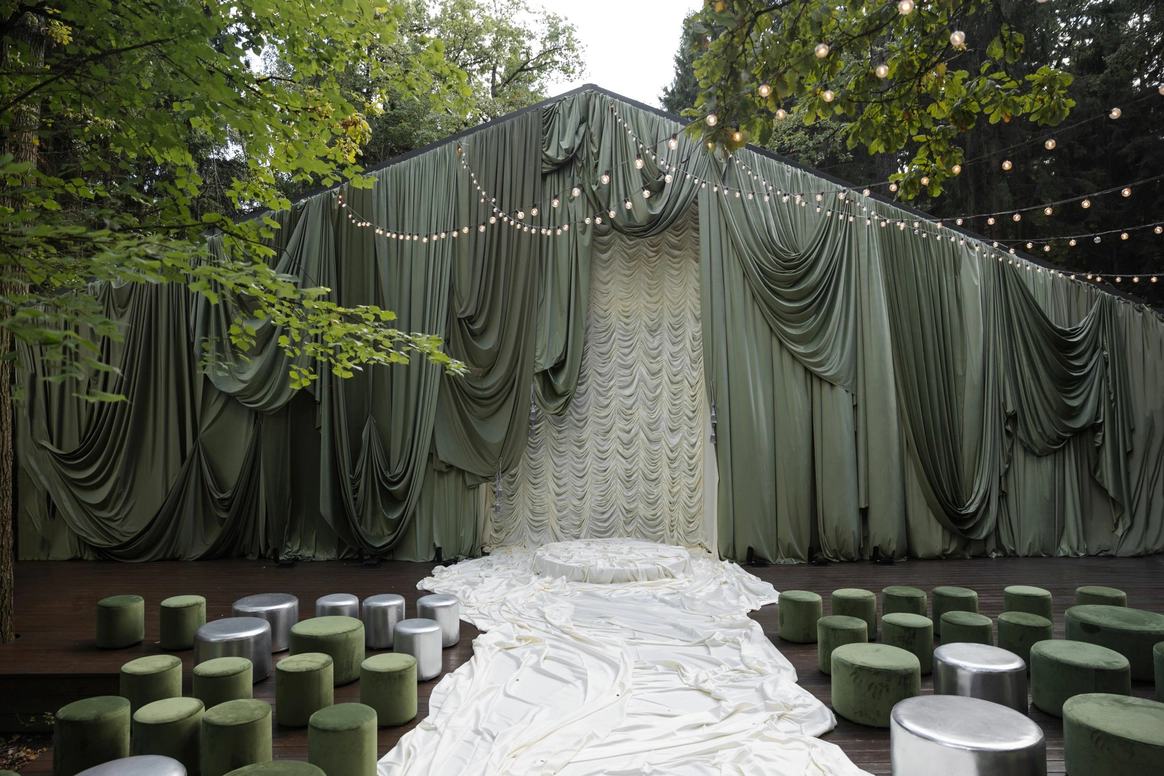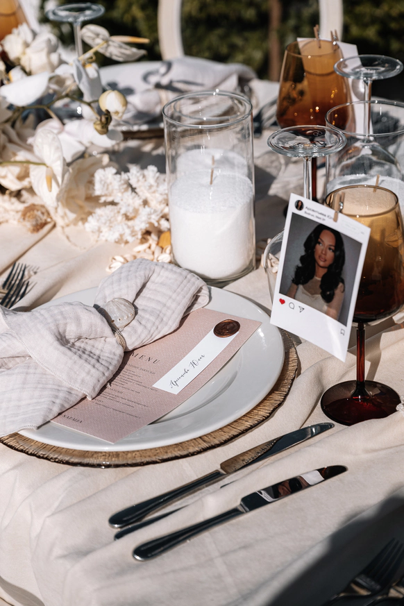 * Морская эстетика пронизывала проект повсюду: рассадка за столами-волнами, фуд-стайлинг с раковинами и жемчугом, песочные драпировки в виде морских барашков. Эскиз церемонии создан с ИИ и реализован в точности: арт-объект из ткани и проволоки напоминал кораллы, белая цветочная дорожка вела к точке встречи.
