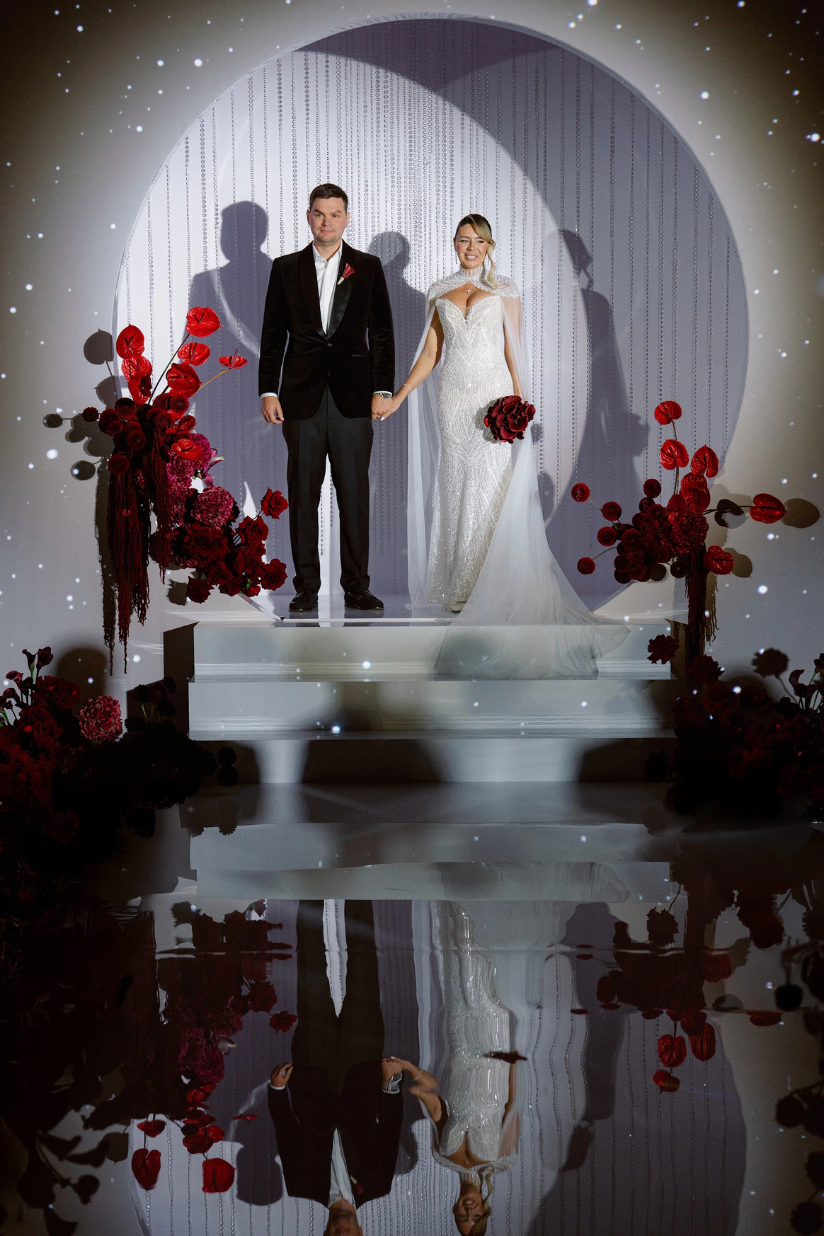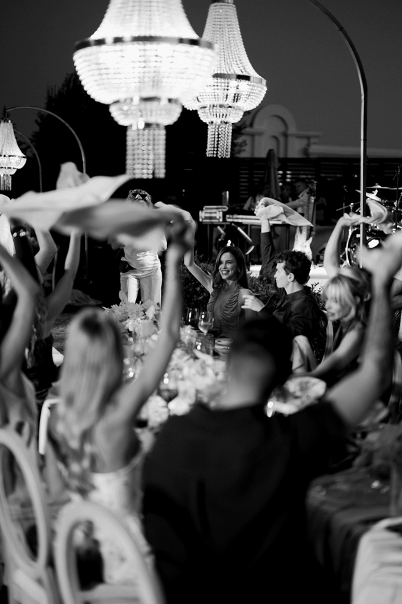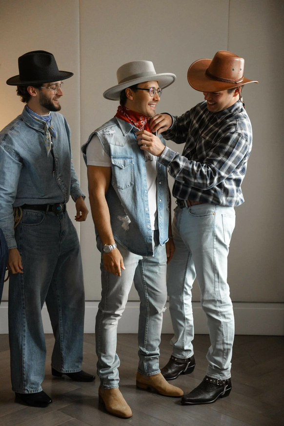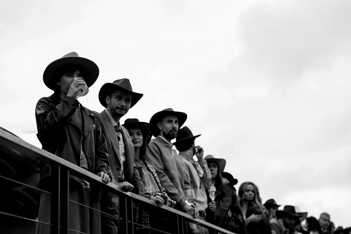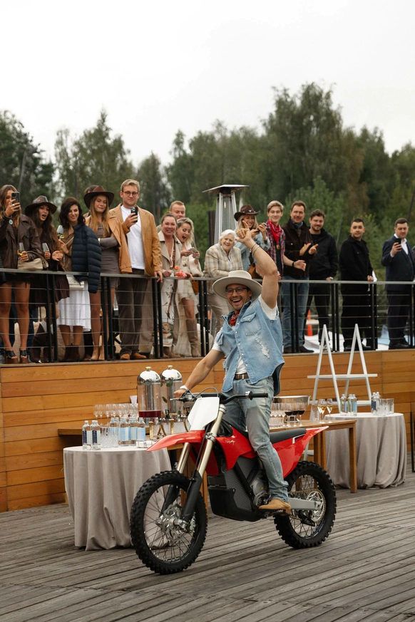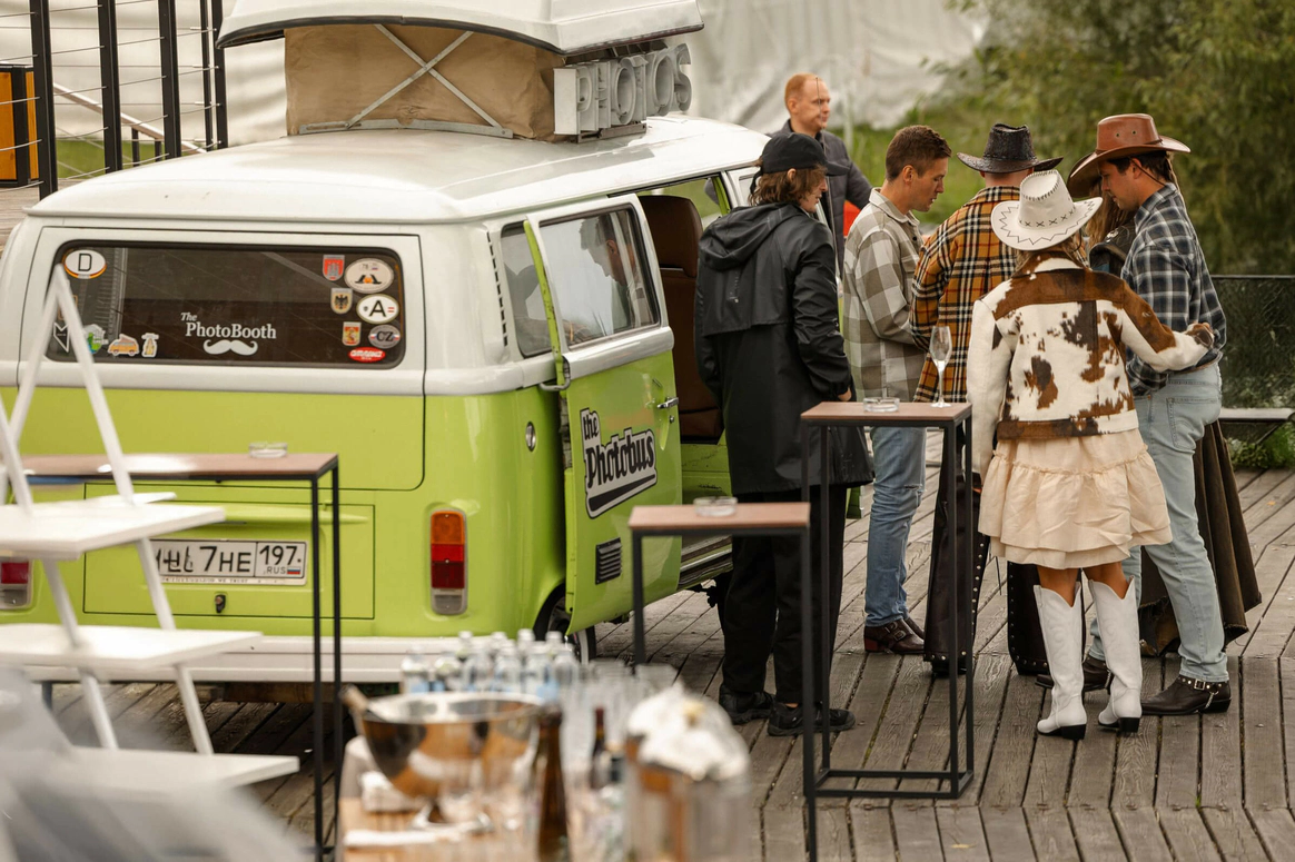 Мы сделали ставку не на утро невесты, а на утро жениха — сознательно разрушив свадебный канон. Вместо амбара — люкс Four Seasons с видом на Красную площадь. Казаки, ковбойские шляпы, пиво и блины с чёрной икрой — визуал в духе премиальной рекламы Marlboro. После сборов мужчины отправились в яхт-клуб, команда невесты прибыла на второй яхте, и первая встреча пары состоялась прямо на воде — яркая, дерзкая, кинематографичная. Образы пары — полный отказ от классики: вестерн-сарафан, замшевая косуха и ковбойская шляпа у невесты; деним и казаки у жениха. Для гостей разработана многоуровневая презентация дресс-кода, превратившая свадьбу в подиум ковбойской моды. Ужин прошёл в фестивальном формате с фуд-станциями на террасе. Церемония на закате: жених на мотоцикле, невеста на чёрном жеребце, в финале — шляпы в небо. Кульминацией стал концерт «Банд’Эрос» на открытой сцене.