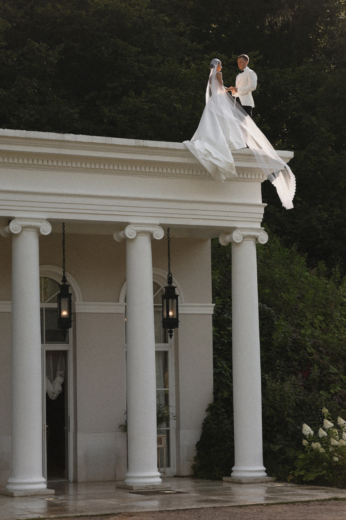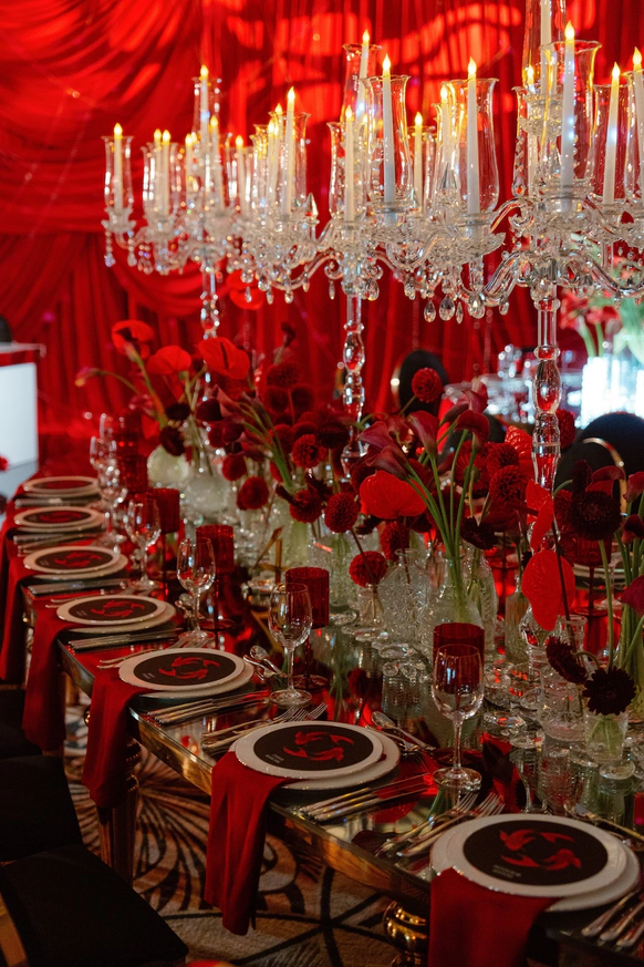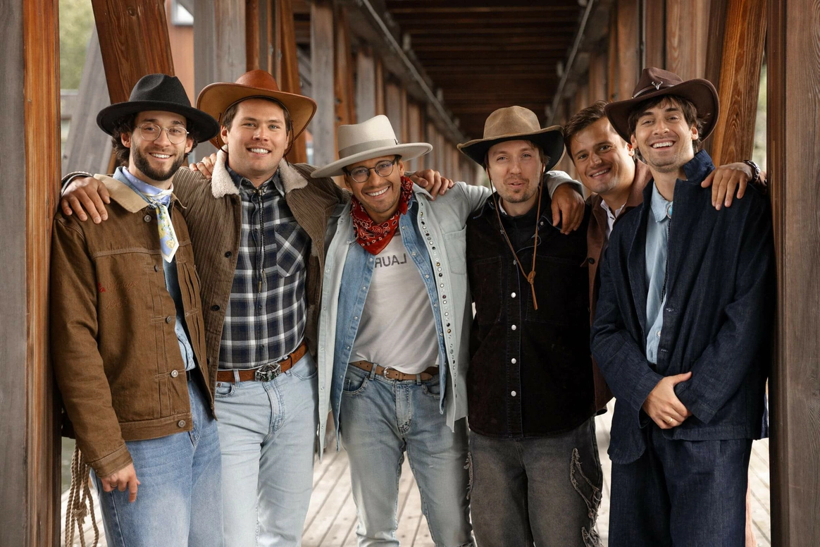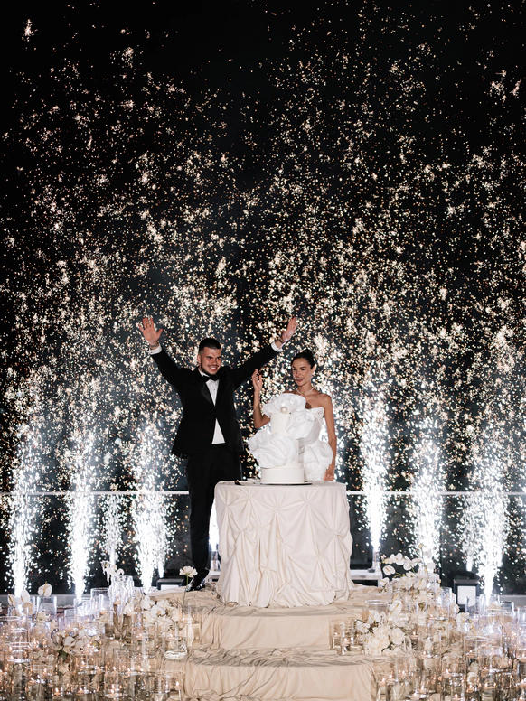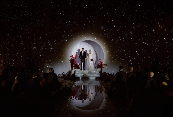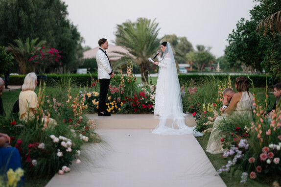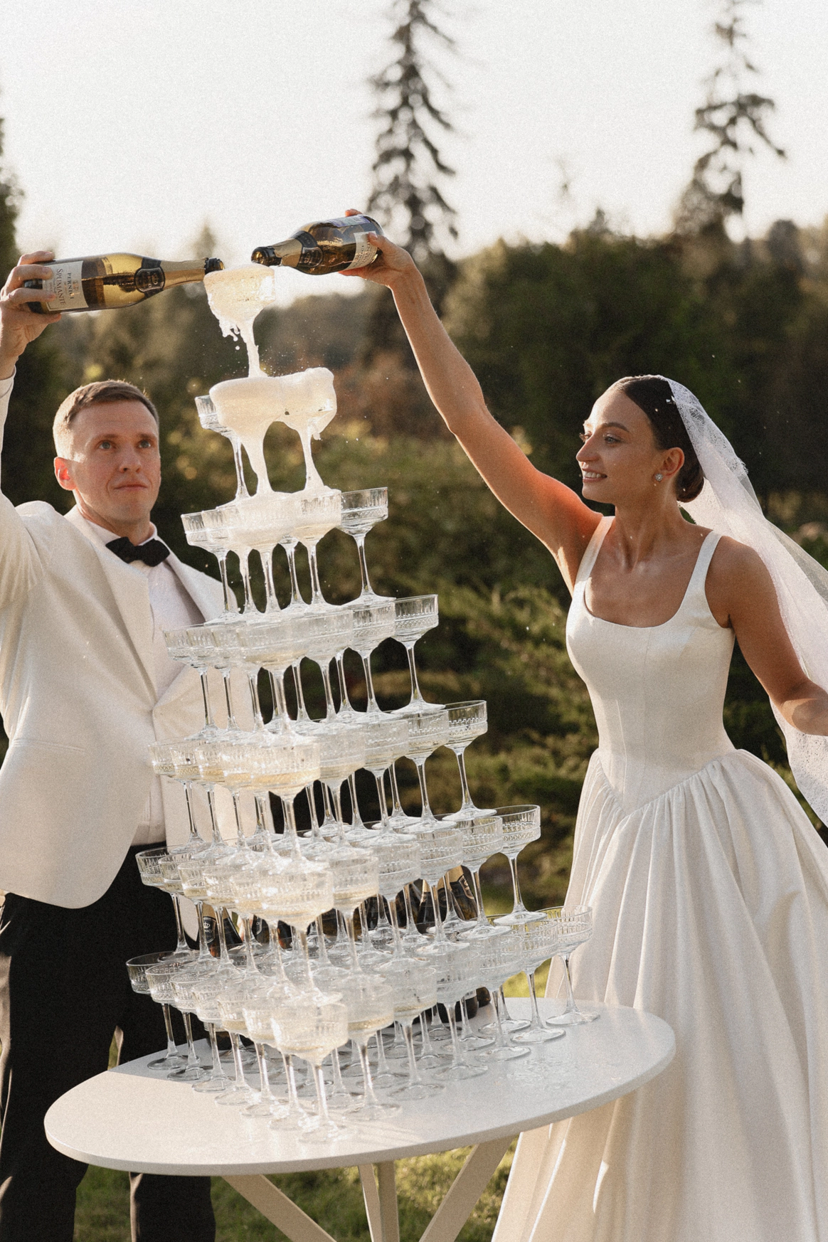 Мы сделали ставку не на утро невесты, а на утро жениха — сознательно разрушив свадебный канон. Вместо амбара — люкс Four Seasons с видом на Красную площадь. Казаки, ковбойские шляпы, пиво и блины с чёрной икрой — визуал в духе премиальной рекламы Marlboro. После сборов мужчины отправились в яхт-клуб, команда невесты прибыла на второй яхте, и первая встреча пары состоялась прямо на воде — яркая, дерзкая, кинематографичная. Образы пары — полный отказ от классики: вестерн-сарафан, замшевая косуха и ковбойская шляпа у невесты; деним и казаки у жениха. Для гостей разработана многоуровневая презентация дресс-кода, превратившая свадьбу в подиум ковбойской моды. Ужин прошёл в фестивальном формате с фуд-станциями на террасе. Церемония на закате: жених на мотоцикле, невеста на чёрном жеребце, в финале — шляпы в небо. Кульминацией стал концерт «Банд’Эрос» на открытой сцене.