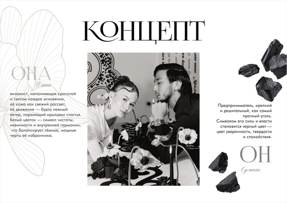 Их встреча — как слияние ночи и рассвета. Он — крепкий и решительный, как самый прочный уголь, готовый превратиться в сверкающий алмаз под воздействием любви. Она — словно цветочный лепесток, нежный и хрупкий, раскрывающийся навстречу его сильному сердцу.