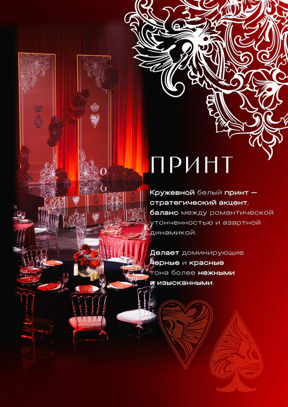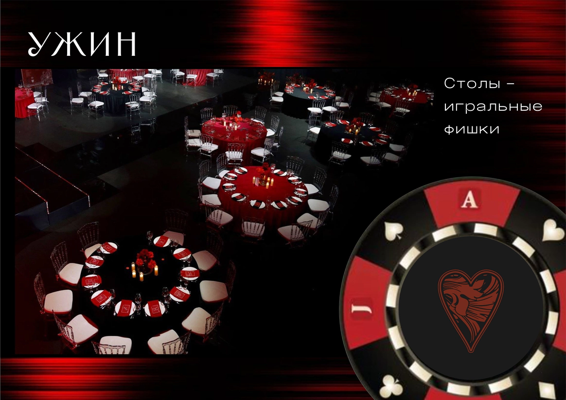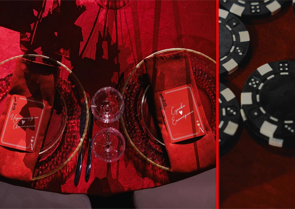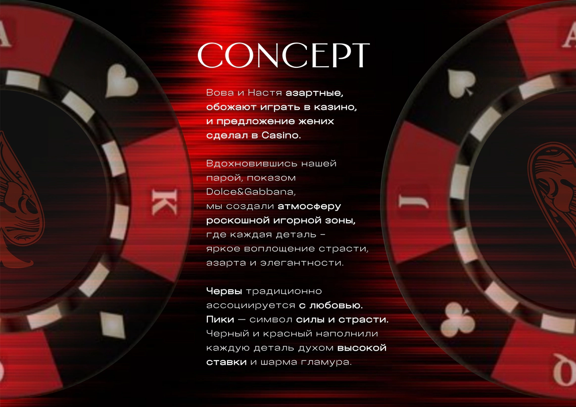 В создании концепции особое место занимает момент, когда жених делает предложение в казино — это кульминационный флер романтики, азартных эмоций и ставки на любовь!