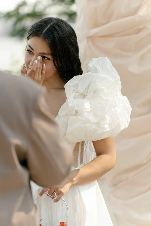 - Для речи невесты была продумана очень личная, камерная сцена: в момент церемонии она вручила жениху наушники, включила звук биения своего сердца и убрала микрофон, продолжив говорить только ему. Мы заранее продумали, как технически реализовать этот момент так, чтобы он остался интимным, но при этом органично вписался в церемонию. Это можно увидеть в видео, очень трогательно вышло.