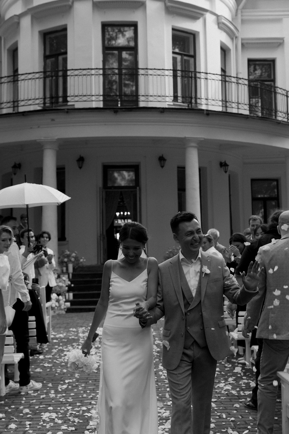Совместно с декораторами продумали флористику: никаких «классических» букетов, только характерные, графичные, интересные формы. Пара приняла эту концепцию сразу — без долгих правок.