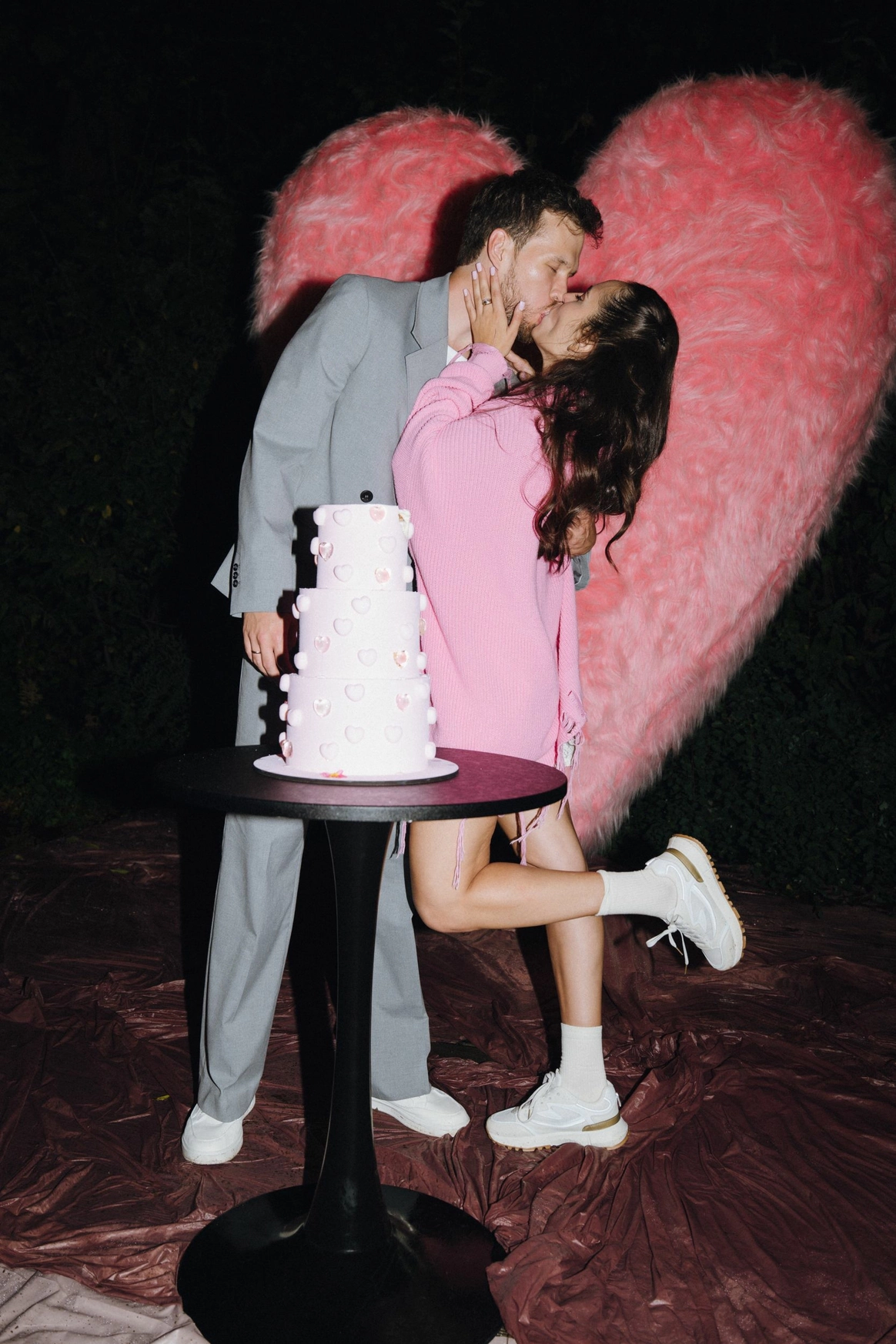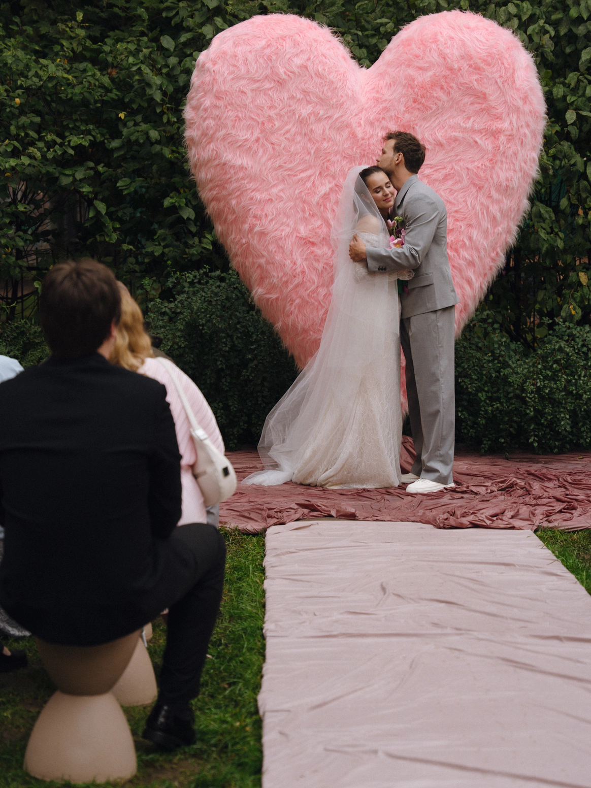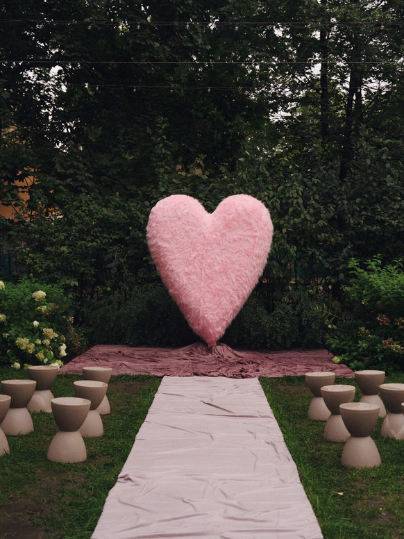 Розовая обсессия - под таким девизом проходила подготовка. Мы решили не мелочиться и завезли огромное пушистое сердце в зону церемонии. Фишка образа невесты - мягкий текстильный букет с вязаными элементами