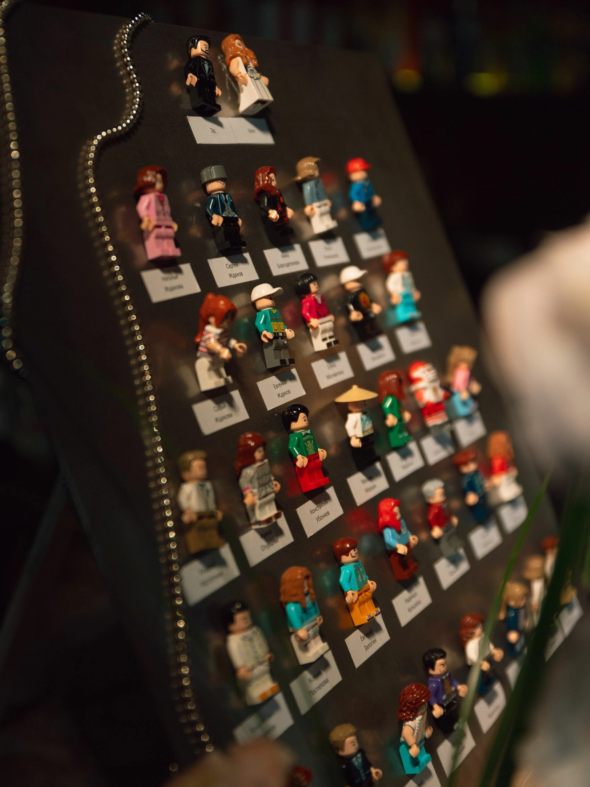 Сочетание классики и брутализма. Декор - это Катя: нежная весенняя флористика и воздушные драпировки. За детали отвечал Эд: фигурки Лего на брутальный железной доске, собранные вручную и план рассадки в стиле технической отрисовки здания (Эд проектирует вентиляции).