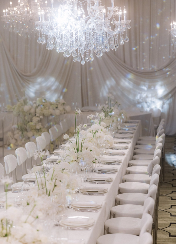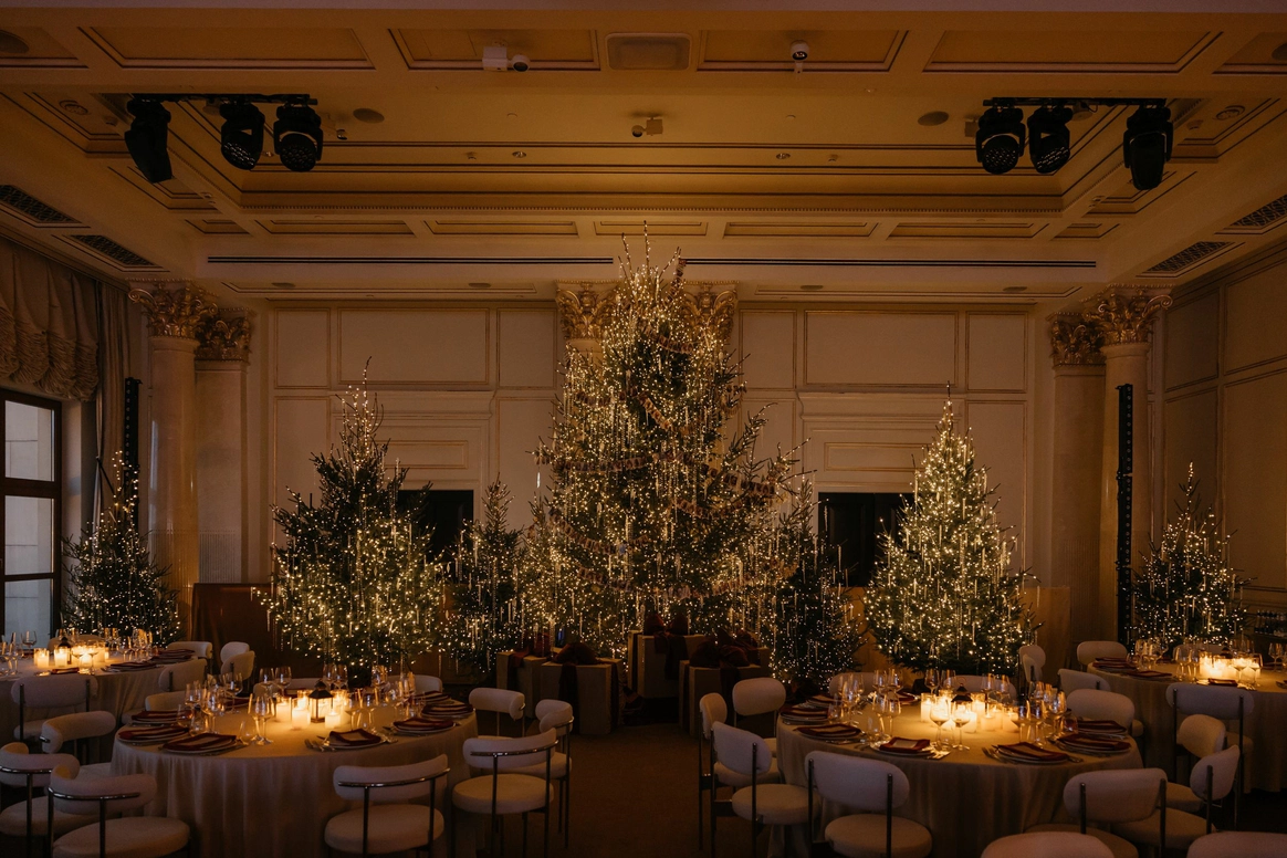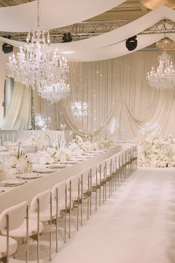 Световая партитура. Работать с тотальным белым (Cloud Dancer) сложнее, чем с цветом. Любая ошибка в освещении делает зал «больничным». Мы выстроили сложную схему света, которая меняла атмосферу зала под каждого артиста, превращая ужин в полноценное шоу.