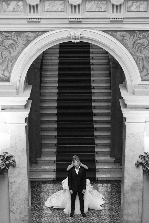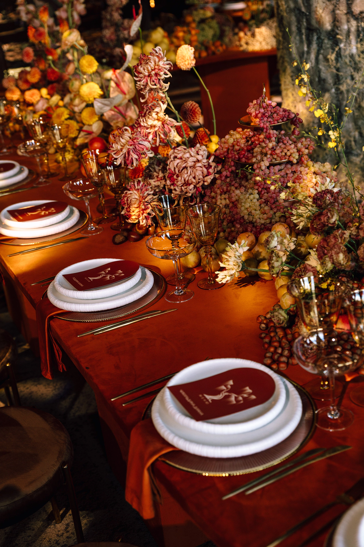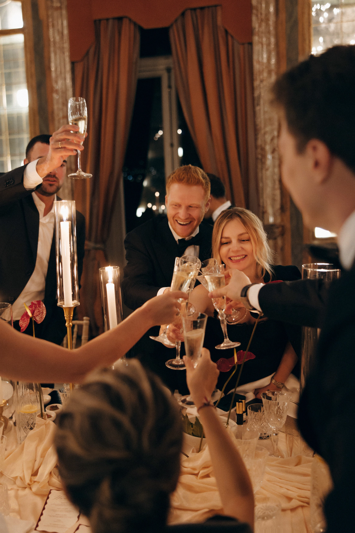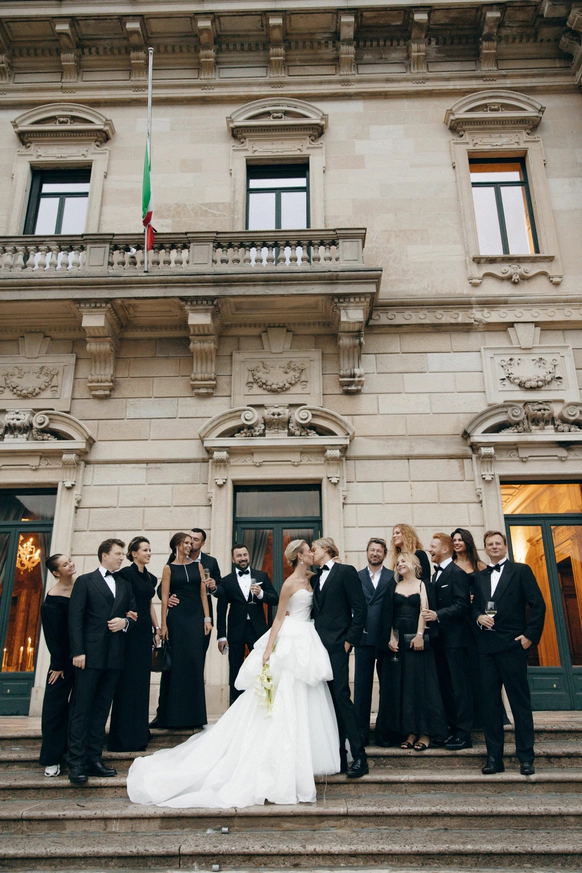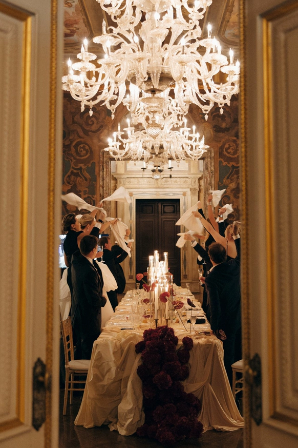 Концепция вдохновлена эстетикой "друзей Оушена" и аристократизмом Виллы Эрба. Строгий Black Tie, кинематографичные отражения в мокрых окнах, глубокие винные оттенки флористики и всего 13 самых близких людей - их личный "синдикат"!