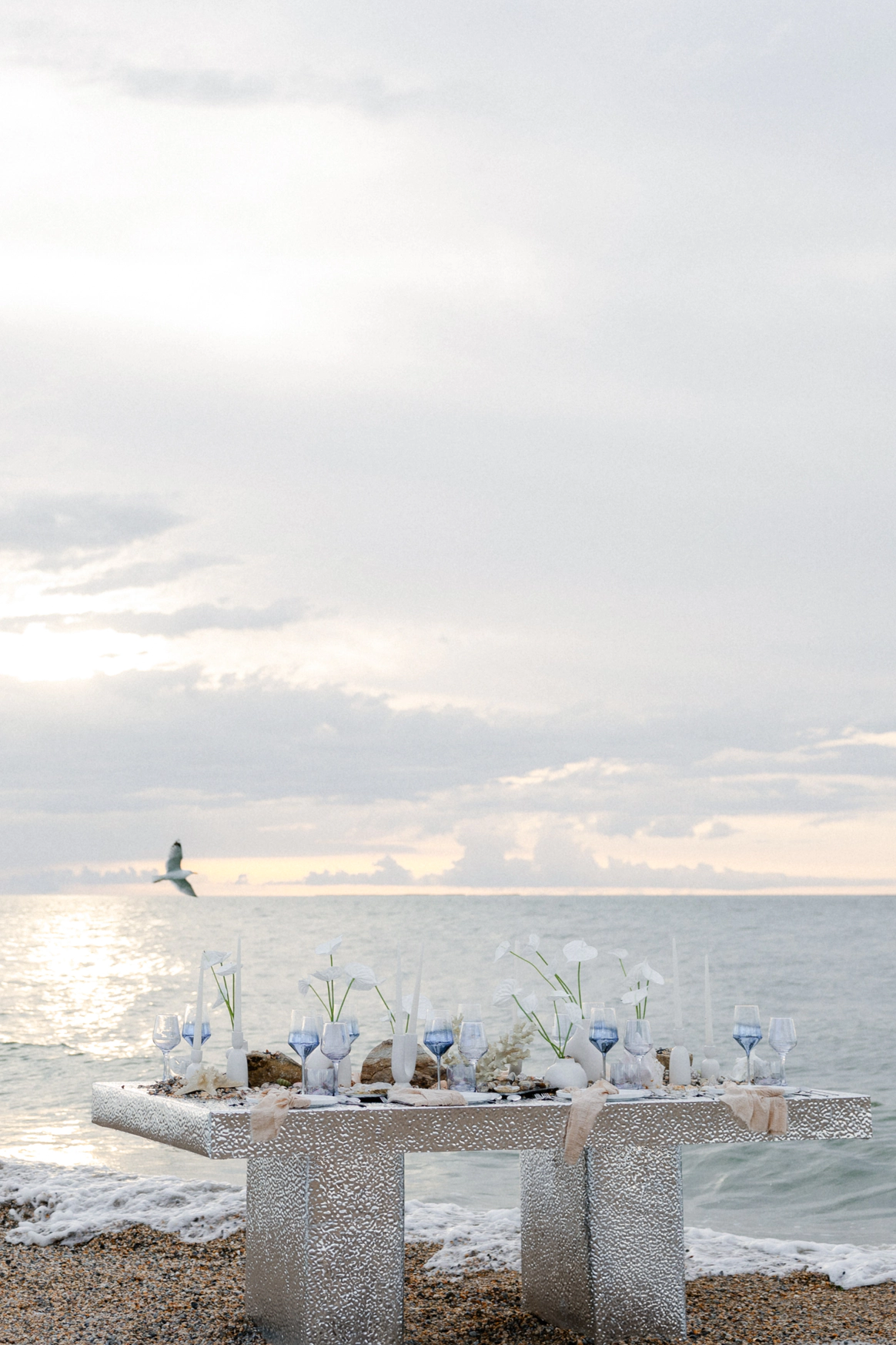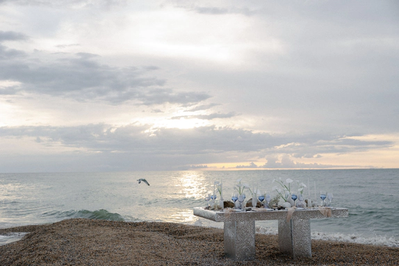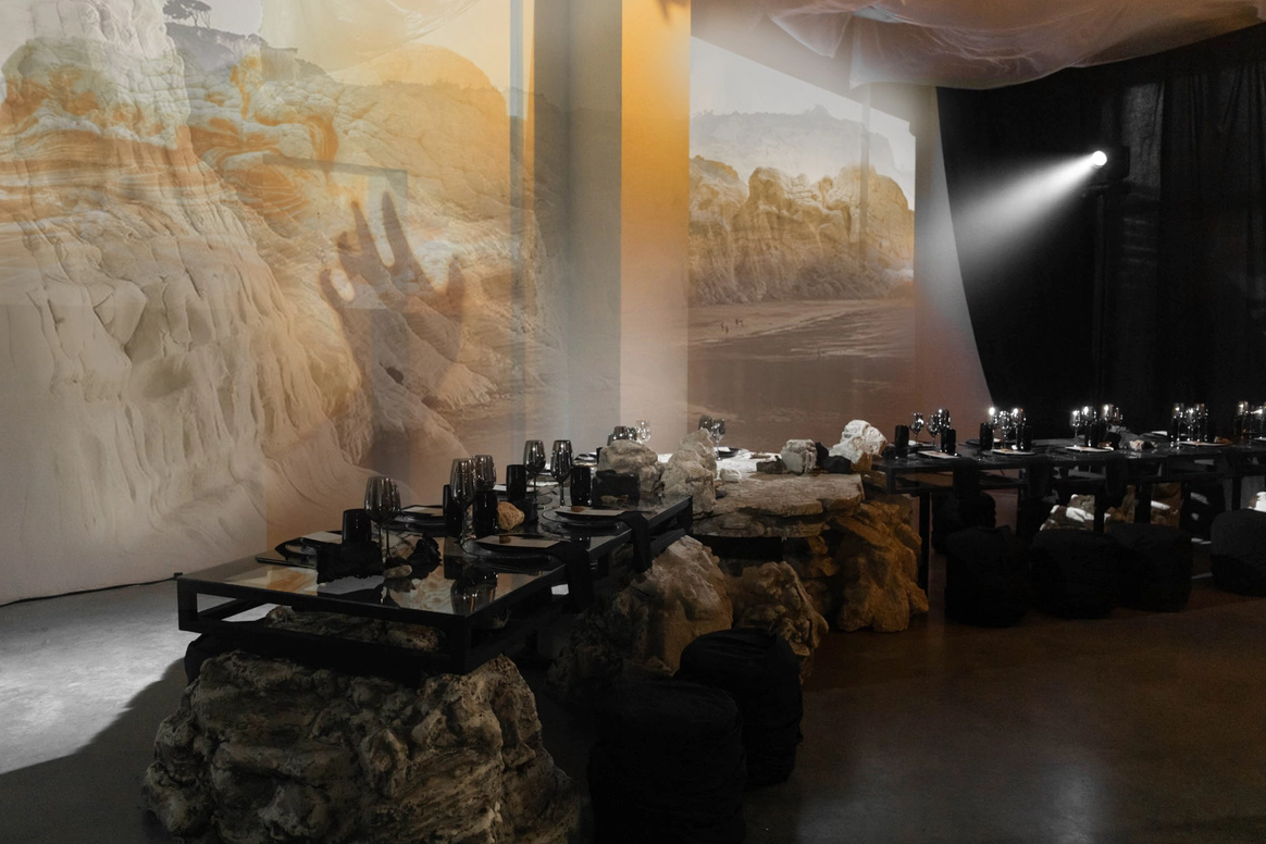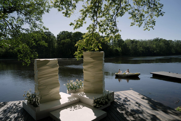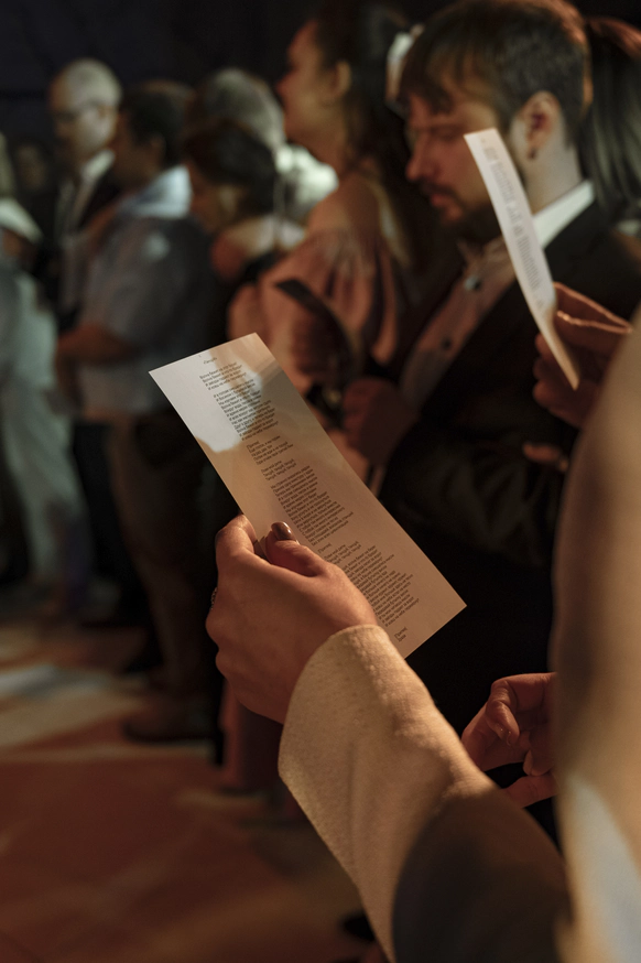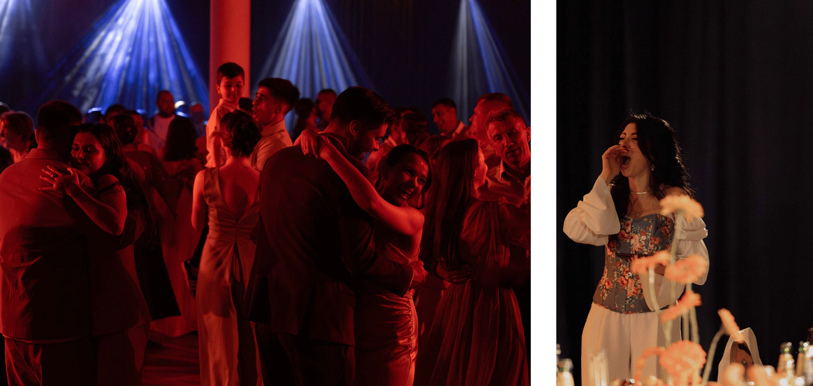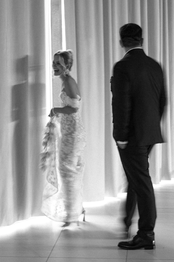 Первоначально планировалась церемония у воды, но ради оптимизации бюджета её перенесли внутрь. После обмена клятвами зона церемонии трансформировалась в президиум, сохранив атмосферу художественной галереи — тёплой, глубокой и чувственной.