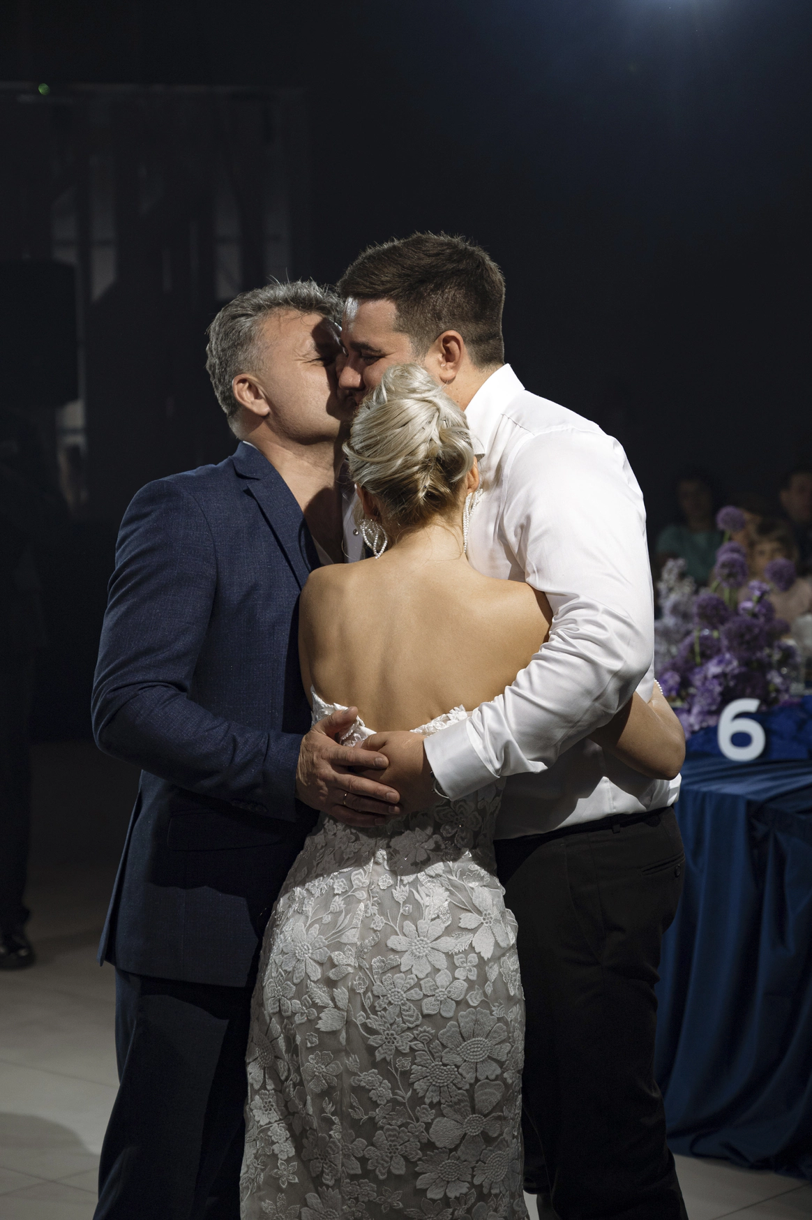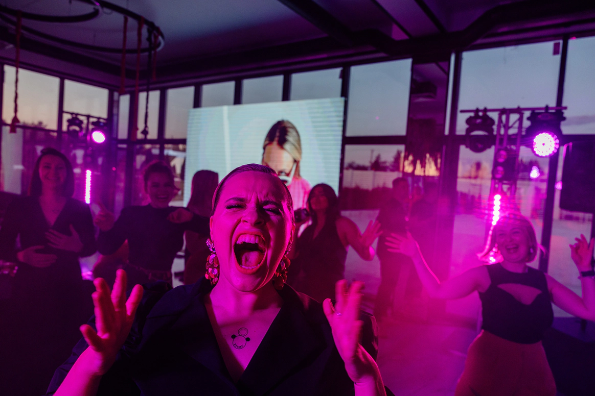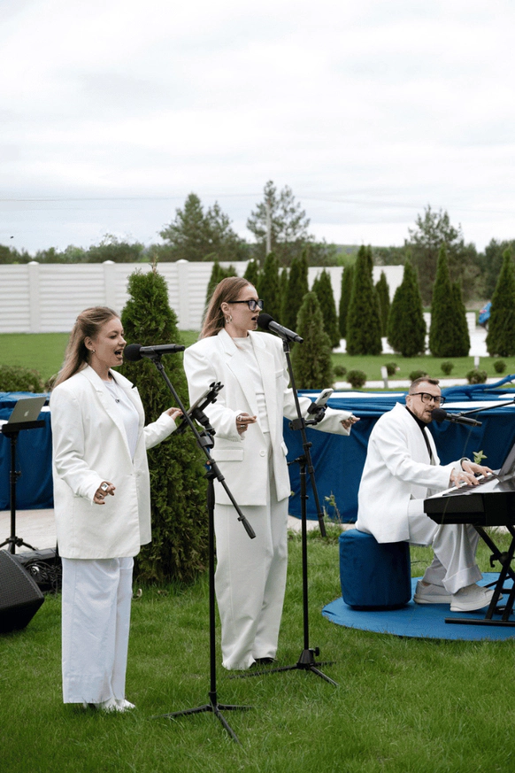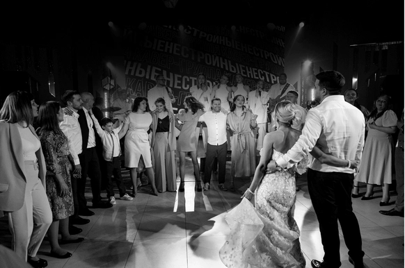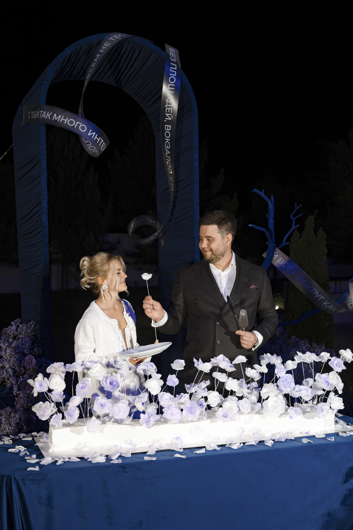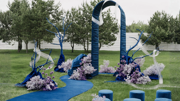 Наша задача была не просто удивить оформлением, а провести гостей через продуманное, наполненное смыслами мероприятие. Синий пейзаж, волнообразная линия пути, сиреневые «облака» флористики, выездной бар с напитками из стран, где уже успели побывать Дима и Юля, запись подкаста с друзьями, — всё работало как части одного маршрута. Гости не только рассматривали детали, но проживали историю пары: много живой музыки, любимые песни, танцы. В финале все встали в круг и вместе с кавер‑группой пели «Танцуй» — момент, когда личный путь Димы и Юли стал общим переживанием для всех.