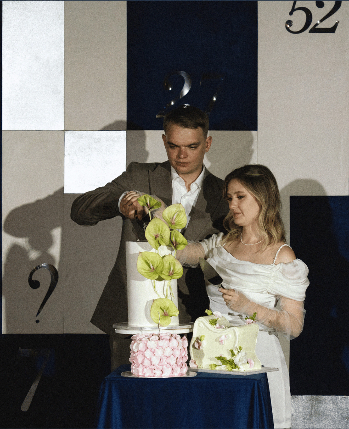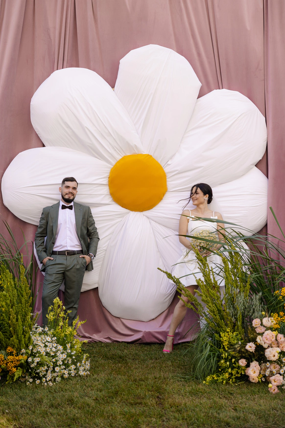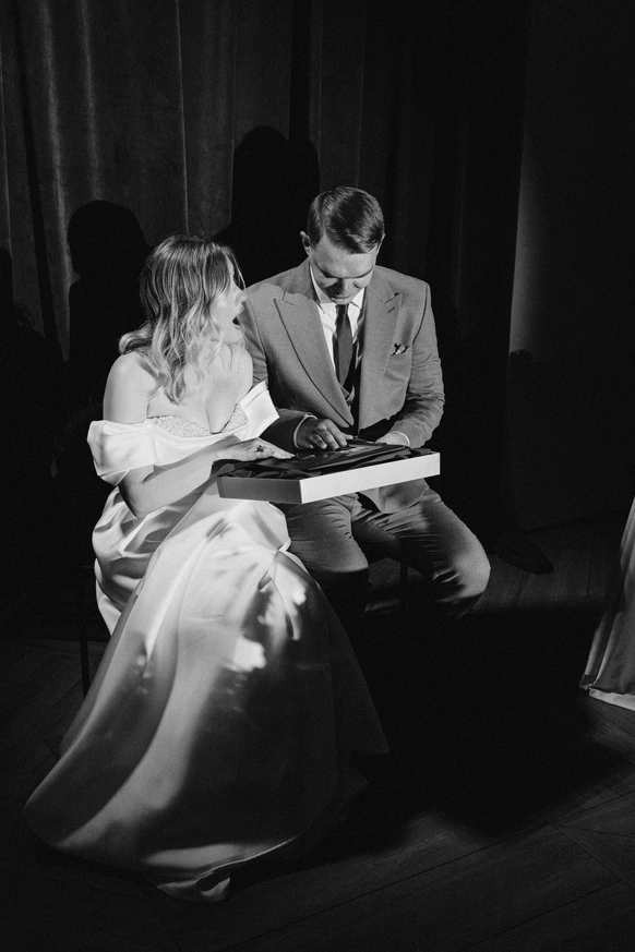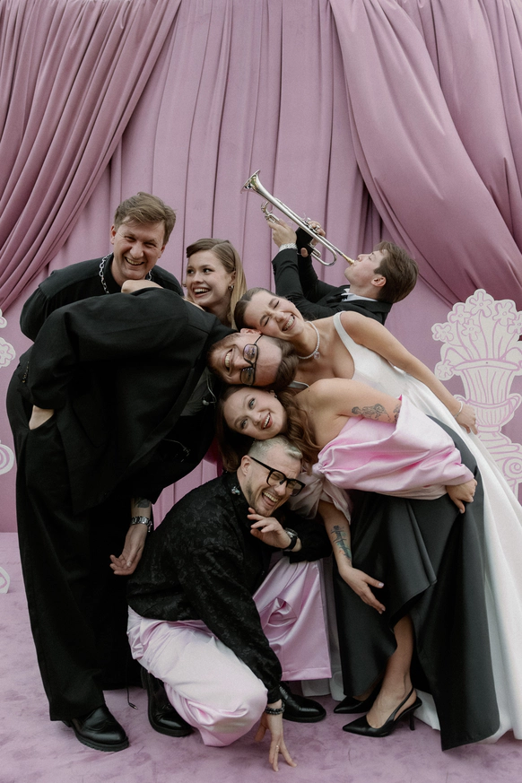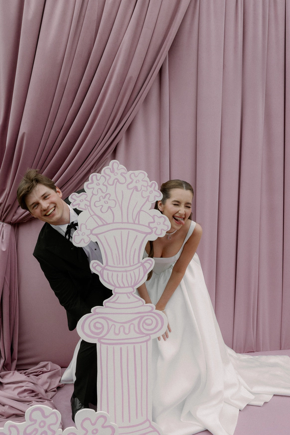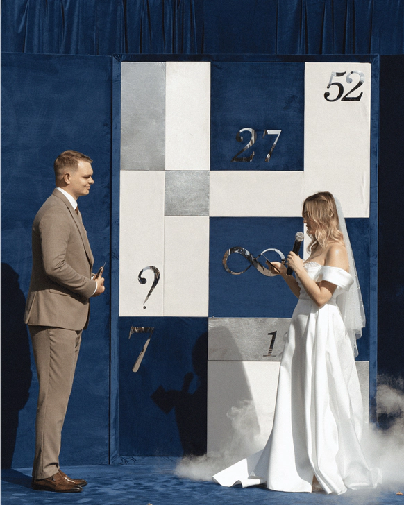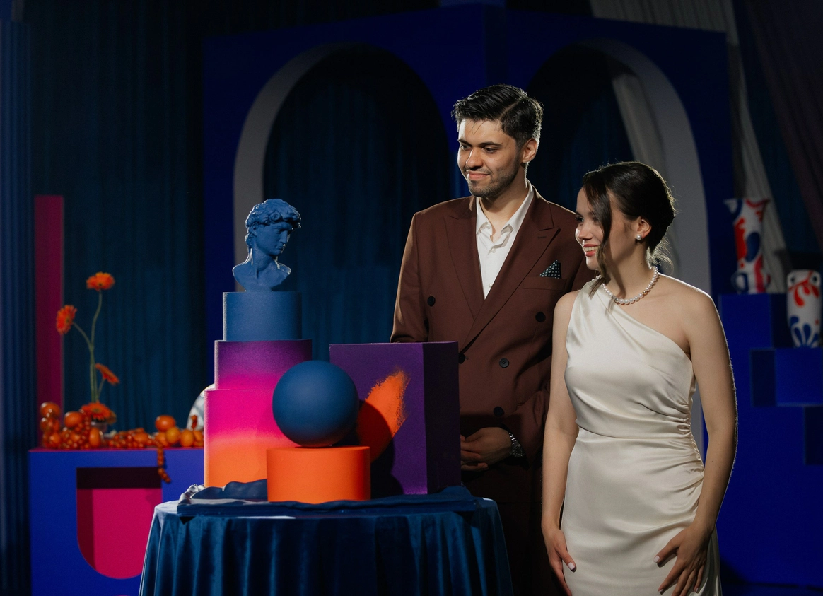 Эта свадьба объединила два разных взгляда на мир — рациональный и творческий. Вахтанг — инженер, для которого важны структура и точность. Аня — выпускница журфака, гуманитарий, работающий в сфере искусства и медиа, влюблённая в сюрреализм и художника Анри Матисса.