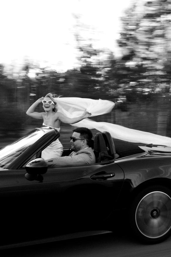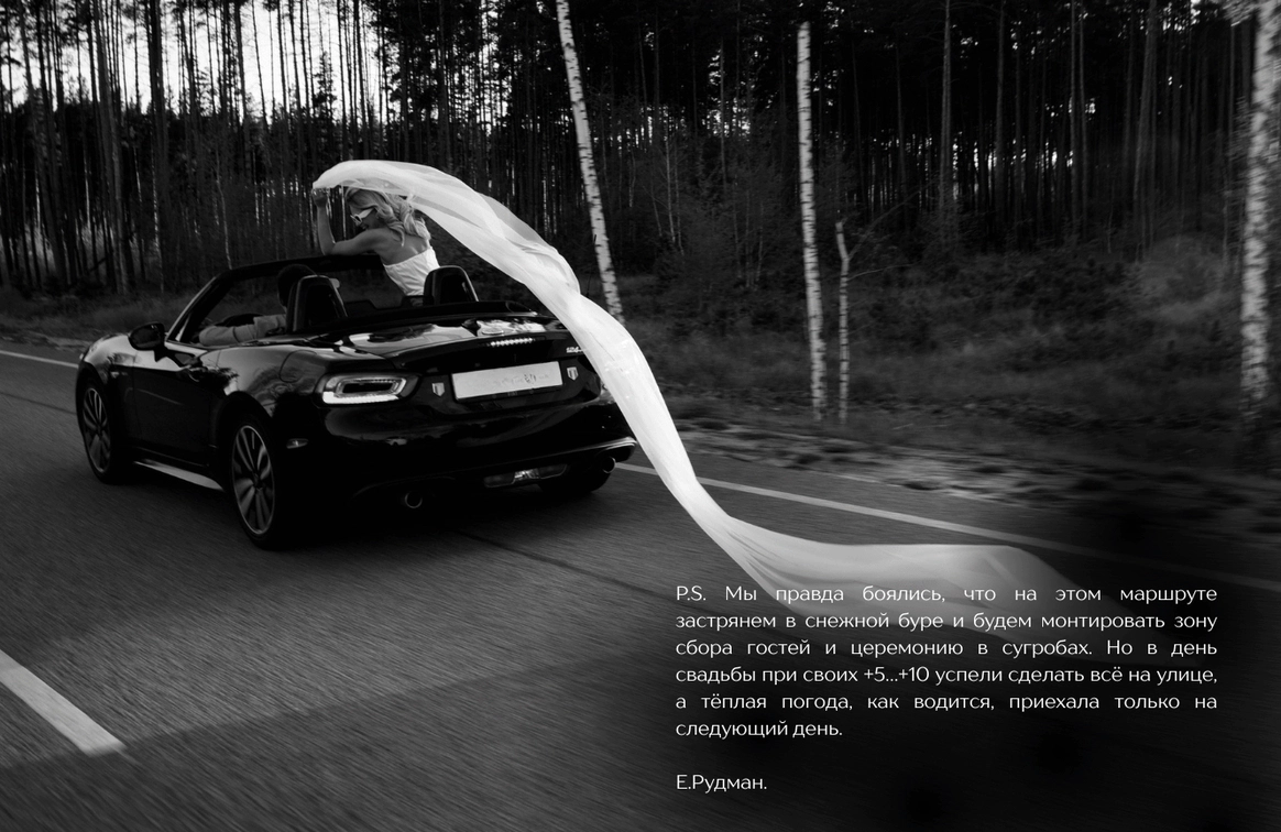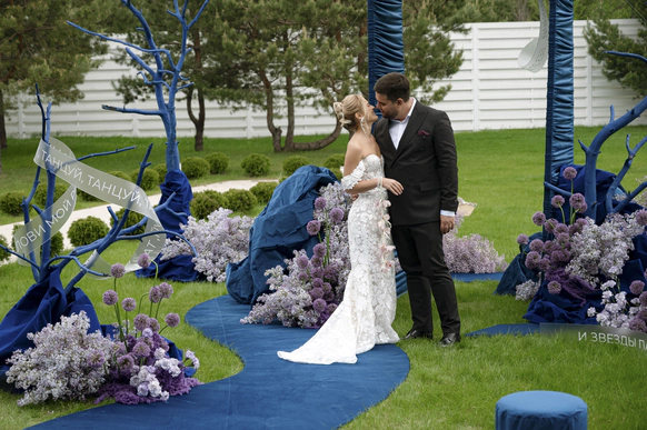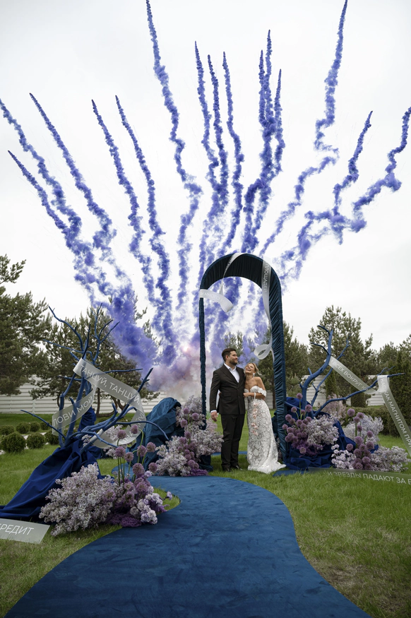 С точки зрения пространства мы фактически «собрали» новый пейзаж: более тысячи веток местной сирени и аллиум создали сиреневые облака, сухостойные деревья до пяти метров очищали и вручную красили в насыщенный синий, велюр формировали в рельеф «гор», а волнообразная дорожка и линия столов превращали зал и лужайку в единый маршрут. Но важен был не только визуал. Мы заранее спланировали стилевую фотосессию в кабриолете с развивающейся фатой по тем самым дорогам, которые легли в основу концепции, подготовили с друзьями пары подкаст‑послание и выстроили музыкальную линию вечера: от живого звука рояля на церемонии в +10 до финального караоке‑круга с «Танцуй».