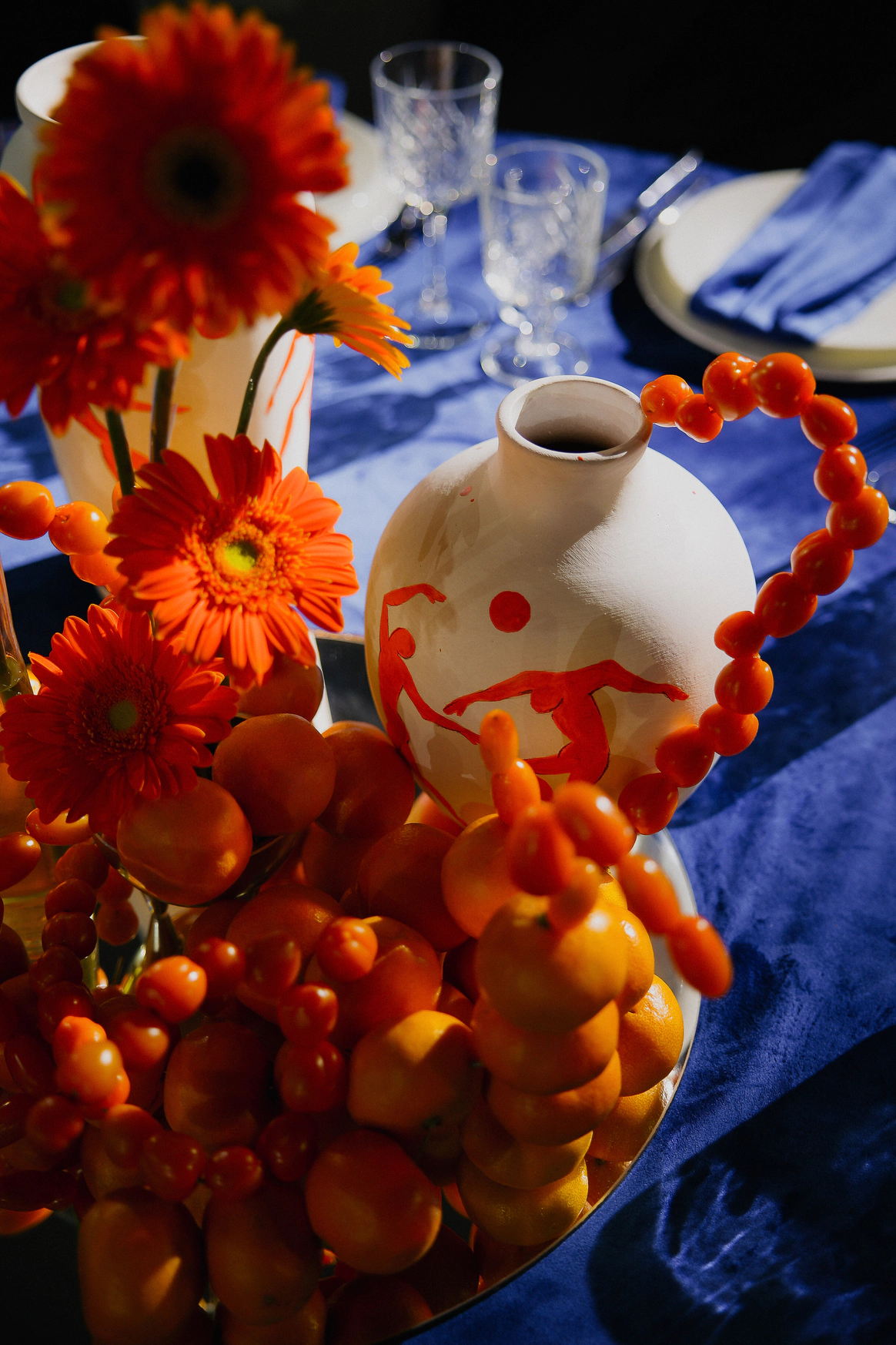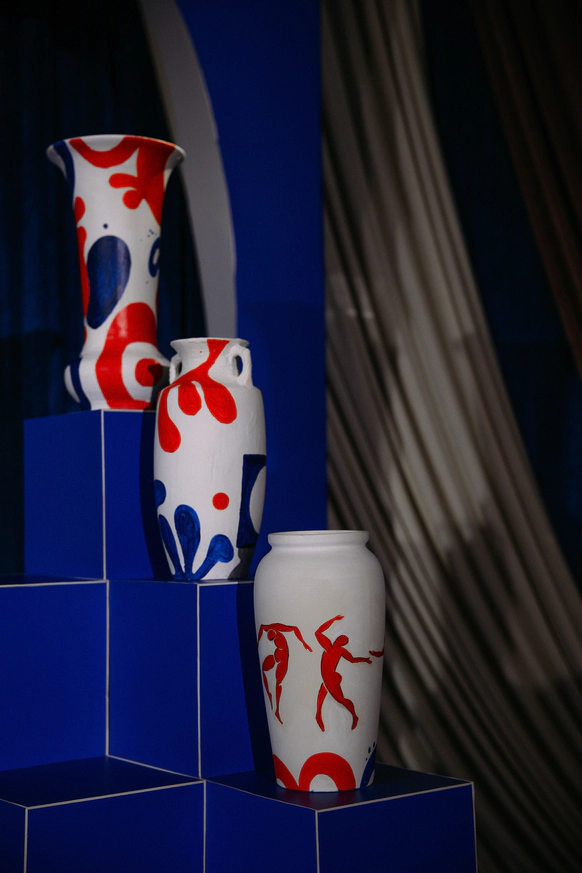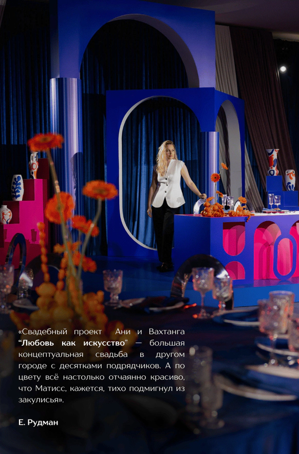«Искусство любить» выделяется тем, что мы работали не только с формой зала, но и с предметной историей пары. Мы дали вторую жизнь керамическим кувшинам, собранным на блошиных рынках, превратив их в арт‑объекты: вазы вручную расписали наши художники‑бутафоры по мотивам живописи Анри Матисса, не копируя оригиналы, а интерпретируя его работу с цветом и плоскостью в рамках концепции свадьбы.