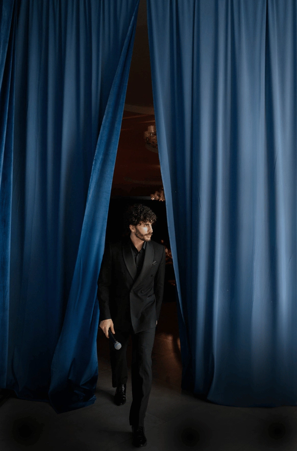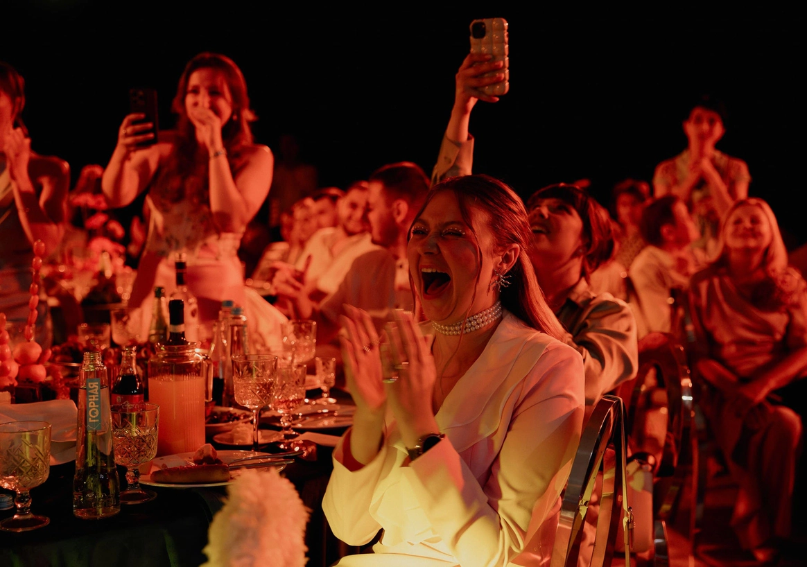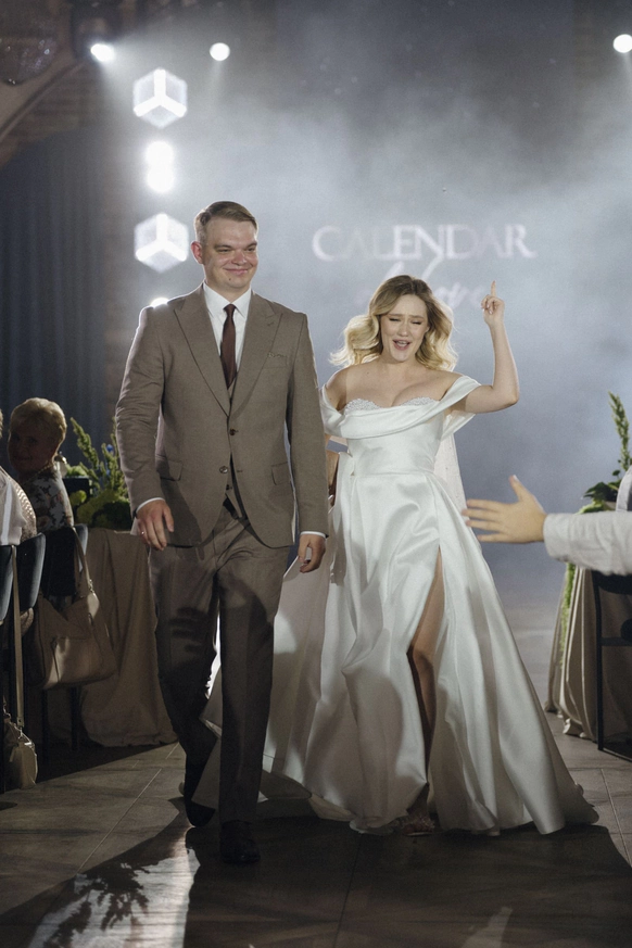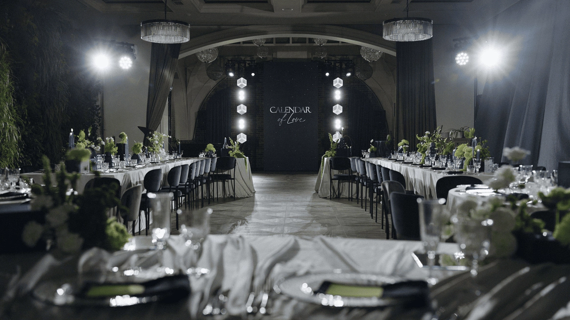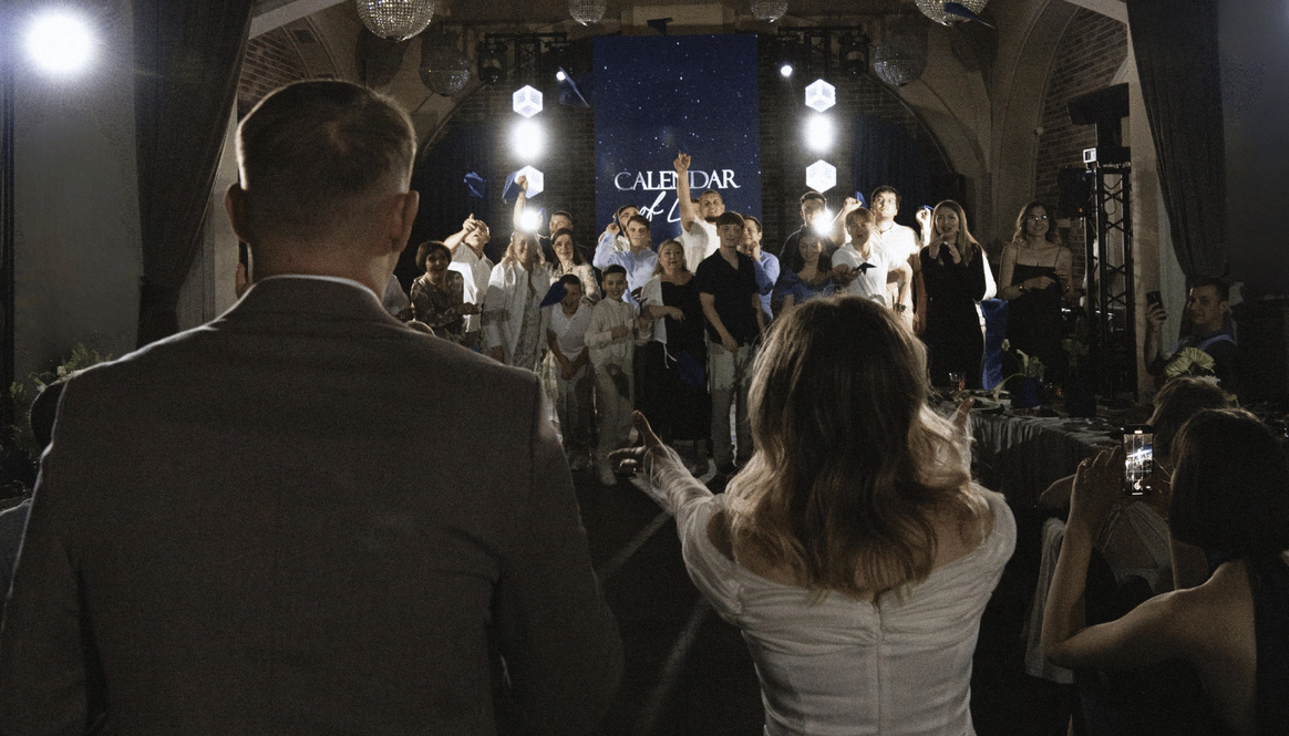 Уникальность проекта заключалась в том, что календарь был не только декорацией церемонии, но интерактивной конструкцией вечера. Сценография строилась на том, что на протяжении всего праздника мы открывали ячейки с цифрами, за которыми скрывались знаковые моменты истории пары. Каждая цифра на календаре — это важная дата их отношений, и вместе с гостями мы расшифровывали, что стоит за этим числом. Артисты и номера были встроены в концепцию: каждый выход привязывался к определённой ячейке и раскрывал её смысл: от показа истории любви до трогательных эпизодов о семьей и финала про будущее пары.