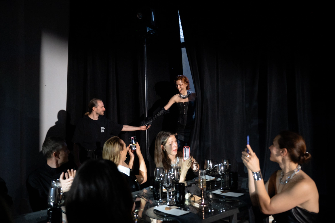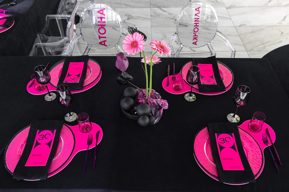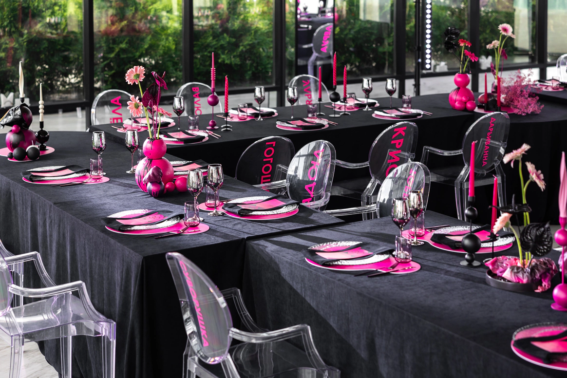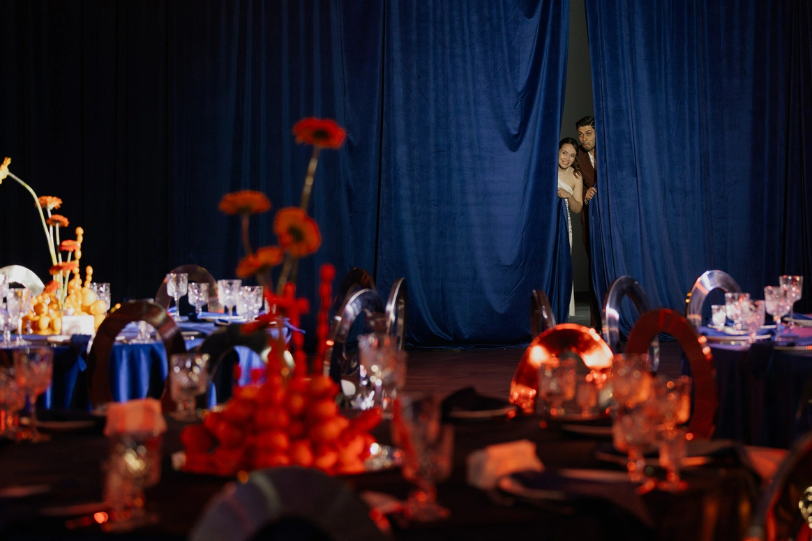 Главной сложностью стал выбор площадки: зал, который выбрали Вахтанг и Аня, оказался слишком просторным и залитым дневным светом, тогда как мы видели событие как тёмную камерную галерею, где цвет и форма передают эмоцию. Цель: создать смелое пространство и событие, где форма, цвет и драматургия дня работают как единое произведение искусства. Мы сократили объём зала и «успокоили» свет, добившись минимализма с характером и внутренней силой — в декоре, сценарии и атмосфере всего мероприятия.