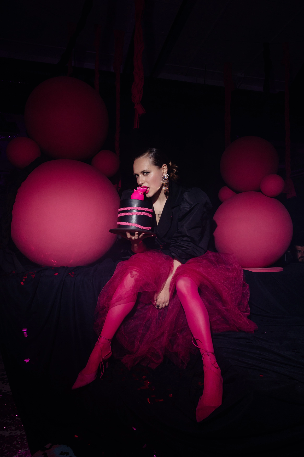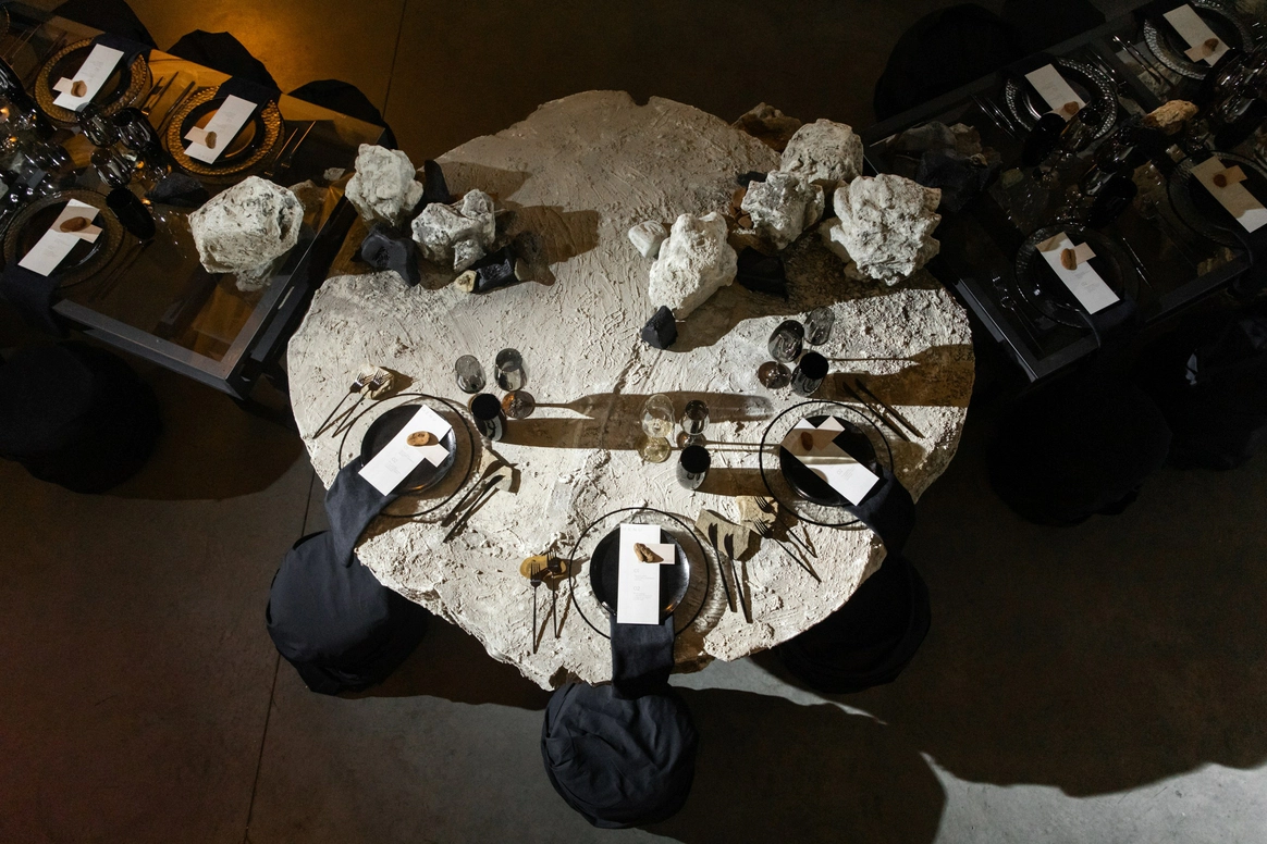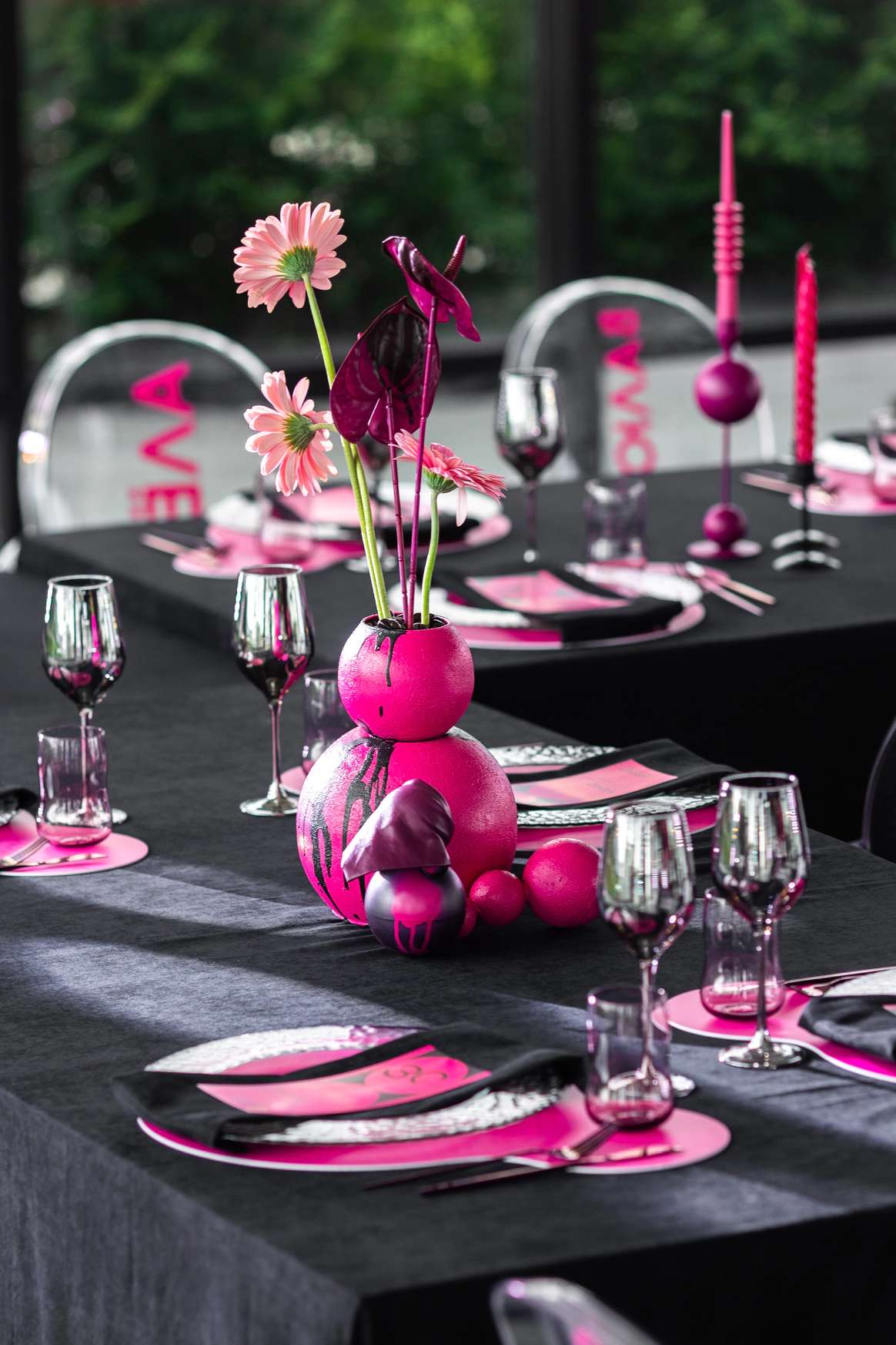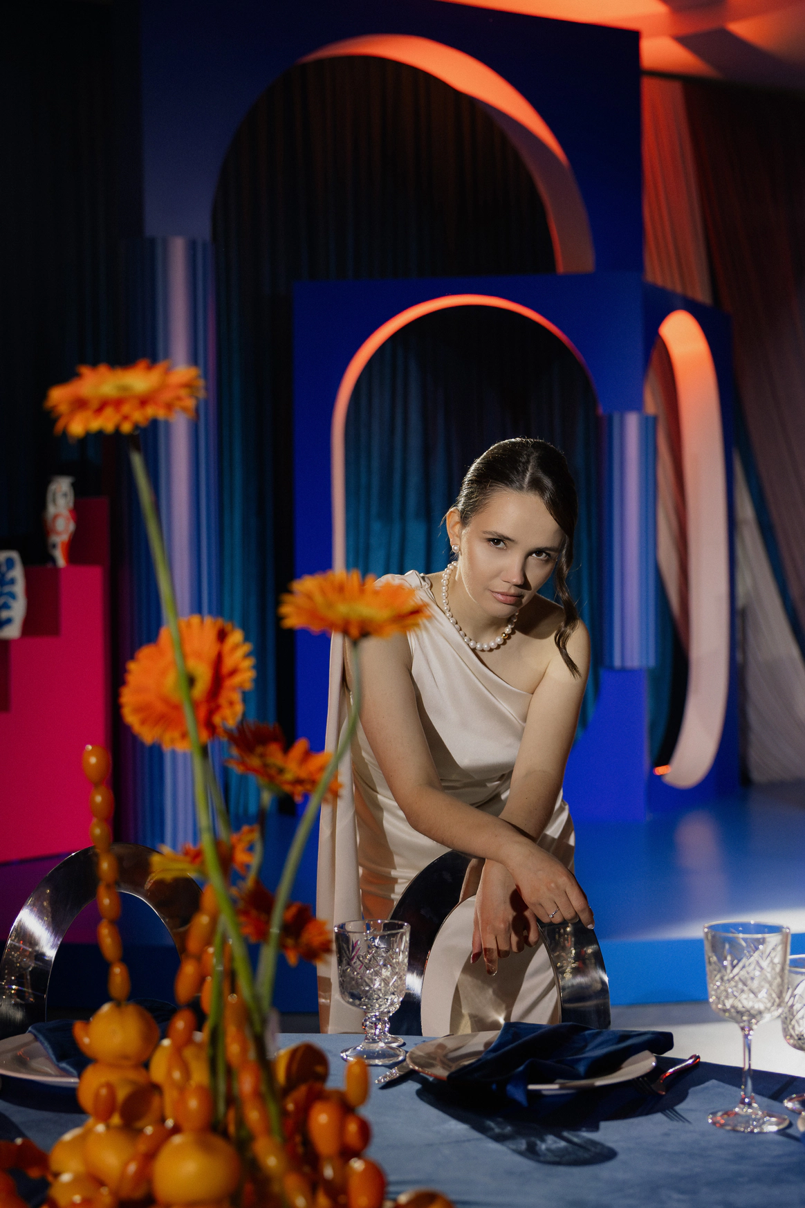 Главной сложностью стал выбор площадки: зал, который выбрали Вахтанг и Аня, оказался слишком просторным и залитым дневным светом, тогда как мы видели событие как тёмную камерную галерею, где цвет и форма передают эмоцию. Цель: создать смелое пространство и событие, где форма, цвет и драматургия дня работают как единое произведение искусства. Мы сократили объём зала и «успокоили» свет, добившись минимализма с характером и внутренней силой — в декоре, сценарии и атмосфере всего мероприятия.