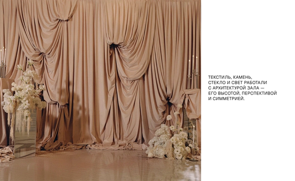 Геометрия столов задала чёткий периметр и усилила перспективу, вертикальный текстиль подчеркнул высоту и ритм, камень добавил материальность, стекло и акрил - глубину и свет.