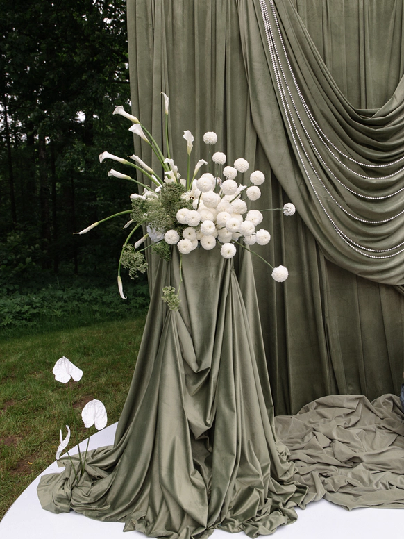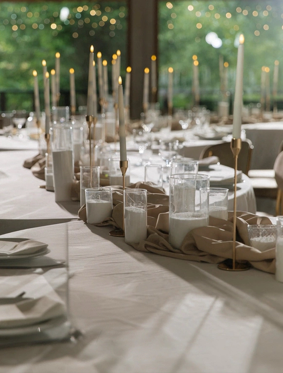 Композиция строится на балансе природной пластики и архитектурной чёткости. Текстиль добавляет мягкость, зелень глубину, стекло и свечи усиливают свет.