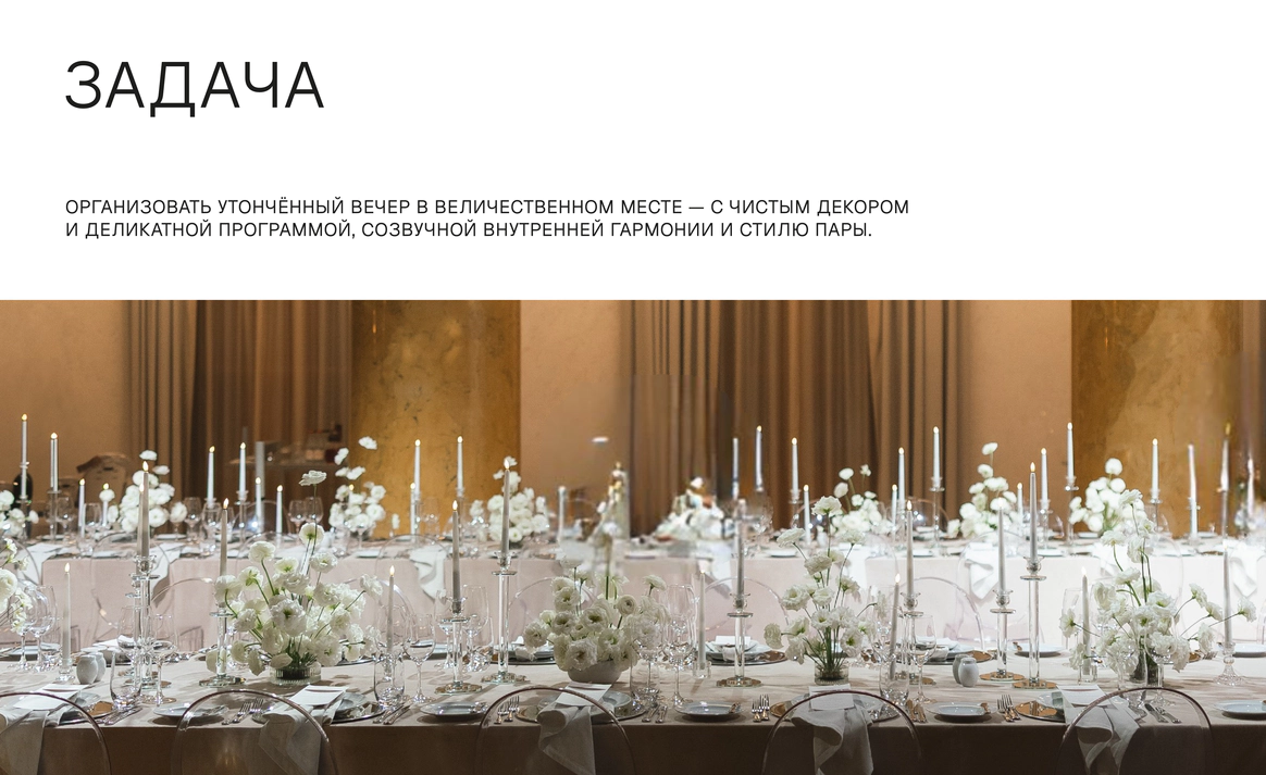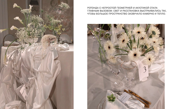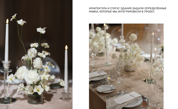 Концепция раскрылась в формате аристократичного ужина, спокойного вечера в историческом интерьере. Лёгкий декор, мягкий свет и тактильные фактуры сохранили характер зала и добавили уюта.