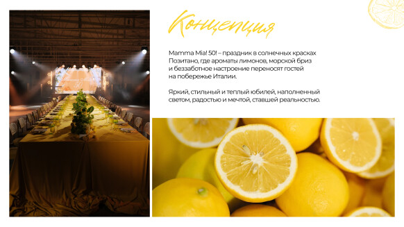 Mamma Mia! 50! – это праздник, наполненный итальянским колоритом, вдохновленный атмосферой солнечного Позитано. Юбилей станет воплощением несостоявшегося свадебного путешествия в Италию, превращая мечту в реальность через декор, эмоции и эстетику праздника.