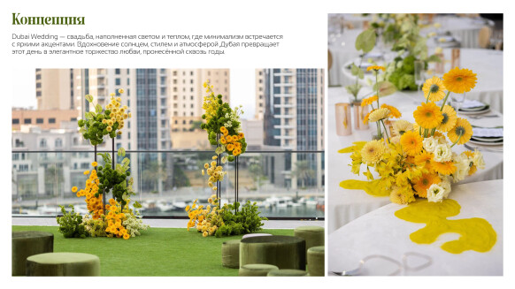 Элегантное воплощение любви, пронесённой сквозь годы. Вдохновлённая солнечной атмосферой Дубая,свадьба наполнена светом, стилем и теплотой семейного единения.