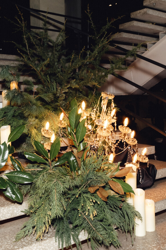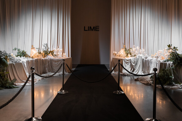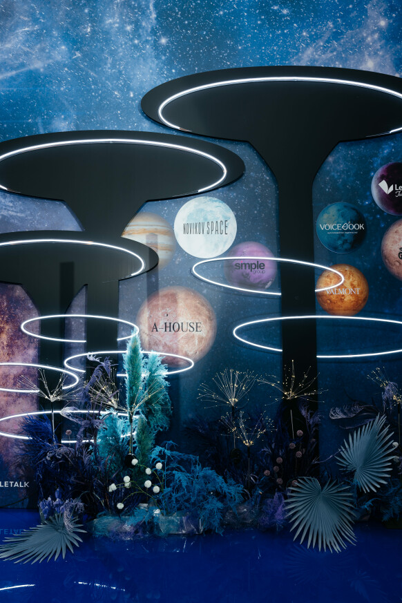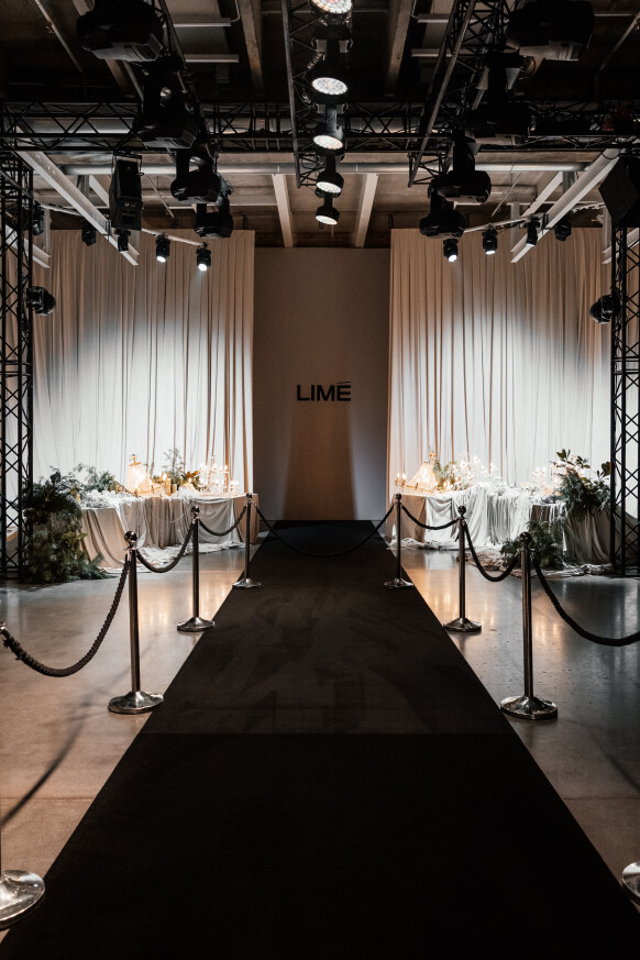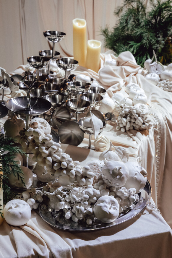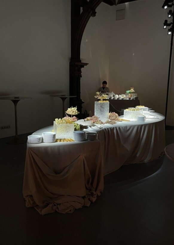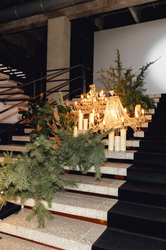 Фотозона и одновременно декор для показа - это единая линия драпировки стены переходящая в скатерть фуршетного стола с люстрами и гипсовыми фруктами, разбитой пирамидой из элегантных креманок и хвойными композициями. Лестница, как вторая фотозона с люстрами прямо на лестнице и хвойными композициями, черной люксовой дорожкой, подчеркивающей важность момента. Сцену украшает подвесной логотип и драпировка из черного микровелюра.