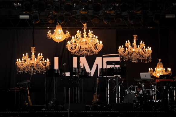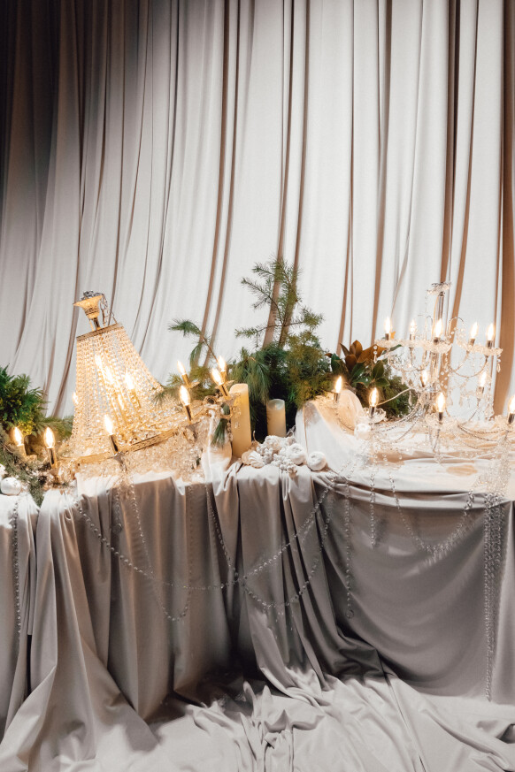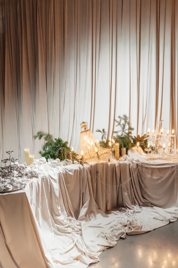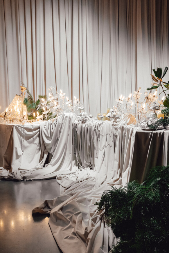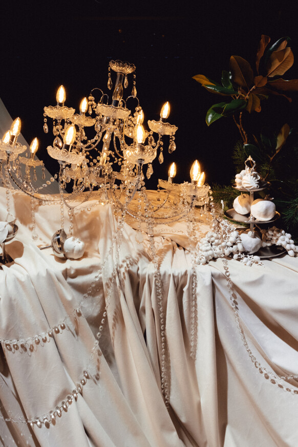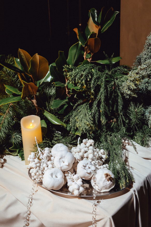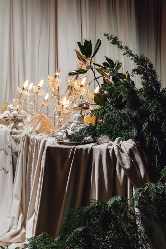 Фотозона и одновременно декор для показа - это единая линия драпировки стены переходящая в скатерть фуршетного стола с люстрами и гипсовыми фруктами, разбитой пирамидой из элегантных креманок и хвойными композициями. Лестница, как вторая фотозона с люстрами прямо на лестнице и хвойными композициями, черной люксовой дорожкой, подчеркивающей важность момента. Сцену украшает подвесной логотип и драпировка из черного микровелюра.